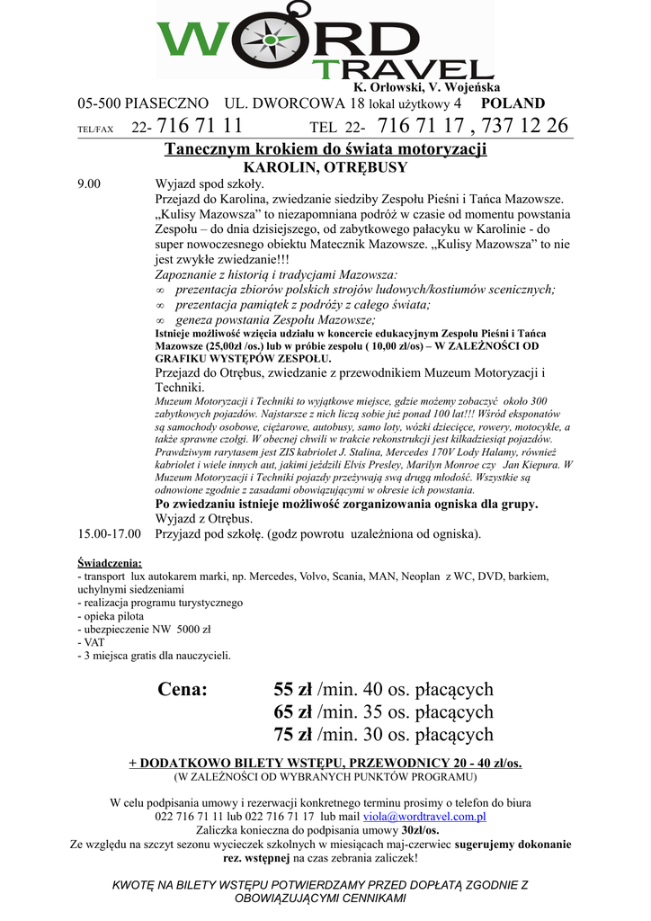 05-500 PIASECZNO TEL/FAX 22- 716 K. Orłowski, V. Wojeńska UL. DWORCOWA 18 lokal użytkowy 4 POLAND 71 11 TEL 22- 716 71 17 , 737 12 26 Tanecznym krokiem do świata motoryzacji KAROLIN, OTRĘBUSY 9.00 Wyjazd spod szkoły. Przejazd do Karolina, zwiedzanie siedziby Zespołu Pieśni i Tańca Mazowsze. „Kulisy Mazowsza” to niezapomniana podróż w czasie od momentu powstania Zespołu – do dnia dzisiejszego, od zabytkowego pałacyku w Karolinie - do super nowoczesnego obiektu Matecznik Mazowsze. „Kulisy Mazowsza” to nie jest zwykłe zwiedzanie!!! Zapoznanie z historią i tradycjami Mazowsza: • prezentacja zbiorów polskich strojów ludowych/kostiumów scenicznych; • prezentacja pamiątek z podróży z całego świata; • geneza powstania Zespołu Mazowsze; Istnieje możliwość wzięcia udziału w koncercie edukacyjnym Zespołu Pieśni i Tańca Mazowsze (25,00zł /os.) lub w próbie zespołu ( 10,00 zł/os) – W ZALEŻNOŚCI OD GRAFIKU WYSTĘPÓW ZESPOŁU. Przejazd do Otrębus, zwiedzanie z przewodnikiem Muzeum Motoryzacji i Techniki. Muzeum Motoryzacji i Techniki to wyjątkowe miejsce, gdzie możemy zobaczyć około 300 zabytkowych pojazdów. Najstarsze z nich liczą sobie już ponad 100 lat!!! Wśród eksponatów są samochody osobowe, ciężarowe, autobusy, samo loty, wózki dziecięce, rowery, motocykle, a także sprawne czołgi. W obecnej chwili w trakcie rekonstrukcji jest kilkadziesiąt pojazdów. Prawdziwym rarytasem jest ZIS kabriolet J. Stalina, Mercedes 170V Lody Halamy, również kabriolet i wiele innych aut, jakimi jeździli Elvis Presley, Marilyn Monroe czy Jan Kiepura. W Muzeum Motoryzacji i Techniki pojazdy przeżywają swą drugą młodość. Wszystkie są odnowione zgodnie z zasadami obowiązującymi w okresie ich powstania. 15.00-17.00 Po zwiedzaniu istnieje możliwość zorganizowania ogniska dla grupy. Wyjazd z Otrębus. Przyjazd pod szkołę. (godz powrotu uzależniona od ogniska). Świadczenia: - transport lux autokarem marki, np. Mercedes, Volvo, Scania, MAN, Neoplan z WC, DVD, barkiem, uchylnymi siedzeniami - realizacja programu turystycznego - opieka pilota - ubezpieczenie NW 5000 zł - VAT - 3 miejsca gratis dla nauczycieli. Cena: 55 zł /min. 40 os. płacących 65 zł /min. 35 os. płacących 75 zł /min. 30 os. płacących + DODATKOWO BILETY WSTĘPU, PRZEWODNICY 20 - 40 zł/os. (W ZALEŻNOŚCI OD WYBRANYCH PUNKTÓW PROGRAMU) W celu podpisania umowy i rezerwacji konkretnego terminu prosimy o telefon do biura 022 716 71 11 lub 022 716 71 17 lub mail [email protected] Zaliczka konieczna do podpisania umowy 30zł/os. Ze względu na szczyt sezonu wycieczek szkolnych w miesiącach maj-czerwiec sugerujemy dokonanie rez. wstępnej na czas zebrania zaliczek! KWOTĘ NA BILETY WSTĘPU POTWIERDZAMY PRZED DOPŁATĄ ZGODNIE Z OBOWIĄZUJĄCYMI CENNIKAMI