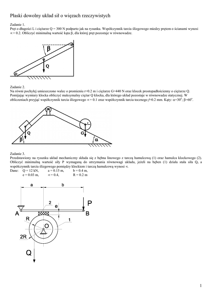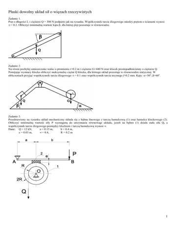 Płaski dowolny układ sił o więzach rzeczywistych Zadanie 1. Pręt o długości L i ciężarze Q = 300 N podparto jak na rysunku. Współczynnik tarcia ślizgowego miedzy prętem o ścianami wynosi µ = 0.2. Obliczyć minimalną wartość kąta β, dla której pręt pozostaje w równowadze. Zadanie 2. Na równi pochyłej umieszczono walec o promieniu r=0.2 m i ciężarze G=440 N oraz klocek prostopadłościenny o ciężarze Q. Pomijając wymiary klocka obliczyć maksymalny ciężar Q klocka, dla którego układ pozostaje w równowadze statycznej. W obliczeniach przyjąć współczynnik tarcia ślizgowego µ = 0.1 oraz współczynnik tarcia tocznego f=0.2 mm. Kąty: α=30o; β=60o. Zadanie 3. Przedstawiony na rysunku układ mechaniczny składa się z bębna linowego z tarczą hamulcową (1) oraz hamulca klockowego (2). Obliczyć minimalną wartość siły P wymaganą do utrzymania równowagi układu, jeżeli na bęben (1) działa stała siła Q, a współczynnik tarcia ślizgowego pomiędzy klockiem i tarczą hamulcową wynosi µ. Dane: Q = 12 kN, a = 0.15 m, b = 0.4 m, e = 0.03 m, µ = 0.4, R = 0.2 m 1 Płaski dowolny układ sił o więzach rzeczywistych Zadanie 4. Przedstawiony na rysunku układ mechaniczny składa się z bębna linowego z tarczą hamulcową (1) oraz hamulca klockowego (2). Obliczyć minimalną wartość siły P wymaganą do utrzymania równowagi układu, jeżeli na bęben (1) działa stały moment sił M, a współczynnik tarcia ślizgowego pomiędzy klockiem i tarczą hamulcową wynosi µ. Dane: M = 4 kNm, L = 0.25 m, e = 0.02 m, µ = 0.5, R = 0.2 m Zadanie 5. Przedstawiony na rysunku układ mechaniczny składa się z bębna linowego z tarczą hamulcową (1) oraz hamulca klockowego (2). Obliczyć minimalną wartość siły P wymaganą do utrzymania równowagi układu, jeżeli na bęben (1) działa stały moment sił M, a współczynnik tarcia ślizgowego pomiędzy klockiem i tarczą hamulcową wynosi µ. Dane: M = 6 kNm, L = 0.25 m, e = 0.05 m, µ = 0.35, R = 0.2 m 2