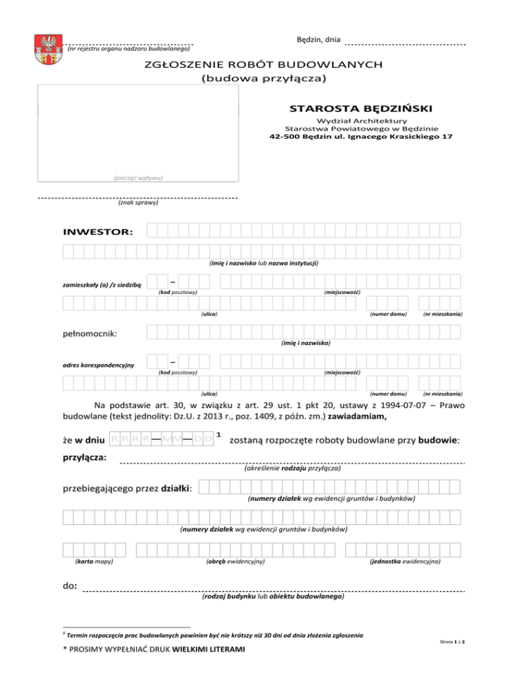 Będzin, dnia (nr rejestru organu nadzoru budowlanego) ZGŁOSZENIE ROBÓT BUDOWLANYCH (budowa przyłącza) STAROSTA BĘDZIŃSKI Wydział Architektury Starostwa Powiatowego w Będzinie 42-500 Będzin ul. Ignacego Krasickiego 17 (pieczęć wpływu) (znak sprawy) INWESTOR: (imię i nazwisko lub nazwa instytucji) zamieszkały (a) /z siedzibą (kod pocztowy) (miejscowość) (ulica) (numer domu) (nr mieszkania) (numer domu) (nr mieszkania) pełnomocnik: (imię i nazwisko) adres korespondencyjny (kod pocztowy) (miejscowość) (ulica) Na podstawie art. 30, w związku z art. 29 ust. 1 pkt 20, ustawy z 1994-07-07 – Prawo budowlane (tekst jednolity: Dz.U. z 2013 r., poz. 1409, z późn. zm.) zawiadamiam, że w dniu R R R R – MM– D D 1 zostaną rozpoczęte roboty budowlane przy budowie: przyłącza: (określenie rodzaju przyłącza) przebiegającego przez działki: (numery działek wg ewidencji gruntów i budynków) (numery działek wg ewidencji gruntów i budynków) (karta mapy) (obręb ewidencyjny) (jednostka ewidencyjna) do: (rodzaj budynku lub obiektu budowlanego) 1 Termin rozpoczęcia prac budowlanych powinien być nie krótszy niż 30 dni od dnia złożenia zgłoszenia Strona 1 z 2 * PROSIMY WYPEŁNIAĆ DRUK WIELKIMI LITERAMI adres inwestycji: (miejscowość) (nr posesji) (ulica) 2 Do wniosku dołączam : 1) projekt zagospodarowania działki lub terenu wraz z3: a) opiniami, uzgodnieniami, pozwoleniami i innymi dokumentami wymaganymi przepisami szczególnymi, w tym, stosownie do potrzeb: oświadczenie o zapewnieniu dostawy energii elektrycznej i warunki przyłączenia obiektu do sieci elektroenergetycznej, oświadczenie o zapewnieniu dostawy wody pitnej i warunki przyłączenia obiektu do sieci wodociągowej, oświadczenie o zapewnieniu odbioru ścieków i warunki przyłączenia obiektu do sieci kanalizacyjnej, oświadczenie o zapewnieniu dostawy gazu i warunki przyłączenia obiektu do sieci gazowej, oświadczenie o zapewnieniu dostawy ciepła i warunki przyłączenia obiektu do sieci cieplnej, warunki przyłączenia obiektu do sieci telekomunikacyjnej, b) opisem technicznym instalacji, c) oświadczeniem projektanta o sporządzeniu projektu budowlanego zgodnie z obowiązującymi przepisami oraz zasadami wiedzy technicznej, o którym mowa w art. 20 ust. 4 ustawy – Prawo budowlane, projekt winien być uzgodniony przez rzeczoznawców i organy wymagane obowiązującymi przepisami, 2) kserokopię uprawnień projektanta i kserokopię zaświadczenia o przynależności do właściwej izby zawodowej, aktualnego na dzień opracowania projektu, oświadczenie o posiadanym prawie do dysponowania nieruchomością na cele budowlane, a) odpis z Rejestru Przedsiębiorców Krajowego Rejestru Sądowego określający osoby uprawnione do reprezentacji podmiotu (w przypadku, gdy inwestorem jest osoba prawna), b) zaświadczenie o wpisie do ewidencji działalności gospodarczej (w przypadku prowadzenia takiej działalności), 3) 4) kopię aktualnej mapy obejmującej granice własności oraz zabudowania i uzbrojenie terenu – z zaznaczeniem lokalizacji obiektu, (np. kolorowy wydruk mapy z geoportalu – ogólnodostępnego na stronie internetowej http://geo.powiat.bedzin.pl lub kopie aktualnych map: zasadniczej i ewidencyjnej z państwowego zasobu geodezyjnego i kartograficznego bądź kopię aktualnej mapy do celów projektowych), 5) upoważnienie udzielone osobie działającej w moim imieniu (pełnomocnictwo) – wraz z opłatą skarbową w wysokości 17 zł od każdego stosunku pełnomocnictwa4. Zgodnie z art. 23 ust. 1 ustawy z 1997-08-29 o ochronie danych osobowych (tekst jednolity: Dz.U. z 2014r., poz. 1182, z późn. zm. ) wyrażam zgodę na przetwarzanie przez Starostę Będzińskiego (Wydział Architektury Starostwa Powiatowego w Będzinie zs. w Będzinie przy ul. Ignacego Krasickiego 17) danych dotyczących mojej osoby w celu przeprowadzenia postępowania administracyjnego (dotyczy osób fizycznych). Adnotacja o opłacie skarbowej Czynność urzędowa objęta niniejszym wnioskiem nie podlega opłacie skarbowej jako niewymieniona w wykazie przedmiotów opłaty skarbowej określonej załącznikiem, o którym mowa w art. 4 ustawy o opłacie skarbowej (tekst jednolity: Dz.U. z 2012 r., poz. 1282, z późn. zm.) (podpis inwestora lub osoby przez niego upoważnionej) (numer telefonu kontaktowego) (podpis osoby przyjmującej wniosek z załącznikami) POUCZENIE Zgłoszenia należy dokonać przed terminem zamierzonego rozpoczęcia robót budowlanych. Do wykonywania robót budowlanych można przystąpić, jeżeli w terminie 30 dni od dnia doręczenia zgłoszenia właściwy organ nie wniesie, w drodze decyzji, sprzeciwu i nie później niż po upływie 2 lat od określonego w zgłoszeniu terminu ich rozpoczęcia. 2 Niepotrzebne skreślić Wszystkie dokumenty załączone do projektu powinny być poświadczone przez projektanta za zgodność z oryginałem 4 Składający wniosek zobowiązany jest dołączyć dowód zapłaty należnej opłaty skarbowej nie później niż w ciągu 3 dni od chwili złożenia wniosku 3 Strona 2 z 2 25 września 2014