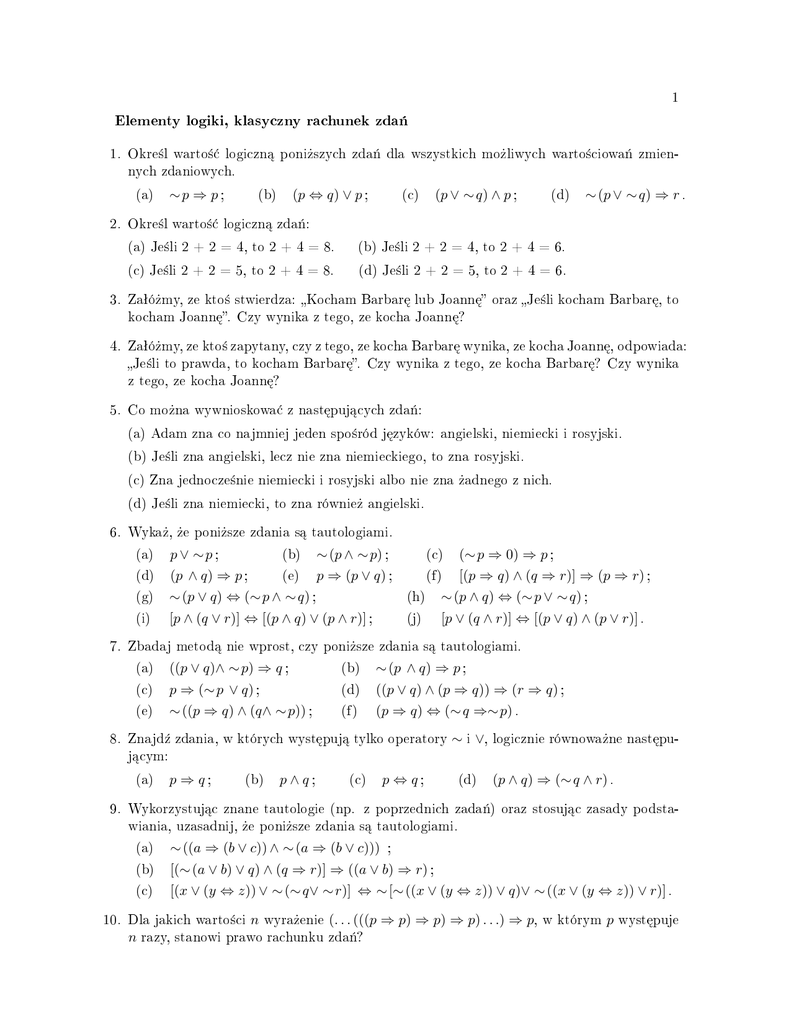 1 Elementy logiki, klasyczny rachunek zda« 1. Okre±l warto±¢ logiczn¡ poni»szych zda« dla wszystkich mo»liwych warto±ciowa« zmiennych zdaniowych. (a) ∼p ⇒ p ; (p ⇔ q) ∨ p ; (b) (p ∨ ∼ q) ∧ p ; (c) (d) ∼ (p ∨ ∼ q) ⇒ r . 2. Okre±l warto±¢ logiczn¡ zda«: (a) Je±li 2 + 2 = 4, to 2 + 4 = 8. (b) Je±li 2 + 2 = 4, to 2 + 4 = 6. (c) Je±li 2 + 2 = 5, to 2 + 4 = 8. (d) Je±li 2 + 2 = 5, to 2 + 4 = 6. 3. Zaªó»my, ze kto± stwierdza: Kocham Barbar¦ lub Joann¦ oraz Je±li kocham Barbar¦, to kocham Joann¦. Czy wynika z tego, ze kocha Joann¦? 4. Zaªó»my, ze kto± zapytany, czy z tego, ze kocha Barbar¦ wynika, ze kocha Joann¦, odpowiada: Je±li to prawda, to kocham Barbar¦. Czy wynika z tego, ze kocha Barbar¦? Czy wynika z tego, ze kocha Joann¦? 5. Co mo»na wywnioskowa¢ z nast¦puj¡cych zda«: (a) Adam zna co najmniej jeden spo±ród j¦zyków: angielski, niemiecki i rosyjski. (b) Je±li zna angielski, lecz nie zna niemieckiego, to zna rosyjski. (c) Zna jednocze±nie niemiecki i rosyjski albo nie zna »adnego z nich. (d) Je±li zna niemiecki, to zna równie» angielski. 6. Wyka», »e poni»sze zdania s¡ tautologiami. (a) p ∨ ∼p ; (d) (g) (p ∧ q) ⇒ p ; (e) p ⇒ (p ∨ q) ; ∼ (p ∨ q) ⇔ (∼ p ∧ ∼ q) ; (h) [(p ⇒ q) ∧ (q ⇒ r)] ⇒ (p ⇒ r) ; ∼ (p ∧ q) ⇔ (∼ p ∨ ∼ q) ; (i) [p ∧ (q ∨ r)] ⇔ [(p ∧ q) ∨ (p ∧ r)] ; (j) [p ∨ (q ∧ r)] ⇔ [(p ∨ q) ∧ (p ∨ r)] . (b) ∼ (p ∧ ∼ p) ; (∼ p ⇒ 0) ⇒ p ; (c) (f ) 7. Zbadaj metod¡ nie wprost, czy poni»sze zdania s¡ tautologiami. (a) ((p ∨ q)∧ ∼ p) ⇒ q ; (b) ∼ (p ∧ q) ⇒ p ; (c) p ⇒ (∼ p ∨ q) ; (d) ((p ∨ q) ∧ (p ⇒ q)) ⇒ (r ⇒ q) ; (e) ∼ ((p ⇒ q) ∧ (q∧ ∼ p)) ; (f ) (p ⇒ q) ⇔ (∼ q ⇒∼ p) . 8. Znajd¹ zdania, w których wyst¦puj¡ tylko operatory ∼ i ∨, logicznie równowa»ne nast¦pu- j¡cym: (a) p ⇒ q; (b) p∧q; (c) p ⇔ q; (d) (p ∧ q) ⇒ (∼ q ∧ r) . 9. Wykorzystuj¡c znane tautologie (np. z poprzednich zada«) oraz stosuj¡c zasady podstawiania, uzasadnij, »e poni»sze zdania s¡ tautologiami. (a) ∼ ((a ⇒ (b ∨ c)) ∧ ∼ (a ⇒ (b ∨ c))) (b) [(∼ (a ∨ b) ∨ q) ∧ (q ⇒ r)] ⇒ ((a ∨ b) ⇒ r) ; (c) [(x ∨ (y ⇔ z)) ∨ ∼ (∼ q∨ ∼ r)] ⇔ ∼ [∼ ((x ∨ (y ⇔ z)) ∨ q)∨ ∼ ((x ∨ (y ⇔ z)) ∨ r)] . 10. Dla jakich warto±ci n n wyra»enie ; (. . . (((p ⇒ p) ⇒ p) ⇒ p) . . .) ⇒ p, razy, stanowi prawo rachunku zda«? w którym p wyst¦puje 2 11. Okre±lamy dwuargumentowy operator logiczny p 0 0 1 1 q p⊕q 0 0 1 1 0 1 1 0 ⊕ przy pomocy tabelki: Wyka», »e: Operator ten nazywamy (a) p ⊕ q ⇔ ∼ (p ⇔ q) (b) (p ⊕ (q ⇒ r)) ⇒ ((p ⊕ q) ⇒ (p ⊕ r)) ; (c) p ⊕ (q ⊕ r) ⇔ (p ⊕ q) ⊕ r . ; alternatyw¡ wykluczaj¡c¡ (ozn. te» XOR). 12. Zdeniuj alternatyw¦ przy pomocy: (a) koniunkcji i negacji; (b) implikacji i negacji. 13. Wyka», »e ka»dy jednoargumentowy operator logiczny mo»na zdeniowa¢ przy pomocy operatorów ∼ i ∨. 14. Wyka», »e nie mo»na zdeniowa¢ implikacji za pomoc¡ alternatywy i koniunkcji. 15. Okre±lamy dwuargumentowy operator logiczny p 0 0 1 1 q p|q 0 1 1 1 0 1 1 0 | przy pomocy tabelki: Wyka», »e: Operator ten nazywamy (a) p | q ⇔ ∼ (p ∧ q) ; (b) ∼p ⇔ p | p ; (c) p ∨ q ⇔ (p | p) | (q | q) . dysjunkcj¡ (in. kresk¡ Sheera, niewspóªzachodzeniem, ozn. te» NAND). 16. (a) Wyka», »e wszystkie zdania logiczne zbudowane z pomoc¡ operatorów i ⊕ ∼, ∨, ∧, ⇒, ⇔ mo»na zapisa¢ u»ywaj¡c wyª¡cznie dysjunkcji. (b) Znajd¹ inny operator dwuargumentowy o takim charakterze uniwersalno±ci jak dysjunkcja. 17. Uzasadnij nast¦puj¡ce reguªy dowodzenia: p ⇒ q, p ; q p ⇒ ∼p ; ∼p (a) (e) (b) (f ) p ∨ q, ∼ p ; q p ; p∨q (c) (g) ∼ q ⇒∼ p, p ; q p∧q ; p (d) (h) p⇔q ; p⇒q p ⇒ q, q ⇒ p . p⇔q 18. Wykorzystuj¡c co najwy»ej trzy reguªy dowodzenia, udowodnij nast¦puj¡ce twierdzenie: Zaªo»enia: (1) Je»eli A lub B, to C. (2) A i B. Teza: C. 19. Oto (podany przez Euklidesa) dowód niesko«czono±ci zbioru liczb pierwszych. Przypu±¢my, »e istnieje tylko sko«czenie wiele liczb pierwszych. Mo»emy je wi¦c wszystkie kolejno wypisa¢: p1 = 2 < p2 = 3 < p3 = 5 < p4 = 7 < p5 = 11 < . . . < pn−1 < pn . Utwórzmy liczb¦ q := p1 · p2 · . . . · pn + 1. Wówczas q > pn > 1 W takim razie q jest pierwsze. z liczb p1 , . . . , p n . Ale ci¡g p1 < . . . < pn nie dzieli si¦ przez »adn¡ zawieraª wszystkie liczby pierwsze. Nasze przypuszczenie, ze liczb pierwszych jest sko«czenie wiele doprowadziªo nas do sprzeczno±ci. Zatem liczb pierwszych jest niesko«czenie wiele. (a) Opisz logiczn¡ struktur¦ dowodu. (b) Stosuj¡c podobne rozumowanie wyka», »e istniej¡ pewne dwie liczby pierwsze, które maja takich samych sze±¢ ostatnich cyfr rozwini¦cia dziesi¦tnego.