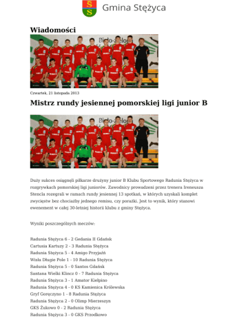 Wiadomości Czwartek, 21 listopada 2013 Mistrz rundy jesiennej pomorskiej ligi junior B Duży sukces osiągnęli piłkarze drużyny junior B Klubu Sportowego Radunia Stężyca w rozgrywkach pomorskiej ligi juniorów. Zawodnicy prowadzeni przez trenera Ireneusza Stencla rozegrali w ramach rundy jesiennej 13 spotkań, w których uzyskali komplet zwycięstw bez chociażby jednego remisu, czy porażki. Jest to wynik, który stanowi ewenement w całej 30-letniej historii klubu z gminy Stężyca. Wyniki poszczególnych meczów: Radunia Stężyca 6 - 2 Gedania II Gdańsk Cartusia Kartuzy 2 - 3 Radunia Stężyca Radunia Stężyca 5 - 4 Amigo Przyjaźń Wisła Długie Pole 1 - 10 Radunia Stężyca Radunia Stężyca 5 - 0 Santos Gdańsk Santana Wielki Klincz 0 - 7 Radunia Stężyca Radunia Stężyca 3 - 1 Amator Kiełpino Radunia Stężyca 4 - 0 KS Kamienica Królewska Gryf Goręczyno 1 - 8 Radunia Stężyca Radunia Stężyca 2 - 0 Olimp Mierzeszyn GKS Żukowo 0 - 2 Radunia Stężyca Radunia Stężyca 3 - 0 GKS Przodkowo GKS Kowale 2 - 12 Radunia Stężyca Kadra zespołu: Patryk Macholl, Kacper Lewna, Karol Stencel, Paweł Wiczkowski, Paweł Kamrowski, Paweł Platta, Robert Niklas, Damian Troka, Nico Strusyk, Bartosz Cylka, Jeremiasz Kulwikowski, Jakub Cichosz, Maciej Stencel, Adrian Brunka, Daniel Zblewski, Daniel Rompa, Jakub Skwierawski, Patryk Wiśniewski, Szymon Domaszk, Piotr Lewna , Szymon Gruchała. Trener Ireneusz Stencel