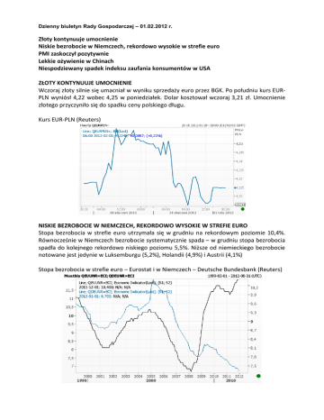 Dzienny biuletyn Rady Gospodarczej – 01.02.2012 r. Złoty kontynuuje umocnienie Niskie bezrobocie w Niemczech, rekordowo wysokie w strefie euro PMI zaskoczył pozytywnie Lekkie ożywienie w Chinach Niespodziewany spadek indeksu zaufania konsumentów w USA ZŁOTY KONTYNUUJE UMOCNIENIE Wczoraj złoty silnie się umacniał w wyniku sprzedaży euro przez BGK. Po południu kurs EURPLN wyniósł 4,22 wobec 4,25 w poniedziałek. Dolar kosztował wczoraj 3,21 zł. Umocnienie złotego przyczyniło się do spadku ceny polskiego długu. Kurs EUR-PLN (Reuters) NISKIE BEZROBOCIE W NIEMCZECH, REKORDOWO WYSOKIE W STREFIE EURO Stopa bezrobocia w strefie euro utrzymała się w grudniu na rekordowym poziomie 10,4%. Równocześnie w Niemczech bezrobocie systematycznie spada – w grudniu stopa bezrobocia spadła do kolejnego rekordowo niskiego poziomu 5,5%. Niższe od niemieckiego bezrobocie notowane jest jedynie w Luksemburgu (5,2%), Holandii (4,9%) i Austrii (4,1%) Stopa bezrobocia w strefie euro – Eurostat i w Niemczech – Deutsche Bundesbank (Reuters) Dzienny biuletyn Rady Gospodarczej – 01.02.2012 r. PMI ZASKOCZYŁ POZYTYWNIE Indeks koniunktury PMI dla sektora przetwórstwa przemysłowego w Polsce wyniósł w styczniu 52,15 pkt., co oznacza znaczny wzrost w stosunku do grudnia (48,8 pkt.) i wynik lepszy od prognoz (konsensus 49,4 pkt.). LEKKIE OŻYWIENIE W CHINACH Indeks PMI dla Chin obliczany przez CFLP pokazuje delikatne ożywienie gospodarki: w styczniu wyniósł 50,5 pkt. w porównaniu do 50,3 pkt. w grudniu. Mimo optymistycznego wskaźnika władze chioskie uruchamiają polityki pro-wzrostowe, mając na względzie najniższe od 2,5 roku tempo wzrostu PKB w IV kw. 2011 r. Wczoraj chioski bank centralny ogłosił zmniejszenie rezerw obowiązkowych banków i zapowiadane są dalsze redukcje. NIESPODZIEWANY SPADEK INDEKSU ZAUFANIA KONSUMENTÓW W USA Amerykaoski indeks zaufania konsumentów Conference Board spadł w styczniu do 61,1 pkt. z 64,8 pkt. w grudniu, prognozowano wzrost do 68 pkt. Popyt indywidualny tworzy ponad dwie trzecie amerykaoskiego PKB. Dziś: indeksy PMI dla strefy euro, Niemiec, Wielkiej Brytanii, Szwajcarii, aukcja 10-letnich obligacji polskich, aukcja 10-letnich niemieckich bundów i aukcja obligacji portugalskich Dane: 0,67 Zmiana w por. z 27.01.12 (w %) 1,12 Zmiana w por. z 30.12.11 (w %) 8,75 -16,77 Zmiana w por. z 31.12.10 (w %) -15,01 6458,91 0,22 -0,81 9,50 -12,44 -6,58 CAC40 3298,55 1,01 -0,61 4,39 -17,17 -13,31 DJI 12632,91 -0,16 -0,22 3,40 1,76 9,12 Nikkei 225* 8809,79 0,08 0,31 -0,36 4,19 -10,25 -0,32 5,72 -7,36 -13,87 -4,23 MSCI AC World 316,65 Zmiana w por. z 30.12.11 (w %) -5,19 Zmiana w por. z 30.06.11 (w %) 6,35 Kurs zamknięcia 31.01.12 Zmiana dzienna (w %) WIG20 2332,17 DAX Indeks Zmiana w por. z 30.06.11 (w %) *1.01.12 Waluty Kurs 1.01.12 Zmiana w por. do zamknięcia 31.01 (w %) EUR-PLN 4,23 0,04 Zmiana w por. z 27.01.12 (w %) 0,11 CHF-PLN 3,51 -0,04 0,22 -4,30 7,84 10,98 USD-PLN 3,25 0,25 1,12 -5,75 18,40 9,75 EUR-USD 1,30 -0,40 -1,37 0,60 -10,04 -2,61 EUR-CHF 1,20 0,06 -0,14 -0,90 -1,21 -3,69 EUR-HUF 296 0,37 0,55 -5,94 11,24 6,52 CHF-USD 1,08 -0,43 -1,21 1,53 -8,91 1,16 Współpraca: Departament Analiz Strategicznych KPRM Zmiana w por. z 31.12.10 (w %) 7,12