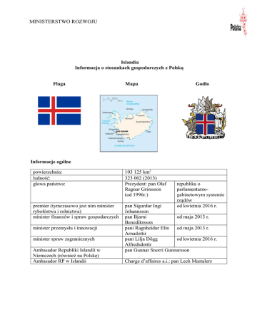 MINISTERSTWO ROZWOJU Islandia Informacja o stosunkach gospodarczych z Polską Flaga Mapa Godło Informacje ogólne powierzchnia: ludność: głowa państwa: 103 125 km2 323 002 (2013) Prezydent: pan Olaf Ragnar Grimsson (od 1996r.) premier (tymczasowo jest nim minister rybołóstwa i rolnictwa) minister finansów i spraw gospodarczych pan Sigurdur Ingi Johannsson pan Bjarni od maja 2013 r. Benediktsson pani Ragnheidur Elin od maja 2013 r. Arnadottir pani Lilja Dögg od kwietnia 2016 r. Alfredsdottir pan Gunnar Snorri Gunnarsson minister przemysłu i innowacji minister spraw zagranicznych Ambasador Republiki Islandii w Niemczech (również na Polskę) Ambasador RP w Islandii republika o parlamentarnogabinetowym systemie rządów od kwietnia 2016 r. Charge d’affaires a.i.: pan Lech Mastalerz Podstawowe wskaźniki makroekonomiczne gospodarki Islandii (zmiana w %; r/r) Wyszczególnienie Produkt Krajowy Brutto Konsumpcja prywatna Konsumpcja publiczna Nakłady brutto na środki trwałe Eksport ogółem Import ogółem Stopa bezrobocia 2012 2013 2014 2015 2016* 2017* 1.2 3.6 1.9 4,0 4,0 3,1 2.1 0.5 3.7 4,8 5,2 4,2 -1.7 0.7 1.8 1,1 1,4 1,2 5.6 -1.0 13.7 18,6 13,2 7,7 3.7 6.9 3.1 8,2 5,3 3,4 4.7 0.3 9.9 13,5 9,1 5,7 6.0 5.4 5.0 3,6 3,8 3,6 Inflacja (CPI) 5.2 3.9 2.0 1,6 2,8 Żródła danych: Statistics Iceland, * Dane za 2015 r. są danymi wstępnymi; na 2016 i 2017 - prognoza 3,9 1. Podstawowe informacje, sytuacja gospodarcza Islandia jest republiką zgodnie z obowiązującą konstytucją z 1944 (była nowelizowana w 1984 oraz w 1991). Głową państwa jest prezydent, który wybierany jest w wyborach powszechnych i bezpośrednich co 4 lata. Jednak kompetencje prezydenta są mocno ograniczone, a głównym podmiotem władzy ustawodawczej jest 1-izbowy parlament, Althing (isl. Alþingi). Parlament liczy 63 członków. Są oni wybierani na 4-letnią kadencję według systemu proporcjonalnego. Szefem rządu jest, wyznaczany przez prezydenta, premier, który wraz z resztą gabinetu stanowi władzę wykonawczą. Rząd musi posiadać zaufanie parlamentu, przed którym ponosi odpowiedzialność. Podstawą gospodarki Islandii jest rybołówstwo. W połowach morskich Islandii głównie łowione są ryby: błękitek, śledź, gromadnik i dorsz. Produkty rybne stanowią ok. 40% wyprodukowanych towarów. Przemysł w Islandii jest stosunkowo młodą dziedziną gospodarki. Większe zakłady powstawały w XX w. Głównie są to zakłady przemysłu spożywczego związanego z surowcami na bazie rolnictwa i rybołówstwa. Na bazie rolnictwa także powstał przemysł lekki i zakłady przerobu skór. Znajduje się sporo niewielkich fabryk produkujących sprzęt elektryczny, artykuły gospodarstwa domowego, wyroby ceramiczne, toaletowe, produkty spożywcze i cukiernicze, a także inne towary powszechnego użytku. Znacznie rozwinięty jest przemysł poligraficzny. Do dużych zakładów, reprezentujących nowe gałęzie przemysłu należy zaliczyć cementownię w Akranes, fabrykę nawozów sztucznych w Hafnarfjordur, huty aluminium: Straumsvik i pod Hafnarfjordur oraz w Reydarfjordur. Poza tym głównymi zasobami Islandii są energia wodna, energia geotermiczna, aluminium i diatomity. W szklarniach ogrzewanych energią geotermiczną uprawiane są warzywa i kwiaty, a nawet banany. 2. Polityka gospodarcza 2 W 2015 r. gospodarka islandzka odnotowała dodatnie tempo wzrostu gospodarczego na poziomie 4%. Wśród kluczowych składowych wzrostu gospodarczego Islandii w 2015 r. największy wpływ na jego skalę miał popyt wewnętrzny, którego kontrybucja we wzrost PKB wyniosła 3,2 pkt. Proc. Głównym czynnikiem pro-wzrostowym w tej kategorii była konsumpcja prywatna i publiczna – odpowiadające za ponad 70% wartości PKB ogółem. Popyt zagraniczny tj. bilans handlowy (eksport – import) wykazał się ujemną kontrybucją we wzrost PKB na poziomie 0,8 pkt. proc. Głównym powodem takiego stanu rzeczy był dynamiczny 13,5% przyrost importu, który można po części wiązać ze zwiększonym popytem gospodarstw domowych coraz lepiej odczuwających poprawę na rynku pracy. Eksport w tym samym okresie wzrósł o 8,2%. Inflacja w 2015 r. nie stanowiła zagrożenia dla stabilności islandzkiej gospodarki. Stopa bezrobocia na koniec 2015 r. wyniosła 3,6% tj. najmniej od 2005 r. Wg. Prognoz Islandzkiego Urzędu Statystycznego wzrost gospodarczy w 2016 r. powinien utrzymać się na poziomie 4%. Napędzany ma być on nadal popytem wewnętrznym, w tym konsumpcją – głównie prywatna, jak i inwestycjami. Warte podkreślenia jest również powolne przesuwanie się ciężaru źródeł wzrostu gospodarczego z sektora rybnego na sektor turystyczny. 3. Ramy prawno-traktatowe współpracy gospodarczej Od momentu wejścia Polski do UE, tj. od 1 maja 2004r. współpraca gospodarcza realizowana jest na podstawie Porozumienia o Europejskim Obszarze Gospodarczym (EOG) wraz z poprawkami wynikającymi z rozszerzenia EOG o 10 krajów nowo przystępujących (Protokół do EOG w sprawie rozszerzenia wszedł w życie 6 grudnia 2005r.). Z dniem 1 maja 2006 r. Islandia zniosła wszelkie ograniczenia w dostępie do rynku pracy dla obywateli nowych państw członkowskich UE, w tym Polski. Nie straciły ważności bilateralne umowy między Polską a Islandią, których nie obejmuje kompetencja Wspólnoty, w tym: Umowa w sprawie unikania podwójnego opodatkowania i zapobiegania uchylaniu się od opodatkowania w zakresie podatków od dochodu i majątku z 19.06.1998r. ( Dz.U. 1999 nr 79 poz. 890) 16 lipca 2009r. Parlament upoważnił Rząd Islandii do złożenia wniosku o członkostwo Islandii w Unii Europejskiej. 19 października 2009r. Islandia przekazała do Brukseli odpowiedź na tzw. kwestionariusz unijny, czyli pytania Komisji Europejskiej odnośnie wszystkich obszarów negocjacyjnych. W dniu 27 lipca 2010r. zostały oficjalnie zainicjowane negocjacje akcesyjne z Islandią. W 2013 r. w wyniku kwietniowych wyborów parlamentarnych powstała cent