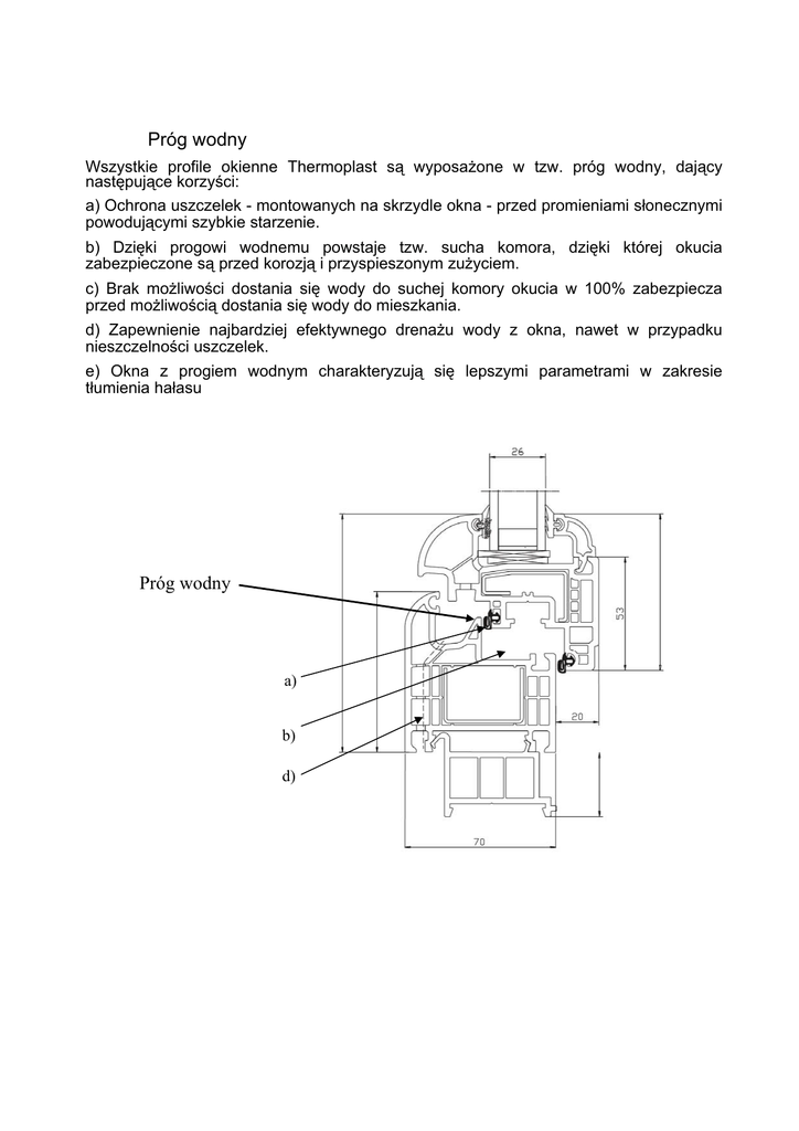 Próg wodny Wszystkie profile okienne Thermoplast są wyposażone w tzw. próg wodny, dający następujące korzyści: a) Ochrona uszczelek - montowanych na skrzydle okna - przed promieniami słonecznymi powodującymi szybkie starzenie. b) Dzięki progowi wodnemu powstaje tzw. sucha komora, dzięki której okucia zabezpieczone są przed korozją i przyspieszonym zużyciem. c) Brak możliwości dostania się wody do suchej komory okucia w 100% zabezpiecza przed możliwością dostania się wody do mieszkania. d) Zapewnienie najbardziej efektywnego drenażu wody z okna, nawet w przypadku nieszczelności uszczelek. e) Okna z progiem wodnym charakteryzują się lepszymi parametrami w zakresie tłumienia hałasu Próg wodny a) b) d)