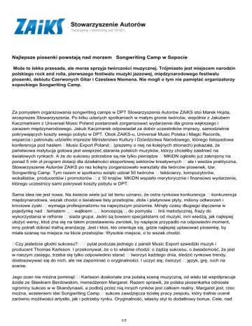 Najlepsze piosenki powstają nad morzem Songwriting Camp w Sopocie Może to lekka przesada, ale morze sprzyja twórczości muzycznej. Trójmiasto jest miejscem narodzin polskiego rock and rolla, pierwszego festiwalu muzyki jazzowej, międzynarodowego festiwalu piosenki, debiutu Czerwonych Gitar i Czesława Niemena. Nie mogli o tym nie pamiętać organizatorzy sopockiego Songwriting Camp. Za pomysłem organizowania songwriting camps w DPT Stowarzyszenia Autorów ZAiKS stoi Marek Hojda, wiceprezes Stowarzyszenia. Po kilku udanych spotkaniach w małym gronie twórców, wspólnie z Jakubem Kaczmarkiem z Universal Music Poland postanowili zorganizować wydarzenie dla grona większego i zarazem międzynarodowego. Jakub Kaczmarek odpowiadał za dobór uczestników imprezy, samodzielnie pokrywających koszty swego pobytu w DPT. Obok ZAiKS-u, Universal Music Polska i Magic Records, wsparcia i patronatu udzieliło imprezie Ministerstwo Kultury i Dziedzictwa Narodowego, którego listopadowa konferencja pod hasłem Music Export Poland (piszemy o niej na kolejnych stronach) pokazała, że państwowa instytucja gotowa jest wesprzeć starania polskich muzyków, którzy chcieliby zaistnieć na światowych rynkach. A że do sukcesu potrzebne są nie tylko pieniądze MKiDN ogłosiło już zakrojony na ponad 5 mln zł program dotacji dla działalności eksportowej sektorów kreatywnych ale i wiedza praktyczna, Stowarzyszenie Autorów ZAiKS po raz kolejny zorganizowało warsztaty dla twórców piosenek, tzw. Songwriting Camp. Tym razem w spotkaniu wzięło udział 50 twórców tekściarzy, kompozytorów, wokalistów, producentów i promotorów z 10 krajów. MKiDN wsparło merytorycznie i finansowo wydarzenie, którego uczestnicy sami pokrywali koszty pobytu w DPT. Sama idea nie jest nowa. Na świecie wiele już lat temu uznano, że ostra rynkowa konkurencja konkurencja międzynarodowa, wszak chodzi o światowe listy przebojów, złote i platynowe płyty, miliony odtworzeń i krociowe zyski wymaga profesjonalizmu na najwyższym poziomie. Minęły czasy długiego ślęczenia w pojedynkę nad tematem , wątkiem , koncepcją , do pomysłu linii melodycznej, frazy do wykorzystania w refrenie siada grupa. Jedni są bowiem specjalistami od muzyki, inni wiedzą, jak najlepiej ułożyć wersy, ktoś zna się na takim przestawieniu zwrotek, by napięcie przypadło na odpowiedni moment, inny potrafi dobrać trafną aranżację. Jest i ktoś, kto orientuje się, gdzie najlepiej uplasować piosenkę, by miała szansę na miejsce na liście przebojów. Wysokie miejsce, o to wszak chodzi. Czy jesteście głodni sukcesu? pytał podczas jednego z paneli Music Export szwedzki muzyk i producent Thomas Karlsson. I przekonywał, że o to właśnie chodzi: o żądzę sukcesu, o świadomość, że jest w naszym zasięgu, trzeba się tylko odpowiednio starać tworzyć każdego dnia, śledzić rynkowe trendy, dostosowywać się do nich, ale nie zapominać o oryginalności. I uczyć się, ćwiczyć język, grę, ruch na scenie. Jego ocen nie można pominąć Karlsson doskonale zna polską scenę muzyczną, od wielu lat współpracuje ściśle ze Sławkiem Berdowskim, menedżerem Margaret. Razem sprawili, że polska piosenkarka odniosła ogromny sukces w w Skandynawii, a podbój przez nią innych rynków jest całkiem realny. Margaret jest, rzec można, wcieleniem idei Songwriting Camp sukces zawdzięcza ścisłej pracy zespołu, który trafnie ocenił zarówno możliwości artystki, jak i potrzeby rynku. Oryginalność, własny styl to dodatkowy bonus. Cele, nad 1/3 którymi pracują wszyscy uczestnicy grudniowych sopockich warsztatów. Wśród nich są Polacy wokalistki Sarsa, Lanberry,Ola Jabłonka, Monika Lewczuk i wspomniana Margaret, kompozytorzy i producenci Sebastian Piekarek, Wojtek Łuszczykiewicz, Patryk Kumór, Mateusz Andrzejewski, Marek Hojda i twórcy z innych krajów: Reece Pullinger, Cameron Warren i Paul Whalley z Wielkiej Brytanii, Leonid Gutkin z Federacji Rosyjskiej, Szwedzi Thomas Karlsson i Joakim Buddee, Sofia Annessiadi z Belgii, Arie Burshtein i Oceana Mahlmann z Niemiec, dobrze w Polsce znana laureatka Słowika Publiczności zdobytego w 2009 roku w Sopocie, i najmłodszy uczestnik campu, 17-letni muzyk i producent z Węgier Marcel Zavodi. A to tylko kilkanaście nazwisk. Warsztatom, które odbywały się w Domu Pracy Twórczej ZAiKS-u, towarzyszyła atmosfera rzadko spotykanego porozumienia: Bywa, że twórcy potrzebują tygodnia, by się zgrać, tu wystarczył jeden wieczór mówił Patryk Kumór. Skład trzyosobowych zespołów roboczych zmieniany był codziennie, by zapewnić pełną rotację twórców. W salach oznaczonych nazwami polskich miast królował sprzęt elektroniczny najnowszej generacji, ale nie zabrakło także tradycyjnych gitar akustycznych. Dom dudnił dźwiękami długo w noc, twórców nie ograniczały późne godziny. Grano na schodach, przy stolikach w jadalni dyskutowano aranże, w holu wymieniano się adresami i telefonami. Były żarty, uśmiechy, chęć pomocy i nauki. Wspaniałe doświadczenie, mogę się tyle nauczyć od innych producentów i muzyków zachwycał się Marcel. Duży to komplement, bo ten niezwykle utalentowany młodzieniec ma już w dorobku niemal 40 albumów i setki demówek . Podobnie chwaliła camp pomysł, miejsce, organizatorów, kolegów Oceana. Niemiecka piosenkarka otwarcie mówi, że w Polsce lubi występować, bo dobrze się tu czuje i lubi z wzajemnością publiczność. Cieszę się, że niebawem znów zagram w Polsce, tym razem w Krakowie na sylwestrowym koncercie. A Sopot jest dla mnie miejscem niezwykłym I am a beach girl (uwielbiam plażę). Nic w tym dziwnego, piękna wokalistka pochodzi z portowego Hamburga. W ocenie Patryka Kumóra dzięki partycypacji ZAiKS-u twórcy mieli doskonałe warunki kreatywnej pracy. Ale moi zachodni koledzy, którzy wreszcie przyjechali do Polski i trafili na ten camp, przyznali, że mówiłem prawdę, gdy, jako nie