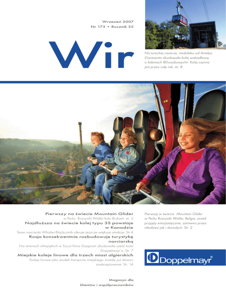 Wrzesień 2007 Nr 173 • Rocznik 32 Na tureckiej riwierze, niedaleko od Antalya Garaventa zbudowała kolej wahadłową o kabinach 80-osobowychn. Kolej czynna jest przez cały rok, str. 8 Pierwszy na świecie Mountain Glider w Parku Rozrywki Walibi koło Brukseli. str. 2 Najdłuższa na świecie kolej typu 3S powstaje w Kanadzie Teren narciarski Whistler-Blackcomb oferuje jeszcze większe atrakcje. Str.4 Rosja konsekwentnie rozbudowuje turystykę narciarską Na terenach olimpijskich w Soczi firma Gazprom zbudowała sześć kolei Doppelmayr’a. Str. 7 Miejskie koleje linowe dla trzech miast algierskich Koleje linowe jako środek transportu miejskiego zostały już dawno zaakceptowane. Str. 14 Magazyn dla klientów i współpracowników Pierwszy w świecie Mountain Glider w Parku Rozrywki Walibi, Belgia, został przyjęty entuzjastycznie, zarówno przez młodzież jak i dorosłych. Str. 2 Grupa Doppelmayr/Garaventa 2 Pierwszy na świecie Mountain Glider w Belgii Park Rozrywki „Walibi” niedaleko Brukseli w Belgii1, wzbogacił się o kolejną atrakcję: zainstalowano tu pierwszy w świecie Mountain Glider. Od 16 lipca 2007 odwiedzający park Walibi mogą spełnić prastare marzenie człowieka i obserwować świat z perspektywy lotu ptaka. Płaskie wznoszenie się Już na początku przygody jest interesująco, czteromiejscowe pojazdy, podobne do miejsc na kolei linowej, jadą z prędkością 5,5 m/s koleją pionową na wieżę startową o wysokości 55 m. W tym celu zastosowano dwa urządzenia podnośnikowe. Pojazd podnoszony jest do góry, następnie pusty podnośnik opuszczany jest na dół. W środku odcinka podnoszenia każdy z obu ramion transportujących wychyla się nieco na zewnątrz, aby zrobić miejsce pojazdowi jadącemu z naprzeciwka. Jednocześnie pojazd obracany jest o 110 °, co zapewnia pasażerom wspaniały widok panoramiczny. …szybki lot Teraz rozpoczyna się właściwa jazda po kulistej trasie o długości powyżej 700 m przy prędkości ponad 70 km/h. Pięć podpór, na których oparta jest jezdnia, stosowanych jest jednocześnie jako łożyskowanie : jedna podpora wyprofilowana jako korkociąg o zwrocie 720°, w przypadku innych garby wielbłądzie dbają o wzrost adrenaliny. Pasażerowi przekazuje się wrażenie płaskiego lotu ślizgowego. Spowodowane Mountain Glider Vertigo Zdolność przewozowa 800 osób/godz. Czas jazdy 1,6 min Max. prędkość 74 km/h Krzesła 4-osobowe 8 Odstęp czasowy między krzesłami 18 s Długość trasy (kurs naokoło) 720 m Wysokość wieży startowej 55 m Podpory 5 jest to konstrukcją urządzenia. Pojazdy wychylają się do przodu i do tyłu jak również na boki, co pozwala na uniknięcie nieprzyjemnych sił działających z boku. To, że dla pasażerów wystarcza tylko pałąk zamykający i siedzenia są otwarte, wzmacnia jeszcze iluzję lotu. Parki rozrywki i góry Mountain Glider łączy dwa światy: po pierwsze parku rozrywki i po drugie można go stosować jako uatrakcyjnienie oferty turystycznej w górach! Wszystko zaczęło się w roku 1998, od pomysłu stworzenia nowego urządzenia na potrzeby spędzania wolnego czasu. Pojazd spuszczano wtedy po linie stalowej w dół. Od pierwszego pomysłu, aż do uruchomienia „Vertigo” zwanego Mountain Glider w parku Walibi-Park zajęło to jeszcze trochę czasu. Tak jak to zwykle podchodzi się do wszystkich nowości firma Doppelmayr, największą wartość przykłada się do możliwie jak największego bezpieczeństwa i niezawodności. Zbudowano dwie koleje testowe i przeprowadzono niezliczone próby, zanim przystąpiono do realizacji. Jako przykład dużej dbałości, która miała miejsce także i w przypadku tej innowacji, należy podkreślić, że Doppelmayr położył nacisk na system bezpieczeństwa. Aby zapobiec najeżdżaniu pojazdów na siebie, centralny komputer kontroluje i steruje odległości między pojazdami2. To co tak prosto brzmi, jest prawdziwym wyzwaniem, ponieważ wiele parametrów – w tym nachylenie kolei i podmuchy wiatru – mogą na poszczególnych odcinkach trasy wpływać na prędkość. Właścicielem jest CDA, największy eksploatator terenów narciarskich w Europie. CDA posiada poza tym w Europie dziewięć parków rozrywki. 2 Każdy pojazd wyposażony jest w łączność radiową i posiada trzy niezależne układy hamulcowe.. 1 3 Innowacje zapewniają prymat w technologii Mountain Glider oferowany jest także do całorocznego wykorzystywania w regionach górskich. Poza tym łatwo można go zintegrować z istniejącą infrastrukturą kolei linowych i poprawić jej wykorzystanie zarówno w lecie jak w i zimie. W branży kolei linowych Grupa Doppelmayr/Garaventa jest na całym świecie grupą wiodącą w zakresie oferowanej jakości i technologii. Cieszy nas to, ale oczywiście stanowi to jeszcze jeden powód, aby nie spoczywać na laurach. Nasza wiodąca pozycja w zakresie technologii kolei linowych wymaga stałego dążenia do ulepszeń i nowych pomysłów jak również ich realizacji. Sama wykonalność techniczna jest nieistotna; miernikiem jest wyłącznie możliwość wykorzystania innowacji przez użytkowników kolei linowych. Korzyść może być wieloraka: prosta obsługa, wysoka dyspozycyjność, komfort dla użytkowników, dotrzymanie wymaganych norm i najnowszych standardów, korzystny stosunek kosztów do użytkowania itd. Niektóre innowacje wynikające z tego wzbudzają duże zainteresowanie mediów jak np. podgrzewane siedzenia lub „wielkie koło” w ST. Anton. Inne, jak na przykład układ nadzorowania położenia liny RPD można by nawet określić mianem kamieni milowych w technice kolei linowych. Także w przypadku procesów wewnątrzzakładowych, technik produkcji lub organizacji wprowadzane są stale innowacje, w celu zoptymalizowania całego łańcucha produkcji i dostosowania się do życzeń naszych klientów. Za wszystkimi nowościami kryje się mnóstwo pracy. Dlatego tak ważnym jest, aby moi pracownicy we wszystkich zak