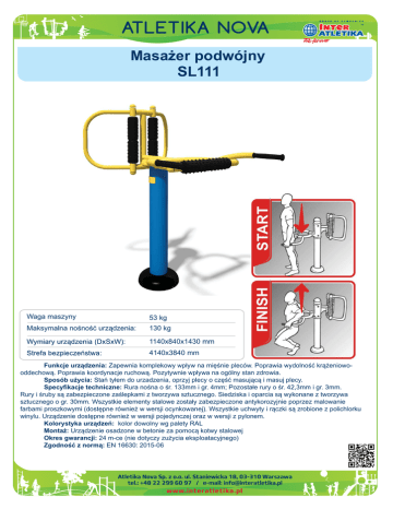 Masażer podwójny SL111 Waga maszyny 53 kg Maksymalna nośność urządzenia: 130 kg 1140x840x1430 mm 4140x3840 mm Funkcje urządzenia: Zapewnia komplekowy wpływ na mięśnie pleców. Poprawia wydolność krążeniowooddechową. Poprawia koordynacje ruchową. Pozytywnie wpływa na ogólny stan zdrowia. Sposób użycia: Stań tyłem do urzadzenia, oprzyj plecy o część masującą i masuj plecy. Specyfikacje techniczne: Rura nośna o śr. 133mm i gr. 4mm; Pozostałe rury o śr. 42,3mm i gr. 3mm. Rury i śruby są zabezpieczone zaślepkami z tworzywa sztucznego. Siedziska i oparcia są wykonane z tworzywa sztucznego o gr. 30mm. Wszystkie elementy stalowe zostały zabezpieczone antykorozyjnie poprzez malowanie farbami proszkowymi (dostępne również w wersji ocynkowanej). Wszystkie uchwyty i rączki są zrobione z polichlorku winylu. Urządzenie dostępne również w wersji pojedynczej oraz w wersji z pylonem. Kolorystyka urządzeń: kolor dowolny wg palety RAL Montaż: Urządzenie osadzone w betonie za pomocą kotwy stalowej Okres gwarancji: 24 m-ce (nie dotyczy zużycia eksploatacyjnego) Zgodność z normą: EN 16630: 2015-06