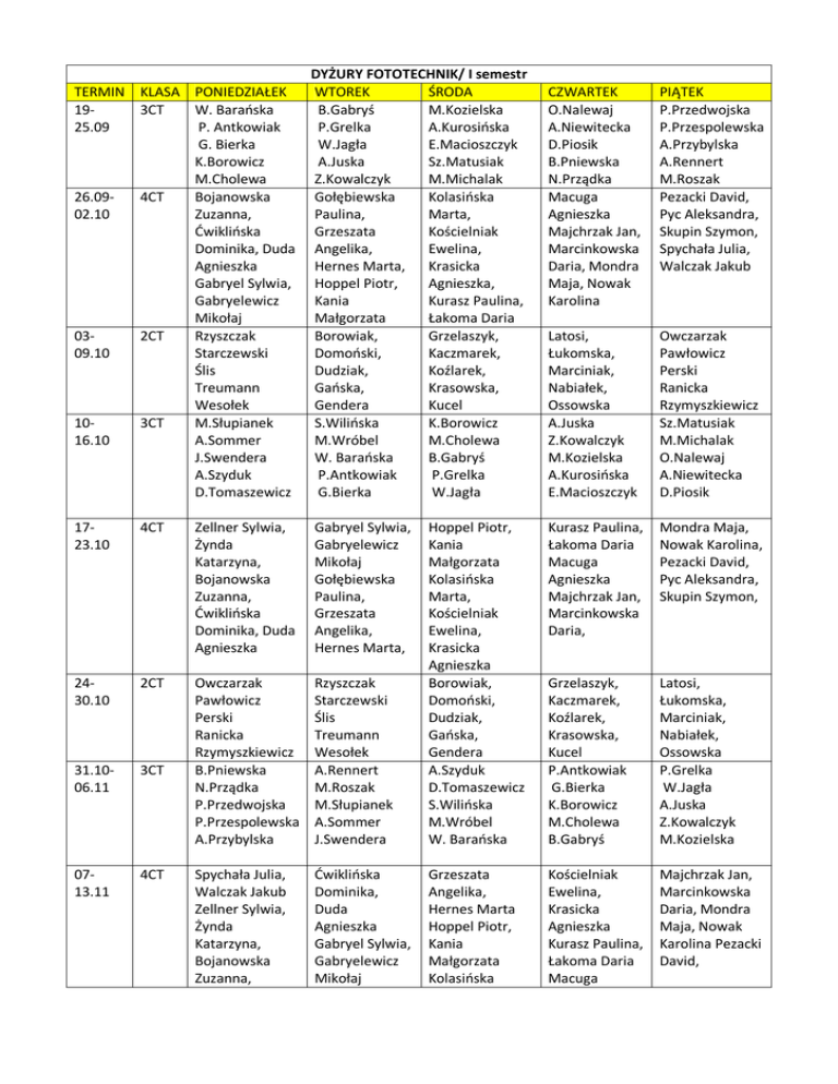 TERMIN KLASA PONIEDZIAŁEK 193CT W. Barańska 25.09 P. Antkowiak G. Bierka K.Borowicz M.Cholewa 26.094CT Bojanowska 02.10 Zuzanna, Ćwiklińska Dominika, Duda Agnieszka Gabryel Sylwia, Gabryelewicz Mikołaj 032CT Rzyszczak 09.10 Starczewski Ślis Treumann Wesołek 103CT M.Słupianek 16.10 A.Sommer J.Swendera A.Szyduk D.Tomaszewicz DYŻURY FOTOTECHNIK/ I semestr WTOREK ŚRODA B.Gabryś M.Kozielska P.Grelka A.Kurosińska W.Jagła E.Macioszczyk A.Juska Sz.Matusiak Z.Kowalczyk M.Michalak Gołębiewska Kolasińska Paulina, Marta, Grzeszata Kościelniak Angelika, Ewelina, Hernes Marta, Krasicka Hoppel Piotr, Agnieszka, Kania Kurasz Paulina, Małgorzata Łakoma Daria Borowiak, Grzelaszyk, Domoński, Kaczmarek, Dudziak, Koźlarek, Gańska, Krasowska, Gendera Kucel S.Wilińska K.Borowicz M.Wróbel M.Cholewa W. Barańska B.Gabryś P.Antkowiak P.Grelka G.Bierka W.Jagła 1723.10 4CT Zellner Sylwia, Żynda Katarzyna, Bojanowska Zuzanna, Ćwiklińska Dominika, Duda Agnieszka Gabryel Sylwia, Gabryelewicz Mikołaj Gołębiewska Paulina, Grzeszata Angelika, Hernes Marta, 2430.10 2CT 31.1006.11 3CT Owczarzak Pawłowicz Perski Ranicka Rzymyszkiewicz B.Pniewska N.Prządka P.Przedwojska P.Przespolewska A.Przybylska Rzyszczak Starczewski Ślis Treumann Wesołek A.Rennert M.Roszak M.Słupianek A.Sommer J.Swendera Hoppel Piotr, Kania Małgorzata Kolasińska Marta, Kościelniak Ewelina, Krasicka Agnieszka Borowiak, Domoński, Dudziak, Gańska, Gendera A.Szyduk D.Tomaszewicz S.Wilińska M.Wróbel W. Barańska 0713.11 4CT Spychała Julia, Walczak Jakub Zellner Sylwia, Żynda Katarzyna, Bojanowska Zuzanna, Ćwiklińska Dominika, Duda Agnieszka Gabryel Sylwia, Gabryelewicz Mikołaj Grzeszata Angelika, Hernes Marta Hoppel Piotr, Kania Małgorzata Kolasińska CZWARTEK O.Nalewaj A.Niewitecka D.Piosik B.Pniewska N.Prządka Macuga Agnieszka Majchrzak Jan, Marcinkowska Daria, Mondra Maja, Nowak Karolina PIĄTEK P.Przedwojska P.Przespolewska A.Przybylska A.Rennert M.Roszak Pezacki David, Pyc Aleksandra, Skupin Szymon, Spychała Julia, Walczak Jakub Latosi, Łukomska, Marciniak, Nabiałek, Ossowska A.Juska Z.Kowalczyk M.Kozielska A.Kurosińska E.Macioszczyk Owczarzak Pawłowicz Perski Ranicka Rzymyszkiewicz Sz.Matusiak M.Michalak O.Nalewaj A.Niewitecka D.Piosik Kurasz Paulina, Łakoma Daria Macuga Agnieszka Majchrzak Jan, Marcinkowska Daria, Mondra Maja, Nowak Karolina, Pezacki David, Pyc Aleksandra, Skupin Szymon, Grzelaszyk, Kaczmarek, Koźlarek, Krasowska, Kucel P.Antkowiak G.Bierka K.Borowicz M.Cholewa B.Gabryś Latosi, Łukomska, Marciniak, Nabiałek, Ossowska P.Grelka W.Jagła A.Juska Z.Kowalczyk M.Kozielska Kościelniak Ewelina, Krasicka Agnieszka Kurasz Paulina, Łakoma Daria Macuga Majchrzak Jan, Marcinkowska Daria, Mondra Maja, Nowak Karolina Pezacki David, 1420.11 1CT Baranek Adam Boroń Jagoda Borzęcka Julia Dejer Katarzyna Dybul Katarzyna 2127.11 2CT 28.1104.12 3CT Latosi, Łukomska, Marciniak, Nabiałek, Ossowska A.Kurosińska E.Macioszczyk Sz.Matusiak M.Michalak O.Nalewaj 0511.12 4CT Pyc Aleksandra, Skupin Szymon, Spychała Julia, Walczak Jakub Zellner Sylwia 1218.12 1CT 1922.12 2CT Szpyrka Julia, Walkowiak Łukasz, Węglarz Karolina, Wolarz Wioletta, Wosiecka Natalia Grzelaszyk, Kaczmarek, Koźlarek, Krasowska, Kucel Gołębiewska Paulina, Dyderska Karolina, Dymarkowski Bruno, Dzida Urszula, Giec Kornelia, Gołaszewski Markus Marta, Agnieszka Goździerski Sebastian, Grygielska Agnieszka, Hajduk Kacper, Hoppel Jakub, Kiepiela Błażej Kowalak Sandra, Kulczyński Florian, Łukasiewicz Martyna, Nawrocka Julia, Nyczke Zuzanna Owczarzak Rzyszczak Borowiak, Pawłowicz Starczewski Domoński, Perski Ślis Dudziak, Ranicka Treumann Gańska, Rzymyszkiewicz Wesołek Gendera A.Niewitecka P.Przespolewska A.Sommer D.Piosik A.Przybylska J.Swendera B.Pniewska A.Rennert A.Szyduk N.Prządka M.Roszak D.Tomaszewicz P.Przedwojska M.Słupianek S.Wilińska Osses Oskar, Pałosz Mikołaj, Rybak Aleksandra, Schwartz Matylda, Stefaniszyn Wiktoria Żynda Katarzyna, Bojanowska Zuzanna, Ćwiklińska Dominika, Duda Agnieszka Gabryel Sylwia, Baranek Adam Boroń Jagoda Borzęcka Julia Dejer Katarzyna Dybul Katarzyna Gabryelewicz Mikołaj Gołębiewska Paulina, Grzeszata Angelika, Hernes Marta Hoppel Piotr Kania Małgorzata Kolasińska Marta, Kościelniak Ewelina, Krasicka Agnieszka Kurasz Paulina, Goździerski Sebastian, Grygielska Agnieszka, Hajduk Kacper, Hoppel Jakub, Kiepiela Błażej Łakoma Daria Macuga Agnieszka Majchrzak Jan, Marcinkowska Daria, Mondra Maja Latosi, Łukomska, Marciniak, Nabiałek, Ossowska Owczarzak Pawłowicz Perski Ranicka Rzymyszkiewicz Rzyszczak Starczewski Ślis Treumann Wesołek Borowiak, Domoński, Dudziak, Gańska, Gendera Dyderska Karolina, Dymarkowski Bruno, Dzida Urszula, Giec Kornelia, Gołaszewski Markus Grzelaszyk, Kaczmarek, Koźlarek, Krasowska, Kucel M.Wróbel W. Barańska P.Antkowiak G.Bierka K.Borowicz Kowalak Sandra, Kulczyński Florian, Łukasiewicz Martyna, Nawrocka Julia, Nyczke Zuzanna