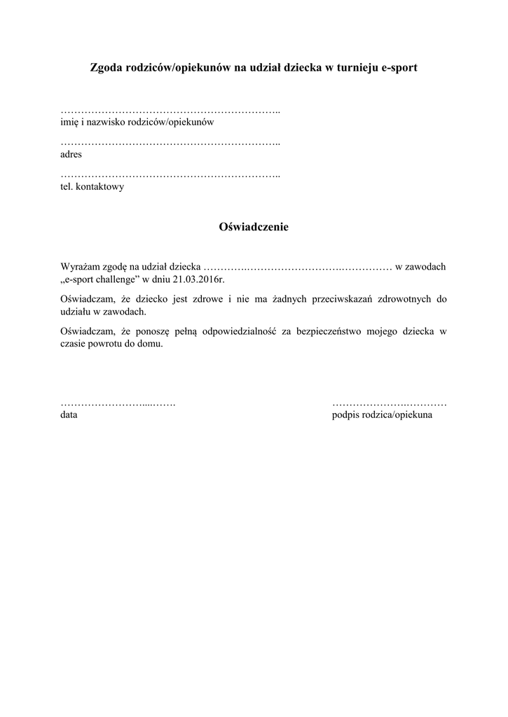 Zgoda rodziców/opiekunów na udział dziecka w turnieju e-sport ……………………………………………………….. imię i nazwisko rodziców/opiekunów ……………………………………………………….. adres ……………………………………………………….. tel. kontaktowy Oświadczenie Wyrażam zgodę na udział dziecka ………….……………………….…………… w zawodach „e-sport challenge” w dniu 21.03.2016r. Oświadczam, że dziecko jest zdrowe i nie ma żadnych przeciwskazań zdrowotnych do udziału w zawodach. Oświadczam, że ponoszę pełną odpowiedzialność za bezpieczeństwo mojego dziecka w czasie powrotu do domu. ……………………....……. data ………………….………… podpis rodzica/opiekuna