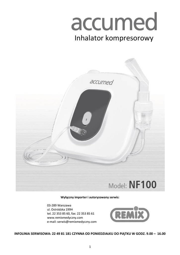 Inhalator kompresorowy Wyłączny importer i autoryzowany serwis: 03-289 Warszawa ul. Ostródzka 199H tel. 22 353 85 60, fax: 22 353 85 61 www.remixmedyczny.com e-mail: [email protected] INFOLINIA SERWISOWA: 22 49 81 181 CZYNNA OD PONIEDZIAŁKU DO PIĄTKU W GODZ. 9.00 – 16.00 1 WPROWADZENIE Dziękujemy za zakup inhalatora kompresorowego accumed NF100. Przy zastosowaniu wskazówek dotyczących użytkowania i przechowywania urządzenie będzie Państwu służyło przez wiele lat i pomagało w utrzymaniu zdrowia. Inhalator ten jest zasilany prądem zmiennym 220V. Terapia za pomocą tego urządzenia przeprowadzana jest szybko, pewnie i wygodnie, dzięki czemu jest ono idealne dla osób w każdym wieku. Zalecamy dokładne zapoznanie się z poniższą instrukcją obsługi , aby dowiedzieć się o wszystkich funkcjach urządzenia. Inhalacje należy wykonywać po konsultacji z lekarzem w celu jak najbardziej efektywnej i pewnej terapii. UWAGA: Inhalator ten jest przeznaczony do leczenia astmy, POChP oraz innych schorzeń układu oddechowego, w których podczas terapii niezbędny jest lek w postaci aerozolu. Proszę skonsultować z lekarzem lub farmaceutą czy przepisany lek jest odpowiedni do stosowania z tego typu inhalatorem. Rodzaj leku, ilość leku i jego dawkowanie musi być określone przez lekarza. Urządzenie accumed NF100 jest zgodne z wymogami Dyrektywy WE 93/42/EWG (Dyrektywa o Wyrobach Medycznych) oraz z Europejskim Standardem EN 13544-1:2007 + A1:2009 Sprzęt do terapii dróg oddechowych – Część 1: Systemy do nebulizacji i ich wyposażenie. Przeczytaj dokładnie instrukcję przed pierwszym użyciem i zachowaj ją na przyszłość. ZASTRZEŻENIA Prosimy o zachowanie ostrożności podczas korzystania z inhalatora. Urządzenie może być wykorzystywane jedynie w celach określonych w niniejszej instrukcji oraz przy użyciu leków wyłącznie przepisanych przez lekarza i w sposób przez niego wskazany. Nie wolno używać inhalatora do systemów znieczulających lub respiracyjnych. OSTRZEŻENIA PROSIMY O PRZECZYTANIE PONIŻSZYCH INFORMACJI PRZED UŻYCIEM - Trzymaj urządzenie z dala od wody w celu uniknięcia porażenia prądem - Nie wolno obsługiwać urządzenia lub trzymać za przewód zasilający mokrymi rękami - Nie wolno zanurzać inhalatora w płynach - Nie wolno korzystać z urządzenia podczas kąpieli - Jeżeli inhalator wpadło do wody, przed wyciągnięciem z wody najpierw odłącz przewód od zasilania - Nie wolno korzystać z urządzenia gdy któryś z jego elementów jest uszkodzony (w tym wtyczka przewodu zasilającego), gdy zostało zamoczone w wodzie lub upadło. Należy się wtedy skontaktować z serwisem. - Z urządzenia nie wolno korzystać w pomieszczeniach, w których znajduje się łatwopalny gaz, tlen lub inne palne produkty w sprayu - Nie wolno zakrywać otworów wentylacyjnych w urządzeniu. Nie wolno ustawiać inhalatora na miękkich powierzchniach, gdzie otwory mogą zostać zasłonięte - Nie należy korzystać z urządzenia gdy nebulizator (pojemnik na lek) jest pusty. - Jeśli pojawi się jakakolwiek nie prawidłowość należy zaprzestać korzystania z urządzenia i skontaktować się z serwisem. - Inhalatora nie wolno pozostawiać bez nadzoru, gdy jest podłączone do zasilania. - Nie wolno uderzać ani potrząsać urządzeniem podczas jego pracy. - Przed czyszczeniem obudowy oraz podczas nalewania leku należy bezwzględnie odłączyć przewód zasilający. - Nie wolno stosować przystawek ani akcesoriów nie zalecanych przez producenta. - Nie wolno samodzielnie rozkręcać ani naprawiać urządzenia. - Nie wolno stosować inhalatora do systemów znieczulających lub respiracyjnych. UWAGI DOTYCZĄCE KORZYSTANIA - Zalecany jest nadzór osób dorosłych podczas korzystania z urządzenia przez dzieci lub osoby niepełnosprawne. - Trzymać wylot strumienia leku z dala od oczu. - Maksymalna pojemność pojemnika na lek (nebulizatora) wynosi 10 ml i nie wolno jej przekraczać. - Nie wolno korzystać z urządzenia podczas prowadzenia pojazdu. - Jeśli pojawia się jakikolwiek dyskomfort lub działanie niepożądane, należy natychmiast zaprzestać używania urządzenia. - Nie wolno korzystać z urządzenia gdy przewód powietrza jest zgięty lub zakrzywiony. - Z urządzeniem nie wolno używać pentamidyny. UWAGI DOTYCZĄCE PRZECHOWYWANIA - Nie wolno przechowywać urządzenia w miejscu narażonym na bezpośrednie działanie promieni słonecznych, wysokiej temperatury czy dużej wilgotności. - Trzymać urządzenie z dala od małych dzieci. - Urządzenie należy odłączyć od zasilania gdy nie jest używane. 2 UWAGI DOTYCZĄCE CZYSZCZENIA - Sprawdź filtr powietrza, nebulizator, ustnik oraz inne dodatkowe wyposażenie przed każdym użyciem inhalatora. Brudne lub zużyte części powinny zostać wymienione na nowe. - Nie wolno zanurzać urządzenia w wodzie. Może to trwale uszkodzić inhalator. - Odłącz urządzenie od zasilania przed czyszczeniem. - Wszystkie niezbędne elementy należy czyścić w sposób opisany w niniejszej instrukcji. - Zawsze wylewaj niewykorzystaną ilość leku z nebulizatora po użyciu. Podczas każdej inhalacji należy używać świeżej dawki leku. - Przewód powietrza należy przechowywać suchy. Każda pozostałość wilgoci lub leku może doprowadzić do infekcji powstałej na skutek pojawienia się bakterii. ZASTRZEŻENIE MEDYCZNE Niniejsza instrukcja obsługi oraz sam produkt w żaden sposób nie zastępują porady lekarza lub innego personelu medycznego. Nie należy wykorzystywać informacji zawartej w niniejszej instrukcji ani tego produktu to diagnozy lub leczenia problemów zdrowotnych, a także do przepisania jakiegokolwiek leku. Jeżeli masz lub podejrzewasz, że masz problem ze zdrowiem, natychmiast skontaktuj się z lekarzem. Okres żywotności poszczególnych elementów przy założeniu codziennego korzystania z produktu do inhalacji 2 ml leku dwa razy dziennie przez 8 minut w temperaturze pokojowej (25oC) wy