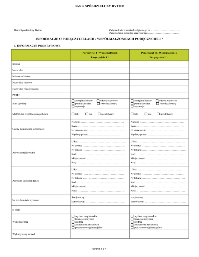 BANK SPÓŁDZIELCZY BYTOM Bank Spółdzielczy Bytom Załącznik do wniosku kredytowego nr ….……………………….. Data złożenia wniosku kredytowego …………………………….. INFORMACJE O PORĘCZYCIELACH / WSPÓŁMAŁŻONKACH PORĘCZYCIELI * I. INFORMACJE PODSTAWOWE Poręczyciel I / Współmałżonek Poręczyciel II / Współmałżonek Poręczyciela I * Poręczyciela II * Imiona Nazwisko Imiona rodziców Nazwisko rodowe Nazwisko rodowe matki PESEL Stan cywilny zamężna/żonaty panna/kawaler separacja Małżeńska wspólnota majątkowa tak Cechy dokumentu tożsamości Adres zameldowania Adres do korespondencji Nr telefonu (do wyboru) nie wdowa/wdowiec rozwiedziona/y nie dotyczy zamężna/żonaty panna/kawaler separacja tak nie wdowa/wdowiec rozwiedziona/y nie dotyczy Nazwa: …………………………………………. Nazwa: ………………………….………………. Seria…………………………………………….. Seria…………………………….……………….. Nr dokumentu: ……………….………………… Nr dokumentu: …………….…….……………… Wydany przez: ................................................ Wydany przez: ................................................. Ulica: ………………………….…………………. Ulica: ……………………………………………... Nr domu: ………………….…………………….. Nr domu: …………………………………………. Nr lokalu………………….……………………… Nr lokalu: …………………….…………………… Kod: ……………………………………………... Kod: …………………………….………………… Miejscowość: …………………….……………… Miejscowość………………….………………….. Kraj: ……………………………………………... Kraj: ………………………….…………………… Ulica……...………………………….…………… Ulica……...…………………….….……………… Nr domu: ……...………………………………… Nr domu: ……...…………………….…………… Nr lokalu: ……...……………...………………… Nr lokalu: ……...…………….…………………… Kod……...………….……….…………………… Kod……...………..…………….………………… Miejscowość: ……...…………………………… Miejscowość: …………....……………………… Kraj: ……...……………………………………… Kraj: ……...…………….………………………… Stacjonarny…………………………….………… stacjonarny: ……………………………………… komórkowy: ………………………….………….. komórkowy: ……………………….……………… E-mail: Wykształcenie wyższe magisterskie licencjat/inżynier średnie zasadnicze zawodowe podstawowe/gimnazjalne Wykonywany zawód strona 1 z 4 wyższe magisterskie licencjat/inżynier średnie zasadnicze zawodowe podstawowe/gimnazjalne Poręczyciel I / Współmałżonek Poręczyciel II / Współmałżonek Poręczyciela I * Poręczyciela II * nie posiadam posiadam POL-Konto ................. Rachunek typu POL-Konto nie posiadam posiadam POL-Konto ................. II. INFORMACJE O DOCHODACH I WYDATKACH Poręczyciel I/ Współmałżonek Poręczyciel II/ Współmałżonek Poręczyciela I * Poręczyciela II * Całkowity staż pracy Okres zatrudnienia u obecnego pracodawcy/czas prowadzenia obecnej dział. gospodarczej Informacje o pracodawcy (nazwa, adres) właściciel firmy wyższa kadra zarządzająca średnia kadra zarządzająca urzędnik specjalista pracownik inne Stanowisko Miesięczny dochód netto (śr. z ost. 3 m-cy): właściciel firmy wyższa kadra zarządzająca średnia kadra zarządzająca urzędnik specjalista pracownik inne ..................................... PLN, w tym: umowa o pracę: .................................... emerytura: ............................................ renta: .................................................... zasiłek przedemerytalny: ...................... wolne zawody: ...................................... działalność gospodarcza: ..................... działalność rolnicza: ............................. umowa cywilno-prawna: ....................... umowa najmu: ...................................... umowa o pracę na czas określony do…….................: ............................... inne: ...................................................... Źródła dochodu ..................................... PLN, w tym: umowa o pracę: ........................................ emerytura: ................................................ renta: ........................................................ zasiłek przedemerytalny: .......................... wolne zawody: .......................................... działalność gospodarcza: ......................... działalność rolnicza: ................................. umowa cywilno-prawna: ........................... umowa najmu: .......................................... umowa o pracę na czas określony do…….................: ................................... inne: ......................................................... Ilość osób w gosp. (w tym dzieci) Ilość osób w gosp. dom. poza Wnioskodawcami uzyskujących udokumentowany dochód: pomiędzy 400 a 1000 PLN: …….. os. powyżej 1000 PLN: …………. os. pomiędzy 400 a 1000 PLN: …….. os. powyżej 1000 PLN: …………. os. Wydatki stałe gosp. domowego Poręczyciel I i Współmałżonek Poręczyciela I oraz Poręczyciel II i Współmałżonek Poręczyciela II należą do tego samego gospodarstwa domowego III. INFORMACJE O ZOBOWIAZANIACH Zobowiązania Kwota zobowiązania** Kwota pozostała do spłaty** Rata miesięczna** Ba