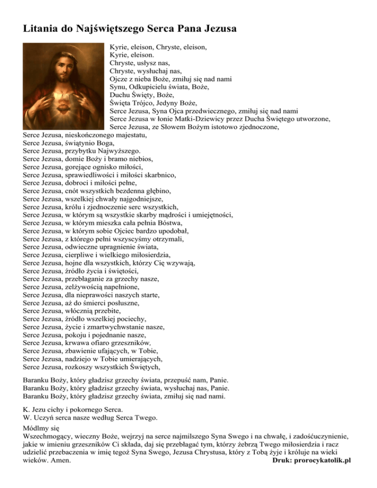 Litania do Najświętszego Serca Pana Jezusa Kyrie, eleison, Chryste, eleison, Kyrie, eleison. Chryste, usłysz nas, Chryste, wysłuchaj nas, Ojcze z nieba Boże, zmiłuj się nad nami Synu, Odkupicielu świata, Boże, Duchu Święty, Boże, Święta Trójco, Jedyny Boże, Serce Jezusa, Syna Ojca przedwiecznego, zmiłuj się nad nami Serce Jezusa w łonie Matki-Dziewicy przez Ducha Świętego utworzone, Serce Jezusa, ze Słowem Bożym istotowo zjednoczone, Serce Jezusa, nieskończonego majestatu, Serce Jezusa, świątynio Boga, Serce Jezusa, przybytku Najwyższego. Serce Jezusa, domie Boży i bramo niebios, Serce Jezusa, gorejące ognisko miłości, Serce Jezusa, sprawiedliwości i miłości skarbnico, Serce Jezusa, dobroci i miłości pełne, Serce Jezusa, cnót wszystkich bezdenna głębino, Serce Jezusa, wszelkiej chwały najgodniejsze, Serce Jezusa, królu i zjednoczenie serc wszystkich, Serce Jezusa, w którym są wszystkie skarby mądrości i umiejętności, Serce Jezusa, w którym mieszka cała pełnia Bóstwa, Serce Jezusa, w którym sobie Ojciec bardzo upodobał, Serce Jezusa, z którego pełni wszyscyśmy otrzymali, Serce Jezusa, odwieczne upragnienie świata, Serce Jezusa, cierpliwe i wielkiego miłosierdzia, Serce Jezusa, hojne dla wszystkich, którzy Cię wzywają, Serce Jezusa, źródło życia i świętości, Serce Jezusa, przebłaganie za grzechy nasze, Serce Jezusa, zelżywością napełnione, Serce Jezusa, dla nieprawości naszych starte, Serce Jezusa, aż do śmierci posłuszne, Serce Jezusa, włócznią przebite, Serce Jezusa, źródło wszelkiej pociechy, Serce Jezusa, życie i zmartwychwstanie nasze, Serce Jezusa, pokoju i pojednanie nasze, Serce Jezusa, krwawa ofiaro grzeszników, Serce Jezusa, zbawienie ufających, w Tobie, Serce Jezusa, nadziejo w Tobie umierających, Serce Jezusa, rozkoszy wszystkich Świętych, Baranku Boży, który gładzisz grzechy świata, przepuść nam, Panie. Baranku Boży, który gładzisz grzechy świata, wysłuchaj nas, Panie. Baranku Boży, który gładzisz grzechy świata, zmiłuj się nad nami. K. Jezu cichy i pokornego Serca. W. Uczyń serca nasze według Serca Twego. Módlmy się Wszechmogący, wieczny Boże, wejrzyj na serce najmilszego Syna Swego i na chwałę, i zadośćuczynienie, jakie w imieniu grzeszników Ci składa, daj się przebłagać tym, którzy żebrzą Twego miłosierdzia i racz udzielić przebaczenia w imię tegoż Syna Swego, Jezusa Chrystusa, który z Tobą żyje i króluje na wieki wieków. Amen. Druk: prorocykatolik.pl