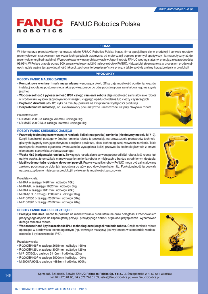 fanuc.automatykab2b.pl FANUC Robotics Polska FIRMA W informatorze przedstawiamy najnowszą ofertę FANUC Robotics Polska. Nasza firma specjalizuje się w produkcji i serwisie robotów przemysłowych stosowanych we wszystkich gałęziach przemysłu: od motoryzacji poprzez przemysł spożywczy i farmaceutyczny aż do przemysłu energii odnawialnej. Wyprodukowane w naszych fabrykach w Japonii roboty FANUC według statystyk pracują z niezawodnością 99,99%. W Polsce pracuje ponad 900, a na świecie ponad 210 tysięcy robotów FANUC. Najczęściej stosowane są w procesach produkcyjnych, gdzie ważna jest powtarzalność jakości, zachowanie bezpieczeństwa pracy, a także szybkie zmiany i przezbrojenia w produkcji. PRODUKTY ROBOTY FANUC MAŁEGO ZASIĘGU Kompaktowe wymiary i mała masa własna wynosząca około 27kg dają możliwość obniżenia kosztów instalacji robota na postumencie, a także powieszonego do góry podstawą oraz zainstalowanego na szynie jezdnej Wodoszczelność i pyłoszczelność IP67 całego ramienia robota daje możliwość zainstalowanie robota w środowisku wysoko zapylonym lub w miejscu ciągłego opadu chłodziwa lub cieczy czyszczących Prędkość działania (do 120 cykli na minutę) pozwala na zwiększenie wydajności produkcji Bezproblemowa instalacja, np. elektrozawory pneumatyczne umieszczone tuż przy chwytaku robota Przedstawiciele: LR MATE 200iC o zasięgu 704mm i udźwigu 5kg LR MATE 200iC/5L o zasięgu 892mm i udźwigu 5kg ROBOTY FANUC ŚREDNIEGO ZASIĘGU Przewody technologiczne wewnątrz ramienia i kiści (nadgarstka) ramienia (nie dotyczy modelu M-710). Dzięki konstrukcji pustego w środku ramienia roboty te pozwalają na prowadzenie przewodów technologicznych (sygnały sterujące chwytaka, sprężone powietrze, ciecz technologiczna) wewnątrz ramienia. Takie rozwiązanie znacznie ogranicza ewentualność wystąpienia kolizji przewodów technologicznych z innymi elementami stanowiska zrobotyzowanego. Wąska kiść (nadgarstek) ramienia. Ze względu na oddalenie serwonapędów od kiści robota, kiść robota jest na tyle wąska, że umożliwia manewrowanie ramienia robota w miejscach o bardzo utrudnionym dostępie. Możliwość montażu robota w dowolnej pozycji. Prawie wszystkie roboty FANUC mogą być zainstalowane zarówno podstawą do dołu, jak i podstawą do góry, pod dowolnym kątem itd. Funkcjonalność ta pozwala na zaoszczędzenie miejsca na produkcji i zwiększenie możliwości zastosowań. Przedstawiciele: M-10iA o zasięgu 1420mm i udźwigu 10kg M-10iA/6L o zasięgu 1632mm i udźwigu 6kg M-20iA o zasięgu 1811mm i udźwigu 20kg M-20iA/10L o zasięgu 2009mm i udźwigu 10kg M-710iC/50 o zasięgu 2050mm i udźwigu 50kg M-710iC/70 o zasięgu 2050mm i udźwigu 70kg ROBOTY FANUC DALEKIEGO ZASIĘGU Precyzja działania. Cecha ta pozwala na manewrowanie produktami na duże odległości z zachowaniem precyzyjnego dojścia do zapamiętanej pozycji i precyzyjnego doboru prędkości przyspieszeń i wyhamowań dużego ramienia robota. Wodoszczelność i pyłoszczelność IP67 technologicznej części ramienia robota. Część ramienia robota operująca w środowisku technologicznym (np. wewnątrz maszyny) jest wykonana w standardzie wodoszczelności i pyłoszczelności IP67. Przedstawiciele: R-2000iB/165F o zasięgu 2655mm i udźwigu 165kg R-2000iB/125L o zasięgu 3005mm i udźwigu 125kg M-710iC/20L o zasięgu 3110mm i udźwigu 20kg R-2000iB/100P o zasięgu 3500mm i udźwigu 100kg M-2000iA/900L o zasięgu 4683mm i udźwigu 900kg 146 Sprzedaż, Szkolenia, Serwis: FANUC Robotics Polska Sp. z o.o., ul. Strzegomska 2–4, 53-611 Wrocław tel. 071 776 61 60, faks 071 776 61 69, [email protected], www.fanucrobotics.pl I N F O R M AT O R R Y N KO W Y AU T O M AT Y K I 2010 ROBOTY FANUC O DUŻYM UDŹWIGU Dowolne możliwości manewrowania dużymi gabarytami. Największe roboty FANUC pozwalają na manewrowanie produktami o masie ponad tony i dużych gabarytach na odległości kilku metrów. Zastosowanie swobodnie programowalnego robota zamiast systemu wyspecjalizowanych wind i przenośników pozwala na uelastycznienie procesu produkcyjnego i dostosowanie parku maszynowego do bieżących potrzeb klienta. Przedstawiciele: M-900iA/600 o zasięgu 2832mm i udźwigu 600kg M-2000iA/1200 o zasięgu 3734mm i udźwigu 1350kg (rekord świata zarejestrowany w Księdze Rekordów Guinnessa!) ROBOTY FANUC WYSPECJALIZOWANE W PALETYZACJI Przewody technologiczne wewnątrz ramienia i kiści (nadgarstka) ramienia. Dzięki konstrukcji pustego w środku ramienia i nadgarstka roboty te pozwalają na prowadzenie przewodów technologicznych (sygnały sterujące chwytaka, sprężone powietrze) wewnątrz ramienia. Takie rozwiązanie znacznie ogranicza ewentualność wystąpienia kolizji przewodów technologicznych z innymi elementami stanowiska zrobotyzowanego a przede wszystkim wydłuża trwałość okablowania – przewody są poddawane skręcaniu zamiast rozciąganiu. Podstawa zwiększająca zasięg – gratis. FANUC Robotics dostarcza podstawę pod robota paletyzującego gratis, dzieki czemu klienci bez ponoszenia dodatkowych kosztów mogą korzystać z pełnego zasięgu robota paletyzującego i od razu po zakupie paletyzować produkty do pełnej wysokości palety (około 2800mm). Niskie zapotrzebowanie na energię. Roboty paletyzujące FANUC charakteryzują się średnim zużyciem energii elektrycznej 2,5 kW. Przedstawiciele: M-420iA o zasięgu 1855mm i udźwigu 40kg M-410iB/160 o zasięgu 3143mm i udźwigu 160kg M-410iB/300 o zasięgu 3143mm i udźwigu 300kg M-410iB/450 o zasięgu 3130mm i udźwigu 450kg M-410iB/700 o zasięgu 3143mm i udźwigu 700kg ROBOTY FANUC WYSPECJALIZOWANE W LAKIEROWANIU (STREFA EX) Certyfikat Ex kat II. Roboty lakiernicze FANUC są dopuszczone do pracy w środowisku zagrożonym wybuchem według certyfikatu ATEX kategorii II. Smukła konstrukcja ramienia robota pozwala na penetrowanie lakierem trudno dostępnych przestrzeni. Oszczędność zużycia lakier