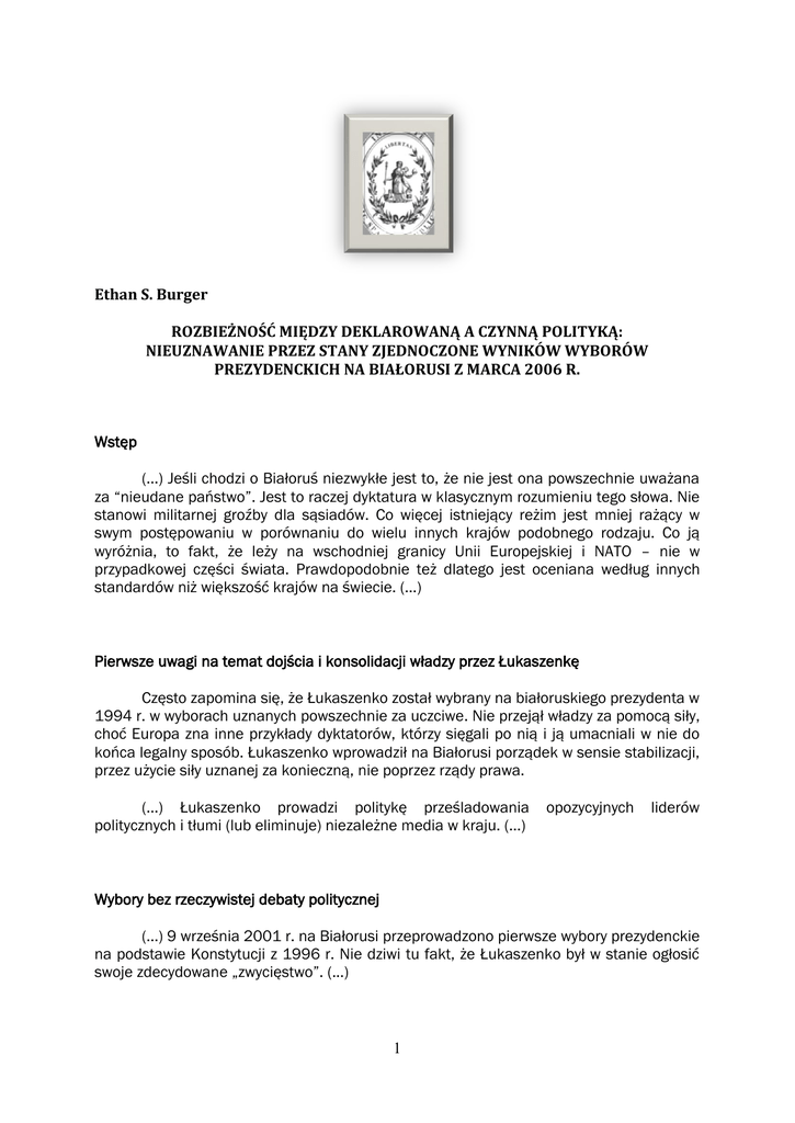 Ethan S. Burger ROZBIEŻNOŚĆ MIĘDZY DEKLAROWANĄ A CZYNNĄ POLITYKĄ: NIEUZNAWANIE PRZEZ STANY ZJEDNOCZONE WYNIKÓW WYBORÓW PREZYDENCKICH NA BIAŁORUSI Z MARCA 2006 R. Wstęp (...) Jeśli chodzi o Białoruś niezwykłe jest to, że nie jest ona powszechnie uważana za “nieudane państwo”. Jest to raczej dyktatura w klasycznym rozumieniu tego słowa. Nie stanowi militarnej groźby dla sąsiadów. Co więcej istniejący reżim jest mniej rażący w swym postępowaniu w porównaniu do wielu innych krajów podobnego rodzaju. Co ją wyróżnia, to fakt, że leży na wschodniej granicy Unii Europejskiej i NATO – nie w przypadkowej części świata. Prawdopodobnie też dlatego jest oceniana według innych standardów niż większość krajów na świecie. (...) Pierwsze uwagi na temat dojścia i konsolidacji władzy przez Łukaszenkę Często zapomina się, że Łukaszenko został wybrany na białoruskiego prezydenta w 1994 r. w wyborach uznanych powszechnie za uczciwe. Nie przejął władzy za pomocą siły, choć Europa zna inne przykłady dyktatorów, którzy sięgali po nią i ją umacniali w nie do końca legalny sposób. Łukaszenko wprowadził na Białorusi porządek w sensie stabilizacji, przez użycie siły uznanej za konieczną, nie poprzez rządy prawa. (...) Łukaszenko prowadzi politykę prześladowania politycznych i tłumi (lub eliminuje) niezależne media w kraju. (...) opozycyjnych liderów Wybory bez rzeczywistej debaty politycznej (...) 9 września 2001 r. na Białorusi przeprowadzono pierwsze wybory prezydenckie na podstawie Konstytucji z 1996 r. Nie dziwi tu fakt, że Łukaszenko był w stanie ogłosić swoje zdecydowane „zwycięstwo”. (...) 1 (...) OBWE stwierdziła w raporcie, że wybory nie były ani wolne, ani uczciwe; pogwałciły zarówno białoruskie zobowiązania wobec OBWE jak i międzynarodowe standardy. (...) Czynniki ułatwiające Łukaszence konsolidację władzy(...) W kolejnych latach Łukaszenko poczynił stanowcze kroki w celu pozbawienia opozycji infrastruktury, przez którą mogła stanowić zagrożenie. Coraz bardziej podpierał się systemem prawnym, gdyż mógł w ten sposób zastraszać białoruską prasę procesami o „pomówienie” i zamykaniem nawet za najmniejsze wykroczenia. W miarę jak rosły represje coraz więcej osób obawiało się konsekwencji dla swoich rodzin, jeśli kontynuowaliby swoją działalność. (...) Otrzymanie wygodnej legislacji i prawa do bycia dożywotnim prezydentem Jedną z metod zapewnienia sobie wygodnego prawodawstwa jest powstrzymanie opozycji przed umieszczeniem swoich kandydatów na kartach do głosowania. (...) (...) Po wielu latach, w których OBWE nie mogła swobodnie działać na Białorusi, rząd Łukaszenki doszedł do wniosku, że jeśli OBWE będzie obserwować wybory ustawodawcze, będzie to służyć jego interesom. (...) (...) Niemal po trzech latach obie izby amerykańskiego Kongresu anonimowo przegłosowały Akt Demokracji Białoruskiej (BDA) (...). Niepokój Łukaszenki wobec zmian na Ukrainie (...) Łukaszenko nie chciał nawet myśleć o żadnych zmianach. Aby zredukować ryzyko, które była w stanie stworzyć białoruska opozycja polityczna, spowodował, że Parlament przyśpieszył datę następnych wyborów prezydenckich o cztery miesiące, z lipca na marzec 2006 r. To działanie przyniosło wiele rezultatów. (...) Jednakże tzw. Pomarańczowa Rewolucja sprawiła, że niektórzy na Białorusi zaczęli wierzyć w możliwość politycznej zmiany w ich kraju. (...) Opozycyjna kampania dla serc i umysłów Białorusinów Jest takie stare powiedzenie: wystarczy jeden charyzmatyczny szaleniec, aby zamienić trzydziestu tchórzy w waleczną siłę. Wydaje się, że Łukaszenko podjął wszelkie niezbędne środki, aby taka charyzmatyczna jednostka nigdy nie powstała na Białorusi. (...) Działania Łukaszenki w celu uniknięcia ryzyka Dnia 17 sierpnia 2005 r. Łukaszenko wydał dekret ustanawiający nowe restrykcje na zagraniczną pomoc techniczną dla Białorusi. Dekret ten zabrania organizacjom i jednostkom otrzymywania i korzystania z pomocy w przygotowywaniu i przeprowadzaniu wyborów i referendów, powoływaniu deputowanych i członków Rady Republiki, 2 organizowaniu zgromadzeń, pochodów, marszów ulicznych, demonstracji, pikiet, strajków, produkowaniu i dystrybucji materiałów do kampanii i innych form masowej polityki wśród społeczeństwa. To stworzyło podstawę prawną do wprowadzenia zakazu pomocy w formie organizowania seminariów, konferencji i publicznych dyskusji. (...) Łukaszenko był pewien swojej zdolności do zwycięstwa nawet w przypadku, gdyby miał zmuszać do tego społeczeństwo lub użyć przeciwko niemu siły. (...) Przygotowanie wsparcia dla zapewnienia pożądanych rezultatów Jak większość dyktatorów, Łukaszenko jest także politykiem, który wie, jak oddziaływać na poszczególne warstwy społeczeństwa. Wszedł on na scenę polityczną dzięki potępieniu korupcji. (...) Powszechnie przyjmuje się, że Łukaszenko cieszy się poparciem większości białoruskich obywateli. Ten pogląd jest powtarzany tak często, że jest przyjmowany za fakt, pomimo że nie ma możliwości jego weryfikacji. Rząd Łukaszenki przez całe lata tworzył strategię mającą zapewnić mu pożądane wyników wyborów. (...) Powyborcze manewry Ekonomiści i polityczni analitycy przeprowadzili badania nad relacją zależności gospodarczej Białorusi od Rosji. (...) Wielu uważa, że dzięki temu, iż ceny za gaz i ropę są niższe od cen rynkowych, białoruska gospodarka jest w znacznie lepszym stanie. Co więcej, Rosja zapewnia rynek wielu białoruskim producentom. (...) W porównaniu ze Stanami Zjednoczonymi kraje Unii Europejskiej prowadzą znacznie bardziej ostrożną politykę w stosunku do Białorusi, bez względu na ich oficjalne deklaracje. Łotwa, Litwa i Polska, które bezpośrednio sąsiadują z Białorusią, są najbardziej odważne w publicznym krytyk