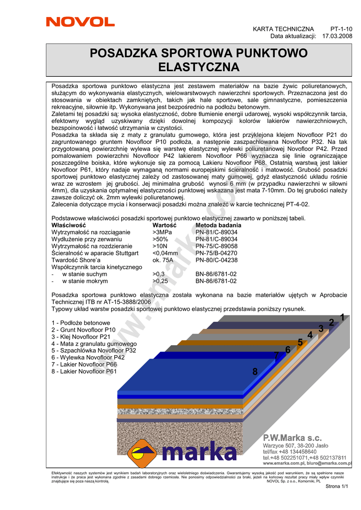 KARTA TECHNICZNA PT-1-10 Data aktualizacji: 17.03.2008 POSADZKA SPORTOWA PUNKTOWO ELASTYCZNA .co m. pl Posadzka sportowa punktowo elastyczna jest zestawem materiałów na bazie Ŝywic poliuretanowych, słuŜącym do wykonywania elastycznych, wielowarstwowych nawierzchni sportowych. Przeznaczona jest do stosowania w obiektach zamkniętych, takich jak hale sportowe, sale gimnastyczne, pomieszczenia rekreacyjne, siłownie itp. Wykonywana jest bezpośrednio na podłoŜu betonowym. Zaletami tej posadzki są: wysoka elastyczność, dobre tłumienie energii udarowej, wysoki współczynnik tarcia, efektowny wygląd uzyskiwany dzięki dowolnej kompozycji kolorów lakierów nawierzchniowych, bezspoinowość i łatwość utrzymania w czystości. Posadzka ta składa się z maty z granulatu gumowego, która jest przyklejona klejem Novofloor P21 do zagruntowanego gruntem Novofloor P10 podłoŜa, a następnie zaszpachlowana Novofloor P32. Na tak przygotowaną powierzchnię wylewa się warstwę elastycznej wylewki poliuretanowej Novofloor P42. Przed pomalowaniem powierzchni Novofloor P42 lakierem Novofloor P66 wyznacza się linie ograniczające poszczególne boiska, które wykonuje się za pomocą Lakieru Novofloor P68. Ostatnią warstwą jest lakier Novofloor P61, który nadaje wymaganą normami europejskimi ścieralność i matowość. Grubość posadzki sportowej punktowo elastycznej zaleŜy od zastosowanej maty gumowej, gdyŜ elastyczność układu rośnie wraz ze wzrostem jej grubości. Jej minimalna grubość wynosi 6 mm (w przypadku nawierzchni w siłowni 4mm), dla uzyskania optymalnej elastyczności punktowej wskazana jest mata 7-10mm. Do tej grubości naleŜy zawsze doliczyć ok. 2mm wylewki poliuretanowej. Zalecenia dotyczące mycia i konserwacji posadzki moŜna znaleźć w karcie technicznej PT-4-02. ma rka Podstawowe właściwości posadzki sportowej punktowo elastycznej zawarto w poniŜszej tabeli. Właściwość Wartość Metoda badania Wytrzymałość na rozciąganie >3MPa PN-81/C-89034 WydłuŜenie przy zerwaniu >50% PN-81/C-89034 Wytrzymałość na rozdzieranie >10N PN-75/C-89058 Ścieralność w aparacie Stuttgart <0,04mm PN-75/B-04270 Twardość Shore’a ok. 75A PN-80/C-04238 Współczynnik tarcia kinetycznego - w stanie suchym >0,3 BN-86/6781-02 - w stanie mokrym >0,25 BN-86/6781-02 ww w.e Posadzka sportowa punktowo elastyczna została wykonana na bazie materiałów ujętych w Aprobacie Technicznej ITB nr AT-15-3888/2006 Typowy układ warstw posadzki sportowej punktowo elastycznej przedstawia poniŜszy rysunek. 1 - PodłoŜe betonowe 2 - Grunt Novofloor P10 3 - Klej Novofloor P21 4 - Mata z granulatu gumowego 5 - Szpachlówka Novofloor P32 6 - Wylewka Novofloor P42 7 - Lakier Novofloor P66 8 - Lakier Novofloor P61 7 6 5 4 3 2 1 8 Efektywność naszych systemów jest wynikiem badań laboratoryjnych oraz wieloletniego doświadczenia. Gwarantujemy wysoką jakość pod warunkiem, Ŝe są spełnione nasze instrukcje i Ŝe praca jest wykonana zgodnie z zasadami dobrego rzemiosła. Nie ponosimy odpowiedzialności za braki, jeŜeli na końcowy rezultat pracy miały wpływ czynniki znajdujące się poza naszą kontrolą. NOVOL Sp. z o.o., Komorniki, PL Strona 1/1