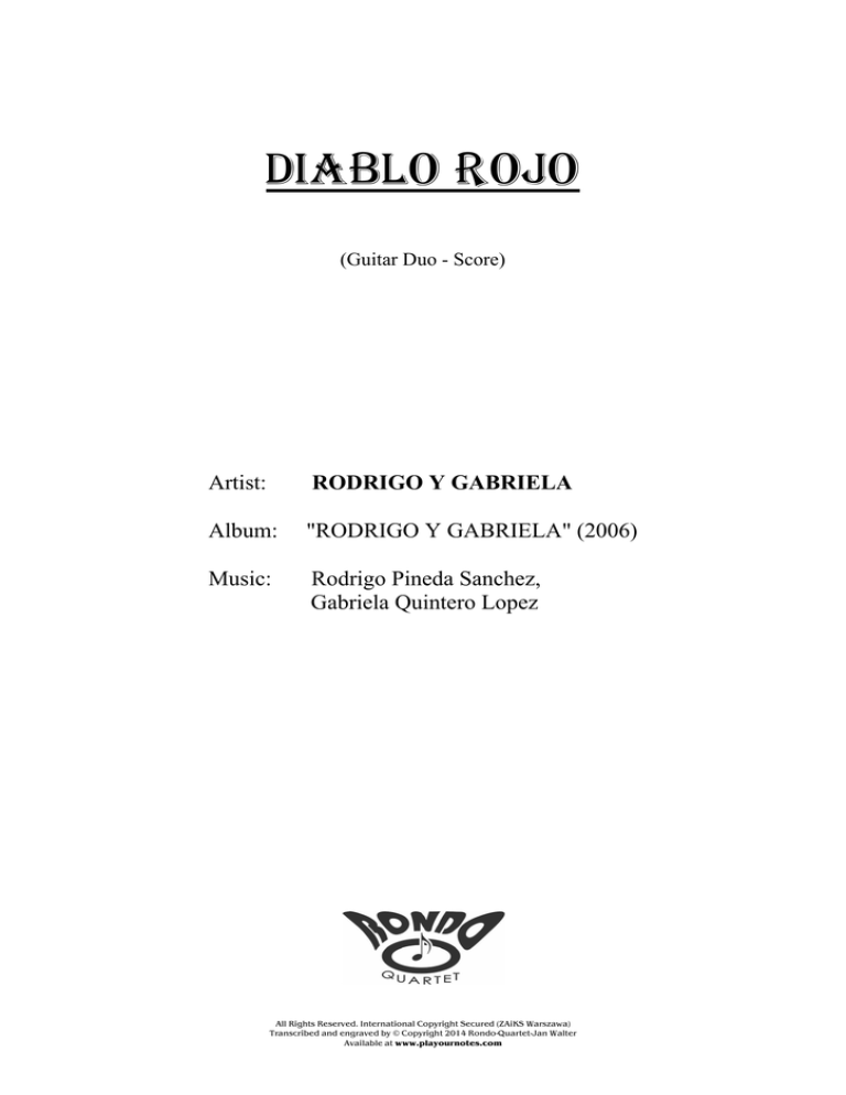 DIABLO ROJO (Guitar Duo - Score) Artist: RODRIGO Y GABRIELA Album: "RODRIGO Y GABRIELA" (2006) Music: Rodrigo Pineda Sanchez, Gabriela Quintero Lopez All Rights Reserved. International Copyright Secured (ZAiKS Warszawa) Transcribed and engraved by © Copyright 2014 Rondo-Quartet-Jan Walter Available at www.playournotes.com DIABLO ROJO 1 GUITAR DUO from "RODRIGO Y GABRIELA" (2006) A 1 GUITAR 1 Music by Rodrigo Pineda Sanchez, Gabriela Quintero Lopez RODRIGO Y GABRIELA q»¡£• V 44 ‚ ‚ ‚ ‚ ‚ ‚ ‚ ‚ ‚ ‚ ‘ Percussion effect GUITAR 2 ‘ > >> > > > > > > > > > > > > > V 44 ‚ ‚ ‚ ‚ ‚ ‚ ‚ ‚ ‚ ‚ ‚ ‚ ‚ ‚ ‚ ‚ ‚ ‚ ‚ ‚ ‚ ‚ ‚ ‚ ‚ ‚ ‘ Percussion effect 5 Gtr 1 3 V ‘ > > > 3 > V‚ ‚‚‚‚ ‚ ‚ ‚‚‚‚ ‚ Gtr 2 ‘ > > > > > >> œœœ ‚ ‚ ‚ ‚ ‚ ‚ ‚ ‚ ‚ ‚ ‚ œœœ œœœ œœœ 3 3 ‘ ‘ ‚‚ ‚ ‚ ‚‚ ‚ ‚ ‚‚ ‚ ‚ ‚‚ ‚ ‘ ‘ œœ œœ > > > 3 > ‚ ‚ ‚ ‚ ‚ ‚‚‚‚ 3 B 9 Gtr 1 Gtr 2 # œ. œ œ . œ. œ œ. œ. # œ œ œ. . œ. œ œ. œ b œ œ b œ ‰ œ ‰ œ œ œ œ œ œ œ ≈ œ œ≈ ≈ ≈ œ œ≈ œ‰ ≈œœ V œ‰ ≈œœ > > > > > > > > V ‚‚‚‚‚‚‚‚‚‚‚‚‚‚‚‚ œ bœ V œ‰ œ≈œœœ ‰ ≈œœ 13 Gtr 1 Gtr 2 ‘ > > > > > > > ‚ ‚ ‚ ‚ ‚ ‚ ‚ ‚ ‚ ‚ ‚ ‚ ‚ œœ œœ ‘ . . œ. œ >œ œ. œ œ œ. œ ≈ # œ ≈ œ œ œ ‰ œ ≈ œ œ œ œ ‰ b œ ≈ œ œ œ. œ œ œ œ œ # œ > > > > > > > > V ‚‚‚‚‚‚‚‚‚‚‚‚‚‚‚‚ 3 3 ‘ > > > > > > > > ‚ ‚ ‚ ‚ ‚ ‚ ‚ ‚ ‚ ‚ ‚ ‚ ‚ ‚ ‚ ‚ Œ Œ > ‚‚ . œ. œ œ. œ. # œ œ œ. . œ. œ œ. # œ. œ œ œ b œ œ b œ ‰ œ ‰ œ œ œ œ œ œ œ ≈ œ œ≈ ≈ ≈ œ œ≈ œ‰ ≈œœ V œ‰ ≈œœ 17 Gtr 1 Gtr 2 R.Q. œ œ œ œœ V œœœ Û Û œœ Û Û œœœœ Û Û ¿ œœœ œœœ œ ¿ œœ œœ Û Û # œœœœ Û ¿ œ œœ œœ œœ Û Û œœœ œœœ ¿œ ¿œ œœœ œœ œœ Û Û œœ ¿ œœ Û Û œœœ Û Û All Rights Reserved. International Copyright Secured (ZAiKS Warszawa) Transcribed and engraved by © Copyright 2014 Rondo-Quartet-Jan Walter Available at www.playournotes.com œœ œœ œœ ¿ œœ œœ œœ œœ œœ Û Û # œœœœ Û ¿ œ œœ œ œœ Û n œœœ Û ¿ œ ¿ J.W.