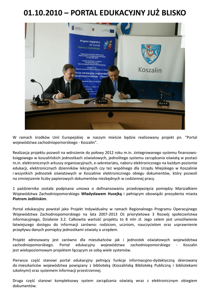01.10.2010 – PORTAL EDUKACYJNY JUŻ BLISKO W ramach środków Unii Europejskiej w naszym mieście będzie realizowany projekt pn. "Portal województwa zachodniopomorskiego - Koszalin". Realizacja projektu pozwoli na wdrożenie do połowy 2012 roku m.in. zintegrowanego systemu finansowoksięgowego w koszalioskich jednostkach oświatowych, jednolitego systemu zarządzania oświatą w postaci m.in. elektronicznych arkuszy organizacyjnych, e-sekretariatu, naboru elektronicznego na każdym poziomie edukacji, elektronicznych dzienników lekcyjnych czy też wspólnego dla Urzędu Miejskiego w Koszalinie i wszystkich jednostek oświatowych w Koszalinie elektronicznego obiegu dokumentów, który pozwoli na zmniejszenie liczby papierowych dokumentów niezbędnych w codziennej pracy. 1 października została podpisana umowa o dofinansowaniu przedsięwzięcia pomiędzy Marszałkiem Województwa Zachodniopomorskiego Władysławem Husejką i pełniącym obowiązki prezydenta miasta Piotrem Jedlińskim. Portal edukacyjny powstał jako Projekt Indywidualny w ramach Regionalnego Programu Operacyjnego Województwa Zachodniopomorskiego na lata 2007-2013 Oś priorytetowa 3 Rozwój społeczeostwa informacyjnego, Działanie 3.2. Całkowita wartośd projektu to 8 mln zł. Jego celem jest umożliwienie łatwiejszego dostępu do informacji zarówno: rodzicom, uczniom, nauczycielom oraz usprawnienie przepływu danych pomiędzy jednostkami oświaty a urzędem. Projekt adresowany jest zarówno dla mieszkaoców jak i jednostek oświatowych województwa zachodniopomorskiego. Portal edukacyjny województwa zachodniopomorskiego - Koszalin jest wielopoziomowym projektem łączącym ze sobą wiele systemów. Pierwsza częśd stanowi portal edukacyjny pełniący funkcje informacyjno-dydaktyczną skierowany do mieszkaoców województwa powiązany z biblioteką (Koszalioską Biblioteką Publiczną i bibliotekami szkolnymi) oraz systemem informacji przestrzennej. Druga częśd stanowi kompleksowy system zarządzania oświatą wraz z elektronicznym obiegiem dokumentów.