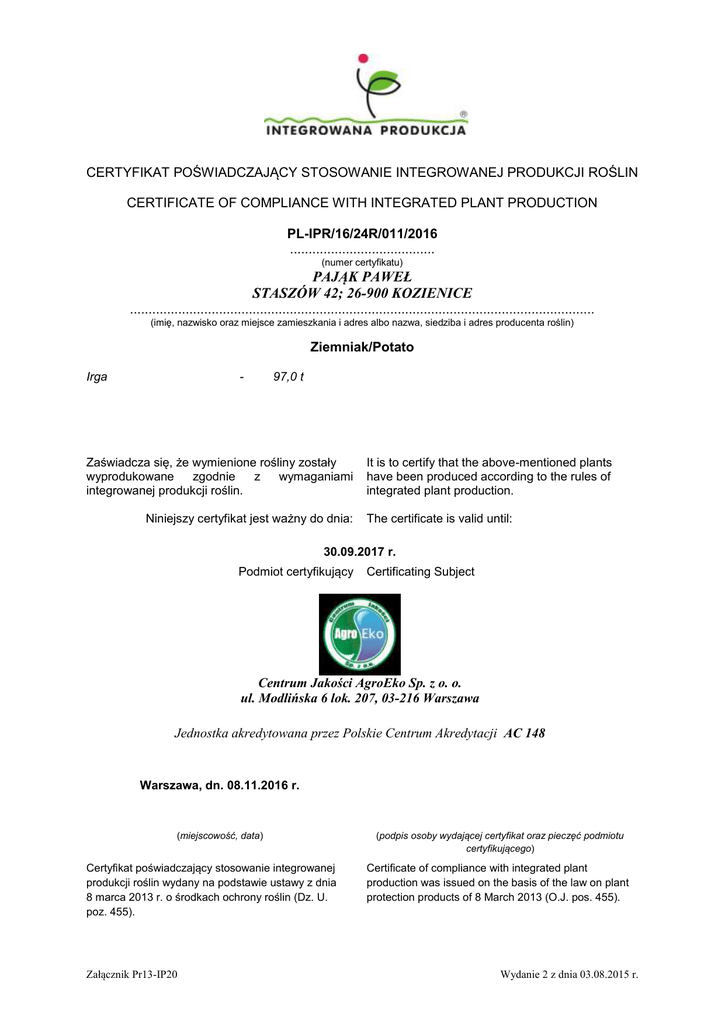 CERTYFIKAT POŚWIADCZAJĄCY STOSOWANIE INTEGROWANEJ PRODUKCJI ROŚLIN CERTIFICATE OF COMPLIANCE WITH INTEGRATED PLANT PRODUCTION PL-IPR/16/24R/011/2016 ....................................... (numer certyfikatu) PAJĄK PAWEŁ STASZÓW 42; 26-900 KOZIENICE ............................................................................................................................. (imię, nazwisko oraz miejsce zamieszkania i adres albo nazwa, siedziba i adres producenta roślin) Ziemniak/Potato Irga - 97,0 t Zaświadcza się, że wymienione rośliny zostały wyprodukowane zgodnie z wymaganiami integrowanej produkcji roślin. Niniejszy certyfikat jest ważny do dnia: It is to certify that the above-mentioned plants have been produced according to the rules of integrated plant production. The certificate is valid until: 30.09.2017 r. Podmiot certyfikujący Certificating Subject Centrum Jakości AgroEko Sp. z o. o. ul. Modlińska 6 lok. 207, 03-216 Warszawa Jednostka akredytowana przez Polskie Centrum Akredytacji AC 148 Warszawa, dn. 08.11.2016 r. (miejscowość, data) Certyfikat poświadczający stosowanie integrowanej produkcji roślin wydany na podstawie ustawy z dnia 8 marca 2013 r. o środkach ochrony roślin (Dz. U. poz. 455). Załącznik Pr13-IP20 (podpis osoby wydającej certyfikat oraz pieczęć podmiotu certyfikującego) Certificate of compliance with integrated plant production was issued on the basis of the law on plant protection products of 8 March 2013 (O.J. pos. 455). Wydanie 2 z dnia 03.08.2015 r.