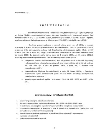XI WW 4191-12/12 S p r a w o z d a n i e z kontroli funkcjonowania sekretariatu I Wydziału Cywilnego Sądu Rejonowego w Rudzie Śląskiej, przeprowadzonej przez starszego inspektora ds. biurowości sądowej Ewę Kanczok w dniach 2-4, 11-20 kwietnia 2012r., zakończonej w dniach 24-25 maja 2012r. – zgodnie z delegacją Prezesa Sądu Okręgowego w Gliwicach nr 1530-288/12 z dnia 22 marca 2012r. Kontrolę przeprowadzono w ramach planu pracy na rok 2012, w oparciu o przepisy § 9 oraz 21 rozporządzenia Ministra Sprawiedliwości z dnia 25 października 2002r. w sprawie trybu sprawowania nadzoru nad działalnością administracyjną sądów (Dz.U. Nr 187 z 2002r. poz.1564 z późn. zm.). Objęła ona działalność sekretariatu w okresie od kwietnia 2009r. do marca 2012r. (w zakresie ruchu spraw okres od 1 stycznia 2009r. do 31 marca 2012r.), w szczególności zbadano prawidłowość stosowania wytycznych zawartych w: • zarządzeniu Ministra Sprawiedliwości z dnia 12 grudnia 2003r. w sprawie organizacji i zakresu działania sekretariatów sądowych oraz innych działów administracji sądowej (Dz. Urz. Min. Spr. z dnia 31 grudnia 2003r. z późn. zm.) – zwanym dalej „zarządzeniem M.S.”, • rozporządzeniu Ministra Sprawiedliwości z dnia 23 lutego 2007r. – Regulamin urzędowania sądów powszechnych (Dz.U. Nr 38 z 2007r. poz.249) – zwanym dalej „regulaminem sądowym ”, • ustawie o pracownikach sądów i prokuratury (Dz.U. Nr 162 z 1998 poz.1125 z późn. zm.). Zakres czasowy i tematyczny kontroli 1. Sprawy organizacyjne, obsada sekretariatu 2. Ruch spraw w wydziale ogólnie w okresie od 1.01.2009r. do 31.03.2012r. oraz w rozbiciu na poszczególne repertoria/wykazy; średnie obciążenie pracowników 3. Urządzenia ewidencyjne w wydziale – stan i sposób ich prowadzenia (tradycyjne oraz prowadzone w systemie informatycznym) 4. Sposób prowadzenia akt sądowych, prawidłowość i terminowość wykonywania czynności sekretarskich 5. Podsumowanie wyników kontroli 1 Podsumowanie wyników kontroli Przeprowadzona kontrola wykazała, iż pracę sekretariatu można ogólnie ocenić jako dobrą. Zastosowano się do wszystkich zaleceń zawartych w sprawozdaniu pokontrolnym z kontroli funkcjonowania sekretariatu przeprowadzonej w roku 2009, wyeliminowano stwierdzone wówczas nieprawidłowości przy prowadzeniu akt. Obecnie pracownicy sekretariatu zamieszczają adnotacje o wykonaniu przy każdego rodzaju zarządzeniach sędziego, adnotacje te każdorazowo opatrywane są datą i czytelnym podpisem bądź skróconym podpisem i pieczęcią z imieniem oraz nazwiskiem podpisującego (§ 16 zarządzenia M.S.), w aktach pozostawiane są podpisane kopie wysyłanych pism z zamieszczoną na nich adnotacją o dacie wysłania (§ 19 oraz § 20 zarządzenia M.S.), a w przypadku konieczności zmiany numeracji kart czyni się każdorazowo wzmiankę o przyczynie (§ 30 ust. 3 zarządzenia M.S.). W sekretariacie wyraźnie widoczne jest przestrzeganie dyscypliny i kultury pracy. Kierownik sekretariatu z wielkim zaangażowaniem wywiązuje się z nałożonego nań obowiązku planowania i organizowania pracy sekretariatu. Reaguje błyskawicznie na nowe okoliczności, wprowadza bezzwłocznie zmiany w organizacji pracy jak i w podziale czynności podległych pracowników, przestrzegając przy tym każdorazowo zasady równomiernego obciążenia. Wszyscy aktualni pracownicy kontrolowanego sekretariatu wykazują duże zaangażowanie w sumienne, sprawne i terminowe wykonanie każdej powierzonej im czynności – co wskazuje wyraźnie na postępowanie zgodne z art. 6 ustawy z dnia 18 grudnia 1998r. o pracownikach sądów i prokuratury. Stwierdzone drobne uchybienia w zakresie prowadzenia urządzeń ewidencyjnych – zarówno tradycyjnych jak i w systemie informatycznym – zostały usunięte (w zakresie, w jakim było to możliwe) jeszcze w trakcie trwania kontroli. Również bezzwłocznie zareagowano na wskazane niedokładności przy wykonywaniu czynności sekretarskich. Znacznemu pogorszeniu w kontrolowanym sekretariacie uległa terminowość wykonywania zarządzeń – największe opóźnienia miały miejsce na przestrzeni roku 2010, kiedy to na skutek zniesienia sądów grodzkich wzrosła gwałtownie ilość spraw rozpoznawanych w wydziale. Opóźnienia te występowały również jeszcze na przestrzeni roku 2011. Zwrócono co prawda kierownikowi sekretariatu uwagę, iż winien w pełniejszym i dokładniejszym zakresie wywiązywać się ze swoich obowiązków również w zakresie nadzoru nad terminowym wykonywaniem czynności należących do zadań podległego mu sekretariatu, jednakże faktem jest, iż przy ilości akt, na których wydział wówczas pracował, występujących trudnościach kadrowych jak i występujących jeszcze wówczas brakach technicznych, bieżące wykonywanie czynności nie było wtedy niemożliwe. Obecnie terminowość wykonywania zarządzeń jest znacznie lepsza, wykonanie jakiegokolwiek zarządzenia po terminie 14 dni na przestrzeni roku 2012 zdarzało się sporadycznie. Zwrócono jednakże uwagę na konieczność bezzwłocznego podjęcia działań zmierzających do poprawy terminowości, zwłaszcza w zakresie przedstawiania akt ze środkami odwoławczymi 2 sądowi II instancji, załatwiania wniosków stron o wydanie tytułów wykonawczych jak również załatwiania wniosków stron o wydanie prawomocnych orzeczeń kończących postępowanie w sprawach nieprocesowych. Odnośnie systemu informatycznego „Sawa” Spółki „Currenda”, z którego korzysta wydział, stwierdzono, iż mimo dużego zaangażowania ze strony pracowników sekretariatu i przeznaczenia dużej ilości czasu na wprowadzanie danych do systemu, to ciągle wykazuje on jeszcze wiele nieprawidłowości. Błędy te występują nadal mimo instalowania dostępnych aktualizacji. Występujące błędy często leżą po stronie samego systemu, na przykład ze złej konstrukcji urządzeń w systemie, z nieprawidłow