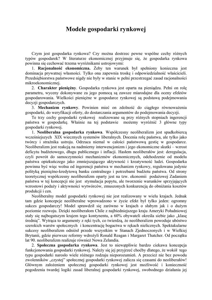 Modele gospodarki rynkowej Czym jest gospodarka rynkowa? Czy można dostrzec pewne wspólne cechy różnych typów gospodarek? W literaturze ekonomicznej przyjmuje się, że gospodarka rynkowa powinna się cechować trzema wyróżnikami ustrojowymi: 1. Racjonalność ekonomiczna. Żeby ten warunek był spełniony konieczna jest dominacja prywatnej własności. Tylko ona zapewnia troskę i odpowiedzialność właścicieli. Przedsiębiorstwa państwowe nigdy nie były w stanie w pełni przestrzegać zasad racjonalności mikroekonomicznej. 2. Charakter pieniężny. Gospodarka rynkowa jest oparta na pieniądzu. Pełni on rolę parametru, wyceny dokonywane za jego pomocą są zawsze miarodajne dla oceny efektów gospodarowania. Wielkości pieniężne w gospodarce rynkowej są podstawą podejmowania decyzji gospodarczych. 3. Mechanizm rynkowy. Powinien mieć on zdolność do ciągłego równoważenia gospodarki, do weryfikacji oferty, do dostarczania argumentów do podejmowania decyzji. Te trzy cechy gospodarki rynkowej realizowane są przy różnych stopniach ingerencji państwa w gospodarkę. Właśnie na tej podstawie możemy wyróżnić 3 główne typy gospodarki rynkowej. 1. Neoliberalna gospodarka rynkowa. Współczesny neoliberalizm jest spadkobiercą wcześniejszych XIX wiecznych systemów liberalnych. Docenia rolę państwa, ale tylko jako twórcy i strażnika ustroju. Odrzuca niemal w całości państwową gestię w gospodarce. Neoliberalizm jest reakcją na nadmierny interwencjonizm i jego ekonomiczne skutki – wzrost deficytu budżetowego, długu publicznego i inflacji. Hasłem neoliberałów jest: deregulacja, czyli powrót do samoczynności mechanizmów ekonomicznych, odchodzenie od modelu państwa opiekuńczego jako zmniejszającego aktywność i kreatywność ludzi. Gospodarka powinna być więc wolna od ingerencji państwa w mechanizm rynkowy, regulowana jedynie polityką pieniężno-kredytową banku centralnego i potrzebami budżetu państwa. Od strony teoretycznej współczesny neoliberalizm oparty jest na tzw. ekonomii podażowej Zadaniem państwa w tej koncepcji nie jest stymulacja popytu, ale tworzenie warunków sprzyjających wzrostowi podaży i aktywności wytwórców, zmuszonych konkurencją do obniżania kosztów produkcji i cen. Neoliberalny model gospodarki rynkowej nie jest realizowany w wielu krajach. Jednak tam gdzie koncepcje neoliberalne wprowadzono w życie efekt był tylko jeden: ogromny sukces gospodarczy! Model sprawdził się zarówno w krajach o słabym jak i o dużym poziomie rozwoju. Dzięki neoliberałom Chile z najbiedniejszego kraju Ameryki Południowej stały się najbogatszym krajem tego kontynentu, a 60% obywateli określa siebie jako „klasę średnią”. Wytrąca to argumenty z ręki tych, co twierdzą, że neoliberalizm powoduje ubóstwo szerokich warstw społecznych i koncentrację bogactwa w rękach nielicznych. Spektakularne sukcesy neoliberalizm odniósł przede wszystkim w Stanach Zjednoczonych i w Wielkiej Brytanii, gdzie pierwsze reformy wdrożyli Ronald Reagan i Margaret Thatcher. Od początku lat 90. neoliberalizm realizuje również Nowa Zelandia. 2. Społeczna gospodarka rynkowa. Jest to niewątpliwie bardzo ciekawa koncepcja funkcjonowania gospodarki rynkowej. Należy się jej przyjrzeć choćby dlatego, że wokół tego typu gospodarki narosło wiele różnego rodzaju nieporozumień. A przecież nie bez powodu zwolenników „czystej” społecznej gospodarki rynkowej zalicza się czasami do neoliberałów! Głównym założeniem społecznej gospodarki rynkowej jest możliwość i konieczność pogodzenia twardej logiki zasad liberalnej gospodarki rynkowej, swobodnego działania jej mechanizmów z zabezpieczeniem określonego poziomu świadczeń socjalnych i zapewnieniem w ten sposób spokoju społecznego. Odrzuca się jednak zarówno własność państwową, jak i ingerowanie państwa w funkcjonowanie mechanizmów rynkowych. Teoretyczne źródła społecznej gospodarki rynkowej tkwią w tzw. ordoliberalizmie. Ordoliberalizm odniósł ogromne sukcesy w Niemczech Zachodnich. Koncepcję tą wdrażał Ludwik Erhard, który nie dopuścił do nacjonalizacji przedsiębiorstw i ograniczenia mechanizmu rynkowego. Dlatego rozbite po wojnie Niemcy szybko stały się najbardziej rozwiniętym krajem europejskim. Trzeba więc jeszcze raz podkreślić, że społeczna gospodarka rynkowa nie ma nic wspólnego z socjalizmem i interwencjonizmem państwowym, a dzięki bezkrytycznemu zaufaniu do mechanizmów rynkowych pozwala odnieść gospodarczy sukces. Pewnym powrotem do korzeni tej koncepcji jest opublikowany w 1999 roku przez Blaira i Schroedera „Manifest socjaldemokratyczny”, który wbrew nazwie jest odwrotem od koncepcji tzw. trzeciej drogi i próbą powrotu do mechanizmów wolnorynkowych. 3. Socjaldemokratyczna (interwencjonistyczna) gospodarka rynkowa. Jej podstawą jest przyjęcie założenia tkwiącego w tzw. ekonomii dobrobytu, iż korzyści społeczne wynikające z pewnego ograniczenia wolności gospodarczej będą większe niż straty. W praktyce państwa realizujące ten model gospodarki rynkowej mają bardzo wysoką stopę redystrybucji budżetowej, ogromne długi publiczne, nadmierne świadczenia socjalne, wysokie obciążenia fiskalne przedsiębiorstw. Powoduje to ogólnie spadek stopy inwestycji i wzrost kosztów produkcji, a co za tym idzie spadek konkurencyjności danej gospodarki. W sferze społecznej model ten powoduje demoralizację części społeczeństwa, tzw. kulturę bezrobocia, spadek aktywności i kreatywności. Model ten, realizowany w większości krajów Europy Zachodniej odniósł jednak porażkę. Dlatego następuje powolne wycofywanie się z jego niektórych założeń. Napotyka to jednak na duży opór zarówno przyzwyczajonego do świadczeń socjalnych społeczeństwa jak i przywiązanych do mirażu państwa opiekuńczego polityków. Czasami niektórzy teoretycy ekonomii wyróżniają również dodatkowy t