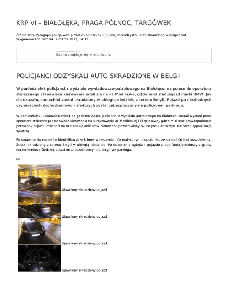 KRP VI – BIAŁOŁĘKA, PRAGA PÓŁNOC, TARGÓWEK Źródło: http://pragapn.policja.waw.pl/r6/aktualnosci/67036,Policjanci-odzyskali-auto-skradzione-w-Belgii.html Wygenerowano: Wtorek, 7 marca 2017, 14:32 Strona znajduje się w archiwum. POLICJANCI ODZYSKALI AUTO SKRADZIONE W BELGII W poniedziałek policjanci z wydziału wywiadowczo-patrolowego na Białołęce, na polecenie operatora stołecznego stanowiska kierowania udali się na ul. Modlińską, gdzie miał stać pojazd marki BMW. Jak się okazało, samochód został skradziony w ubiegłą niedzielę z terenu Belgii. Pojazd po niezbędnych czynnościach dochodzeniowo - śledczych został zabezpieczony na policyjnym parkingu. W poniedziałek, kilkanaście minut po godzinie 22.00, policjanci z wydziału patrolowego na Białołęce, zostali wysłani przez operatora stołecznego stanowiska kierowania na skrzyżowanie ul. Modlińskiej i Ekspresowej, gdzie miał stać prawdopodobnie porzucony pojazd. Policjanci na miejscu ujawnili bmw. Samochód pozostawiony był na pasie do skrętu, tuż przed sygnalizacją świetlną. Po sprawdzeniu numerów identyfikacyjnych bmw w systemie informatycznym okazało się, że samochód jest poszukiwany. Został skradziony z terenu Belgii w ubiegłą niedzielę. Po dokonaniu oględzin pojazdu przez funkcjonariuszy z grupy dochodzeniowo-śledczej, został on zabezpieczony na policyjnym parkingu. po Ujawniony skradziony pojazd Ujawniony skradziony pojazd Ujawniony skradziony pojazd Ujawniony skradziony pojazd Ocena: 0/5 (0) Tweetnij