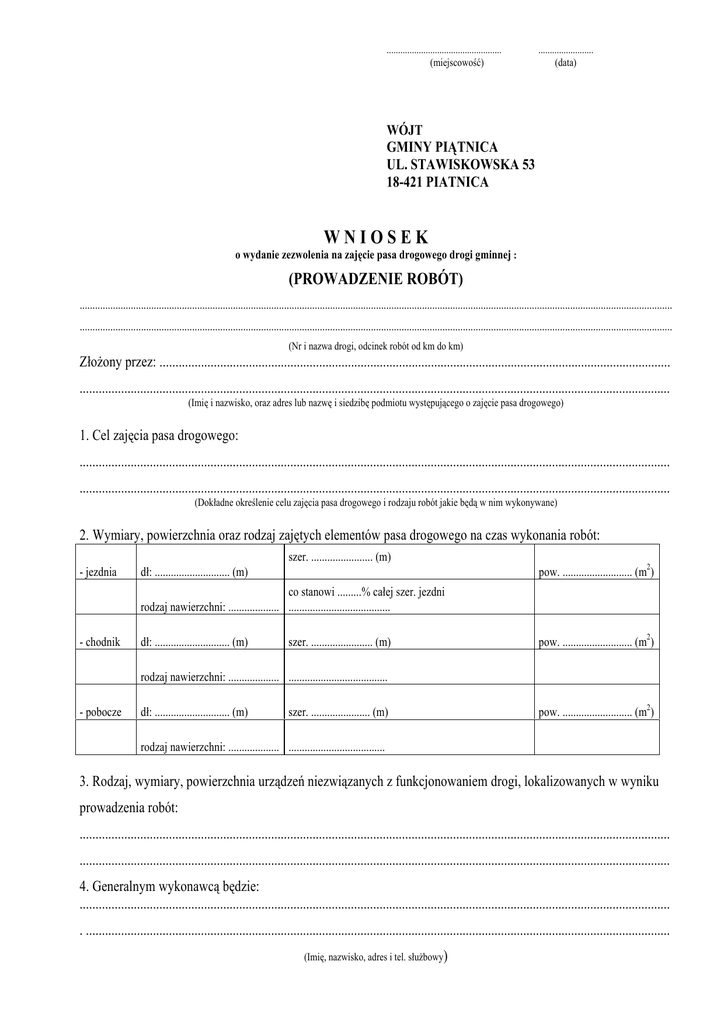 .................................................. (miejscowość) ........................ (data) WÓJT GMINY PIĄTNICA UL. STAWISKOWSKA 53 18-421 PIATNICA WNIOSEK o wydanie zezwolenia na zajęcie pasa drogowego drogi gminnej : (PROWADZENIE ROBÓT) ........................................................................................................................................................................................................................................ ........................................................................................................................................................................................................................................ (Nr i nazwa drogi, odcinek robót od km do km) Złożony przez: ................................................................................................................................................................ ......................................................................................................................................................................................... (Imię i nazwisko, oraz adres lub nazwę i siedzibę podmiotu występującego o zajęcie pasa drogowego) 1. Cel zajęcia pasa drogowego: ......................................................................................................................................................................................... ......................................................................................................................................................................................... (Dokładne określenie celu zajęcia pasa drogowego i rodzaju robót jakie będą w nim wykonywane) 2. Wymiary, powierzchnia oraz rodzaj zajętych elementów pasa drogowego na czas wykonania robót: szer. ....................... (m) - jezdnia dł: ............................ (m) pow. .......................... (m2) co stanowi .........% całej szer. jezdni rodzaj nawierzchni: ................... ...................................... - chodnik dł: ............................ (m) szer. ....................... (m) pow. .......................... (m2) rodzaj nawierzchni: ................... ..................................... - pobocze dł: ............................ (m) szer. ...................... (m) pow. .......................... (m2) rodzaj nawierzchni: ................... .................................... 3. Rodzaj, wymiary, powierzchnia urządzeń niezwiązanych z funkcjonowaniem drogi, lokalizowanych w wyniku prowadzenia robót: ......................................................................................................................................................................................... ......................................................................................................................................................................................... 4. Generalnym wykonawcą będzie: ......................................................................................................................................................................................... . ....................................................................................................................................................................................... (Imię, nazwisko, adres i tel. służbowy) 5. Kierownikiem robót będzie: ......................................................................................................................................................................................... ......................................................................................................................................................................................... (Imię i nazwisko, adres i tel. służbowy) ......................................................................................................................................................................................... (Adres zamieszkania, tel. domowy) 6. Inspektorem nadzoru będzie: ...................................................................................................................................... ......................................................................................................................................................................................... (Imię i nazwisko) ......................................................................................................................................................................................... (Instytucja, tel. służbowy) 7. Planowany okres zajęcia pasa drogowego zgodnie z załączonym harmonogramem: od dnia ......................................................... do dnia ..................................................................... Za okres końcowy zajęcia pasa uważa się dzień przywrócenia terenu do stanu pierwotnego i przekazania go protokołem odbioru dla Wójta Gminy Piątnica. Do wniosku dołącza się: 1. Plan sytuacyjny w skali 1 : 1000, lub w skali 1 : 500 z zaznaczeniem granic i podaniem wymiarów planowanej powierzchni zajęcia pasa drogowego, a w przypadku reklamy z podaniem jej wymiarów. 2. Zatwierdzony projekt organizacji ruchu. W przypadku zajęcia pasa drogowego w celu prowadzenia robót w pasie drogowym należy dołączyć dodatkowo: 3. Ogólny plan orientacyjny w skali 1 : 10 000 lub 1 : 25 000 z zaznaczeniem zajmowanego odcinka pasa drogowego. 4. Informację o sposobie zabezpieczenia robót, jeżeli nie jest wymagany projekt organizacji ruchu. 5. Oświadczenie o posiadaniu ważnego pozwolenia na budowę obiektu umieszczonego w pasie drogowym lub o zgłoszeniu budowy lub prowadzonych robót właściwemu organowi administracji architektonicznobudowlanej. 6. Harmonogram robót prowadzonych w pasie drogowym w przypadku etapowego prowadzenia robót. 7. Projekt obiektu budowlanego umieszczanego w