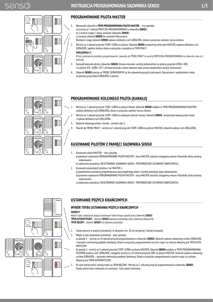 INSTRUKCJA PROGRAMOWANIA SIŁOWNIKA SENSO 1/3 PROGRAMOWANIE PILOTA MASTER 5 sek. 2x ON OFF MASTER 1. Wprowadź siłownik w TRYB PROGRAMOWANIA PILOTA MASTER – trzy sposoby: a) wciśnij na 5 sekund PRZYCISK PROGRAMOWANIA w siłowniku SENSO ; b) 2-krotnie wyłącz i włącz zasilanie siłownika SENSO ; c) zresetuj siłownik SENSO do ustawień fabrycznych; Wynikiem czego siłownik SENSO wykona delikatny ruch GÓRA/DÓŁ, dioda w przycisku zaświeci się na zielono. 2. Wciśnij na 5 sekund przyciski STOP i GÓRA na pilocie. Siłownik SENSO zarejestruje pilot jako MASTER, wykona delikatny ruch GÓRA/DÓŁ, zgaśnie zielona dioda w przycisku i przejdzie w TRYB PRACY. WSKAZÓWKA !!! W celu przerwania procedury programowania i powrotu do TRYBU PRACY 2x wciśnij PRZYCISKU PROGRAMOWANIA na siłowniku max co 1 sekundę. 3. Sprawdź kierunek obrotu siłownika SENSO. Zmiana kierunku: wciśnij jednocześnie na pilocie przyciski GÓRA i DÓŁ ( w pilocie HTC: GÓRA i SET ). Zmiany kierunku można dokonać tylko przed ustawieniem pozycji krańcowych. 5 sek. 4. Siłownik SENSO pracuje w TRYBIE SERWISOWYM, aż do ustawienia pozycji krańcowych. Opuszczanie i podnoszenie rolety za pomocą przycisków GÓRA/DÓŁ w pilocie. PROGRAMOWANIE KOLEJNEGO PILOTA (KANAŁU) MASTER 1. Wciśnij na 5 sekund przyciski STOP i GÓRA na pilocie Master. Siłownik SENSO wejdzie w TRYB PROGRAMOWANIA PILOTÓW, wykona delikatny ruch GÓRA/DÓŁ, dioda w przycisku zaświeci się na zielono. 5 sek. 2. Wciśnij na 5 sekund przyciski STOP i GÓRA na kolejnym pilocie/ kanale. Siłownik SENSO zarejestruje kolejny pilot/ kanał i wykona delikatny ruch DÓŁ/GÓRA. MASTER 3. Dodanie kolejnego pilota / kanału - powtórz pkt 2. 4. Powrót do TRYBU PRACY - wciśnij na 5 sekund przyciski STOP i GÓRA na pilocie MASTER, siłownik wykona ruch DÓŁ/GÓRA. 5 sek. MASTER KASOWANIE PILOTÓW Z PAMIĘCI SIŁOWNIKA SENSO 5 sek. 1. Kasowanie pilota MASTER – dwa sposoby: a) ponowne wykonanie PROGRAMOWANIE PILOTA MASTER - stary MASTER zostanie zastąpiony nowym. Pozostałe piloty zostaną wykasowane. b) wykonanie procedury: RESETOWANIE SIŁOWNIKA SENSO - PRZYWRÓCENIE USTAWIEŃ FABRYCZNYCH; 2. Kasowanie pozostałych pilotów ( nie MASTER ) : a) powtórzenie procedury programowania poszczególnego pilota / kanału powoduje jego wykasowanie; b) ponowne wykonanie PROGRAMOWANIE PILOTA MASTER - stary MASTER zostanie zastąpiony nowym. Pozostałe piloty zostaną wykasowane. c) wykonanie procedury: RESETOWANIE SIŁOWNIKA SENSO - PRZYWRÓCENIE USTAWIEŃ FABRYCZNYCH; >20cm USTAWIANIE POZYCJI KRAŃCOWYCH WYBÓR TRYBU USTAWIANIA POZYCJI KRAŃCOWYCH >20cm WAŻNE!!! Wybór trybu ustawiania pozycji krańcowych determinuje sposób pracy siłownika SENSO: TRYB AUTOMATYCZNY - siłownik SENSO wykrywa przeszkody. (tryb ustawiony fabrycznie). TRYB RĘCZNY - siłownik SENSO nie wykrywa przeszkód. 10 sek. 1. Ustaw pancerz w pozycji pośredniej ( w obszarze min. 20 cm od górnej i dolnej krawędzi). MASTER MASTER 5 sek. 10 sek. 2 sek. 2. Wejdź w tryb ustawiania krańcówek – dwa sposoby: a) sposób 1 - wciśnij na 10 sekund przycisk programowania w siłowniku SENSO. Siłownik wykona sekwencję ruchów GÓRA/DÓŁ i sprawdzi nominalną prędkość obrotową. Dioda w przycisku programowania zacznie migać na zielono. Aktywny jest TRYB AUTO- MATYCZNY. b) sposób 2 - wciśnij na 5 sekund przyciski STOP i GÓRA w pilocie MASTER. Siłownik SENSO wejdzie w TRYB PROGRAMOWANIA PILOTÓW, wykona ruch GÓRA/DÓŁ, następnie wciśnij na 10 sekund przyciski DÓŁ na pilocie MASTER. Siłownik wykona sekwencję ruchów GÓRA/DÓŁ i sprawdzi nominalną prędkość obrotową. Dioda w przycisku programowania zacznie migać na zielono. Aktywny jest TRYB AUTOMATYCZNY. 3. W razie konieczności zmiany trybu na TRYB RĘCZNY - Wciśnij na 2 sekundy przycisk programowania w siłowniku SENSO. Dioda zmieni kolor świecenia na czerwony - tryb został zmieniony. INSTRUKCJA PROGRAMOWANIA SIŁOWNIKA SENSO 2/3 USTAWIANIE POZYCJI KRAŃCOWYCH c.d. TRYB AUTOMATYCZNY WAŻNE !!! Zalecamy stosowanie odbojów w listwie dolnej pancerza. Ich brak może doprowadzić do wciągnięcia całego pancerza do skrzynki rolety ( np. zimą, gdy oblodzony pancerz powoduje zwiększenie się średnicy nawoju ). 1. Sprawdź czy dioda w przycisku programowania miga w kolorze zielonym (TRYB AUTOMATYCZNY) - jeśli nie - ustaw odpowiedni tryb. MASTER 5 sek. MASTER MASTER 2. Napręż pancerz rolety poprzez pociągnięcie listwy końcowej w dół. 3. Wciśnij na 5 sekund przycisk DÓŁ na pilocie MASTER - roleta rozwinie się i zatrzyma w pozycji dolnej. a) USTAWIANIE ZGRUBNE - korekta domknięcia / otwarcia pancerza - naciśnij przyciski DÓŁ / GÓRA na pilocie MASTER - siłownik SENSO pracuje impulsowo; b) USTAWIANIE PRECYZYJNE - dokładna regulacja pozycji krańcowych pancerza - wciśnij jednokrotnie przycisk STOP na pilocie MASTER - siłownik SENSO będzie wykonywać mikro ruchy ; UWAGA!!! Ponowne jednokrotne wciśnięcie przycisku STOP w pilocie MASTER spowoduje powrót do USTAWIANIA ZGRUBNEGO. 4. Naciśnij 2-krotnie - w odstępie max 1 sekundy - przycisk STOP na pilocie MASTER – siłownik SENSO zapamięta dolną pozycję krańcową i wykona delikatny ruch DÓŁ/GÓRA. MASTER 1x MASTER MASTER MASTER 2x MASTER MASTER 5 sek. MASTER 2x MASTER MASTER MASTER 5 sek. 5 sek. 5. Wciśnij na 5 sekund przycisk GÓRA na pilocie MASTER - roleta zacznie się podnosić: - jeżeli są zainstalowane odbojniki - siłownik SENSO zwinie pancerz aż do blokady odbojników w górnej pozycji. Następnie siłow- nik „odpręży” pancerz delikatnym ruchem w DÓŁ.; - W przypadku braku odbojników zatrzymaj pancerz przyciskiem STOP na pilocie MASTER – przed osiągnięciem żądanej górnej pozycji krańcowej; W celu skorygowania górnego położenia wykonaj USTAWIENIE ZGRUBNE lub USTAWIENIE PRECYZYJNE. 6. Naciśnij 2-krotnie - w odstępie max 1 sekundy - przycisk STOP na pilocie MASTER - siłownik SENSO zapamięta górną pozycję krańco
