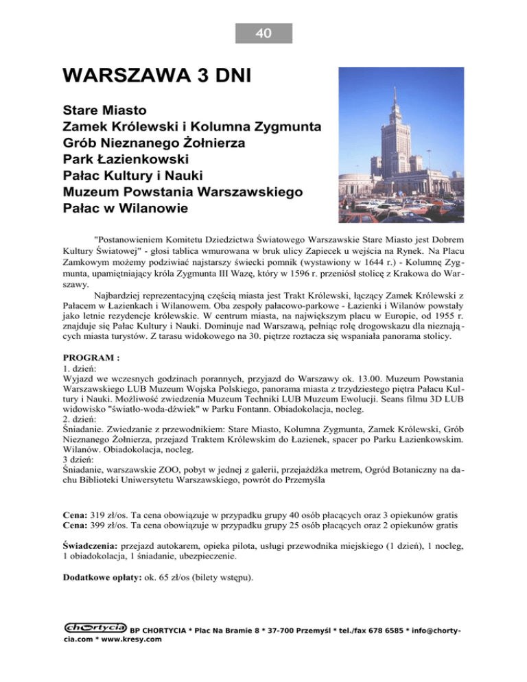 40 WARSZAWA 3 DNI Stare Miasto Zamek Królewski i Kolumna Zygmunta Grób Nieznanego Żołnierza Park Łazienkowski Pałac Kultury i Nauki Muzeum Powstania Warszawskiego Pałac w Wilanowie "Postanowieniem Komitetu Dziedzictwa Światowego Warszawskie Stare Miasto jest Dobrem Kultury Światowej" - głosi tablica wmurowana w bruk ulicy Zapiecek u wejścia na Rynek. Na Placu Zamkowym możemy podziwiać najstarszy świecki pomnik (wystawiony w 1644 r.) - Kolumnę Zygmunta, upamiętniający króla Zygmunta III Wazę, który w 1596 r. przeniósł stolicę z Krakowa do War szawy. Najbardziej reprezentacyjną częścią miasta jest Trakt Królewski, łączący Zamek Królewski z Pałacem w Łazienkach i Wilanowem. Oba zespoły pałacowo-parkowe - Łazienki i Wilanów powstały jako letnie rezydencje królewskie. W centrum miasta, na największym placu w Europie, od 1955 r. znajduje się Pałac Kultury i Nauki. Dominuje nad Warszawą, pełniąc rolę drogowskazu dla nieznają cych miasta turystów. Z tarasu widokowego na 30. piętrze roztacza się wspaniała panorama stolicy. PROGRAM : 1. dzień: Wyjazd we wczesnych godzinach porannych, przyjazd do Warszawy ok. 13.00. Muzeum Powstania Warszawskiego LUB Muzeum Wojska Polskiego, panorama miasta z trzydziestego piętra Pałacu Kultury i Nauki. Możliwość zwiedzenia Muzeum Techniki LUB Muzeum Ewolucji. Seans filmu 3D LUB widowisko "światło-woda-dźwiek" w Parku Fontann. Obiadokolacja, nocleg. 2. dzień: Śniadanie. Zwiedzanie z przewodnikiem: Stare Miasto, Kolumna Zygmunta, Zamek Królewski, Grób Nieznanego Żołnierza, przejazd Traktem Królewskim do Łazienek, spacer po Parku Łazienkowskim. Wilanów. Obiadokolacja, nocleg. 3 dzień: Śniadanie, warszawskie ZOO, pobyt w jednej z galerii, przejażdżka metrem, Ogród Botaniczny na dachu Biblioteki Uniwersytetu Warszawskiego, powrót do Przemyśla Cena: 319 zł/os. Ta cena obowiązuje w przypadku grupy 40 osób płacących oraz 3 opiekunów gratis Cena: 399 zł/os. Ta cena obowiązuje w przypadku grupy 25 osób płacących oraz 2 opiekunów gratis Świadczenia: przejazd autokarem, opieka pilota, usługi przewodnika miejskiego (1 dzień), 1 nocleg, 1 obiadokolacja, 1 śniadanie, ubezpieczenie. Dodatkowe opłaty: ok. 65 zł/os (bilety wstępu). BP CHORTYCIA * Plac Na Bramie 8 * 37-700 Przemyśl * tel./fax 678 6585 * [email protected] * www.kresy.com