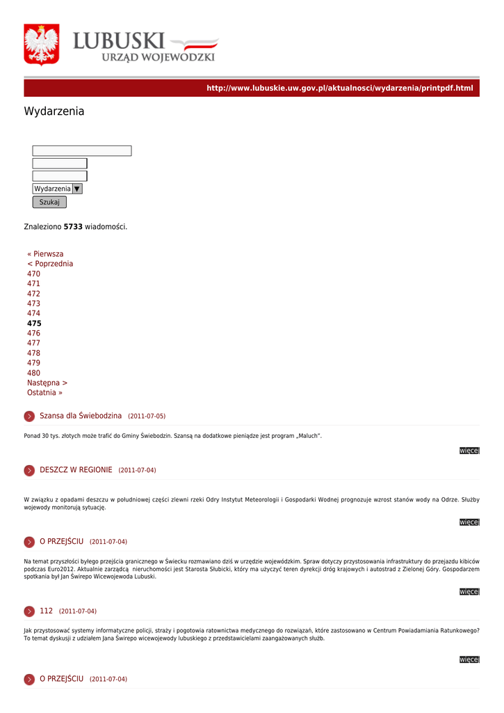 http://www.lubuskie.uw.gov.pl/aktualnosci/wydarzenia/printpdf.html Wydarzenia Wydarzenia ▼ Szukaj Znaleziono 5733 wiadomości. « Pierwsza < Poprzednia 470 471 472 473 474 475 476 477 478 479 480 Następna > Ostatnia » Szansa dla Świebodzina (2011-07-05) Ponad 30 tys. złotych może trafić do Gminy Świebodzin. Szansą na dodatkowe pieniądze jest program „Maluch”. więcej DESZCZ W REGIONIE (2011-07-04) W związku z opadami deszczu w południowej części zlewni rzeki Odry Instytut Meteorologii i Gospodarki Wodnej prognozuje wzrost stanów wody na Odrze. Służby wojewody monitorują sytuację. więcej O PRZEJŚCIU (2011-07-04) Na temat przyszłości byłego przejścia granicznego w Świecku rozmawiano dziś w urzędzie wojewódzkim. Spraw dotyczy przystosowania infrastruktury do przejazdu kibiców podczas Euro2012. Aktualnie zarządcą nieruchomości jest Starosta Słubicki, który ma użyczyć teren dyrekcji dróg krajowych i autostrad z Zielonej Góry. Gospodarzem spotkania był Jan Świrepo Wicewojewoda Lubuski. więcej 112 (2011-07-04) Jak przystosować systemy informatyczne policji, straży i pogotowia ratownictwa medycznego do rozwiązań, które zastosowano w Centrum Powiadamiania Ratunkowego? To temat dyskusji z udziałem Jana Świrepo wicewojewody lubuskiego z przedstawicielami zaangażowanych służb. więcej O PRZEJŚCIU (2011-07-04) Na temat przyszłości byłego przejścia granicznego w Świecku rozmawiano dziś w urzędzie wojewódzkim. Spraw dotyczy przystosowania infrastruktury do przejazdu kibiców podczas Euro2012. Aktualnie zarządcą nieruchomości jest Starosta Słubicki, który ma użyczyć teren dyrekcji dróg krajowych i autostrad z Zielonej Góry. Gospodarzem spotkania był Jan Świrepo Wicewojewoda Lubuski. więcej BEZPIECZNE WAKACJE (2011-07-04) Wybierasz się na urlop? Chcesz się dobrze przygotować do wyjazdu? Obejrzyj film „Bezpieczne wakacje”, który powstał z inicjatywy Heleny Hatki. więcej ZAŁÓŻ FIRMĘ W JEDEN DZIEŃ (2011-07-04) Ruszyła Centralna Ewidencja i Informacja o Działalności Gospodarczej. Możliwe staje się założenie firmy w ciągu jednego dnia on-line. Helena Hatka Wojewoda Lubuski zachęca przedsiębiorców do korzystania z nowego systemu. więcej EFEKTYWNA KOMUNIKACJA (2011-07-04) Do Lubuskiego Urzędu Wojewódzkiego trafił list z podziękowaniami od Szefa Służby Cywilnej. Sławomir Brodziński dziękuje Dyrektorowi i pracownikom LUW za zaangażowanie w realizację projektu nt. efektywnej komunikacji wewnętrznej. więcej WOODSTOCK CORAZ BLIŻEJ (2011-07-04) Pełną parą idą przygotowania do Przystanku Woodstock. W Lubuskim Urzędzie Wojewódzkim odbyło się kolejne spotkanie organizacyjne z Jerzym Owsiakiem. Gościa podjął Jan Świrepo Wicewojewoda Lubuski. więcej POLSKA PREZYDENCJA (2011-06-30) Od 1 lipca 2011 roku przez sześć miesięcy Polska przewodniczy pracom Rady Unii Europejskiej. Zapraszamy na stronę Prezydencji tutaj więcej « Pierwsza < Poprzednia 470 471 472 473 474 475 476 477 478 479 480 Następna > Ostatnia »