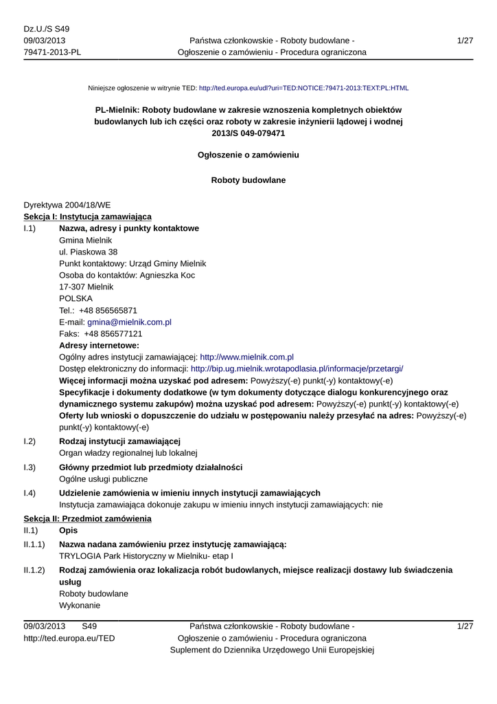 Dz.U./S S49 09/03/2013 79471-2013-PL Państwa członkowskie - Roboty budowlane Ogłoszenie o zamówieniu - Procedura ograniczona 1/27 Niniejsze ogłoszenie w witrynie TED: http://ted.europa.eu/udl?uri=TED:NOTICE:79471-2013:TEXT:PL:HTML PL-Mielnik: Roboty budowlane w zakresie wznoszenia kompletnych obiektów budowlanych lub ich części oraz roboty w zakresie inżynierii lądowej i wodnej 2013/S 049-079471 Ogłoszenie o zamówieniu Roboty budowlane Dyrektywa 2004/18/WE Sekcja I: Instytucja zamawiająca I.1) Nazwa, adresy i punkty kontaktowe Gmina Mielnik ul. Piaskowa 38 Punkt kontaktowy: Urząd Gminy Mielnik Osoba do kontaktów: Agnieszka Koc 17-307 Mielnik POLSKA Tel.: +48 856565871 E-mail: [email protected] Faks: +48 856577121 Adresy internetowe: Ogólny adres instytucji zamawiającej: http://www.mielnik.com.pl Dostęp elektroniczny do informacji: http://bip.ug.mielnik.wrotapodlasia.pl/informacje/przetargi/ Więcej informacji można uzyskać pod adresem: Powyższy(-e) punkt(-y) kontaktowy(-e) Specyfikacje i dokumenty dodatkowe (w tym dokumenty dotyczące dialogu konkurencyjnego oraz dynamicznego systemu zakupów) można uzyskać pod adresem: Powyższy(-e) punkt(-y) kontaktowy(-e) Oferty lub wnioski o dopuszczenie do udziału w postępowaniu należy przesyłać na adres: Powyższy(-e) punkt(-y) kontaktowy(-e) I.2) Rodzaj instytucji zamawiającej Organ władzy regionalnej lub lokalnej I.3) Główny przedmiot lub przedmioty działalności Ogólne usługi publiczne I.4) Udzielenie zamówienia w imieniu innych instytucji zamawiających Instytucja zamawiająca dokonuje zakupu w imieniu innych instytucji zamawiających: nie Sekcja II: Przedmiot zamówienia II.1) Opis II.1.1) Nazwa nadana zamówieniu przez instytucję zamawiającą: TRYLOGIA Park Historyczny w Mielniku- etap I II.1.2) Rodzaj zamówienia oraz lokalizacja robót budowlanych, miejsce realizacji dostawy lub świadczenia usług Roboty budowlane Wykonanie 09/03/2013 S49 http://ted.europa.eu/TED Państwa członkowskie - Roboty budowlane Ogłoszenie o zamówieniu - Procedura ograniczona Suplement do Dziennika Urzędowego Unii Europejskiej 1/27 Dz.U./S S49 09/03/2013 79471-2013-PL Państwa członkowskie - Roboty budowlane Ogłoszenie o zamówieniu - Procedura ograniczona 2/27 Główne miejsce lub lokalizacja robót budowlanych, miejsce realizacji dostawy lub świadczenia usług: powiat siemiatycki, województwo podlaskie, Mielnik, działki o numerach: 5196/72, 5196/20, 5196/65, 5218, 5261/2, Kod NUTS PL343 II.1.3) Informacje na temat zamówienia publicznego, umowy ramowej lub dynamicznego systemu zakupów (DSZ) Ogłoszenie dotyczy zamówienia publicznego II.1.4) Informacje na temat umowy ramowej II.1.5) Krótki opis zamówienia lub zakupu Przedmiotem zamówienia jest kompleksowa budowa I etapu Parku Historycznego Trylogia w Mielniku, tj Stanicy Chreptiów wraz z infrastrukturą,. Główną ideą parku jest „przeniesienie” odwiedzających obiekt do scenerii XVIIwiecznej Rzeczypospolitej Obojga Narodów. Obiekty zostały zaprojektowane w części w oparciu o „Trylogię” H. Sienkiewicza, oraz jej ekranizację w reżyserii J. Hoffmana. Charakterystyka obiektu "TRYLOGIA Park Historyczny w Mielniku- etap I" składa się z niżej opisanych budynków tj: 1. Budynek wałów (okalające majdan), w nich wieże - powierzchnia zabudowy 2574,00m2, powierzchnia użytkowa 2035,15m2, kubatura 7722m3) z przylegającą wiatą drewnianą o następujących parametrach: powierzchnia zabudowy: 51,84 m2, powierzchnia użytkowa 41,33 m2 2. Budynek - Dom komendanta stanicy (pow. zabudowy 850,00 m2, kubatura 18373,84 m2 ). 3. Budynek zbrojowni ( Dom wytwórcy uzbrojenia)(pow. zabudowy 95,95 m2, powierzchnia użytkowa 78,75 m2 ). 4. Budynek - Dom cieśli, (pow. zabudowy 54,65 m2, powierzchnia użytkowa 41,25 m2 ). 5. Budynek - Dom skórnika, (pow. zabudowy 54,65 m2, powierzchnia użytkowa 41,25 m2 ). 6. Budynek - Dom kowala, (pow. zabudowy 48,85 m2, powierzchnia użytkowa 35,43 m2 ). 7. Budynek z makietą XVII – wiecznej Rzeczypospolitej Obojga Narodów (powierzchnia zabudowy 142,00 m2, powierzchnia użytkowa 119,08 m2). 8. Budynek z klatką schodową obsługującą kino, (powierzchnia zabudowy 40,01 m2 ). 9. Rów ziemny – sucha fosa. 10. Zaplecze techniczne – budynek kotłowni (powierzchnia zabudowy 51,84 m2 ) wraz z kontenerową stacją transformatorową typu suchego. 11. Elementy małej architektury: studnie (również z żurawiem), pal, dyby, miejsce na ognisko, pomost zwodzony z kładką (na terenie majdanu). 12. Majdan jako utwardzony plac o powierzchni szutrowej. Zakres inwestycji obejmuje budowę budynku wałów z kładką pieszą zwodzoną, budynku kotłowni, budynków dziedzińca wewnętrznego, elementów małej architektury oraz towarzyszącej infrastruktury drogowej wraz z parkingami, przyłączy i instalacji wodociągowej, kanalizacyjnej, elektrycznej ze stacją transformatorową, teletechnicznej, instalacji gazowej z zewnętrznym zbiornikiem gazu, instalacji ciepłowniczej, wykonanie oświetlenia terenu, ogrodzenia, pięciu przepustów drogowych. Dodatkowo w zakres inwestycji wchodzą roboty ziemne, w tym makroniwelacyjne oraz nasadzenia drzew, niskiej roślinności, obsiewy z trawy i perzu itp. Budynek wałów stanowi wielofunkcyjny obiekt użyteczności publicznej. Budynki dziedzińca wewnętrznego stanowią obiekty o funkcji edukacyjnej, takie jak budynek wielofunkcyjny – dom komendanta wraz z budynkiem klatki schodowej, chaty żołnierskie oraz budynek makiety. Obiekty będą realizowane w sposób z zewnątrz i wewnątrz odzwierciedlający budownictwo XVII-wieczne, poprzez: ręczne wykończenia detali drewnianych, maskowanie konstrukcji monolitycznych, eliminację widocznych połączeń śrubowych, gwoździ itp. z uwzględnieniem wszystkich detali projektowych pokazanych w projekcie wykonawczym dotyczącym sposobu układania okładzin zewnętrznych i wewnętrznych, stolarki okiennej i drzwiowej z okuciami itp. Detale 09/03/2013 S4