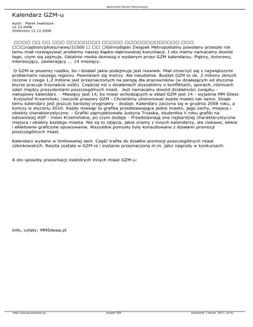Jaworznicki Serwis Informacyjny Kalendarz GZM-u Autor: Marek Iwaniszyn 12.12.2008. Zmieniony 12.12.2008. /caption/photo/news/21500 Górnośląski Związek Metropolitalny powołany przeszło rok temu miał rozwiązywać problemy naszej śląsko-dąbrowskiej konurbacji. I oto mamy namacalny dowód tego, czym się zajmuje. Ostatnio media donoszą o wydanym przez GZM kalendarzu. Piękny, kolorowy, interesujący, zawierający ... 14 miesięcy. O GZM-ie piszemy rzadko, bo i działań jakie podejmuje jest niewiele. Miał zmierzyć się z największymi problemami naszego regionu. Pewnikiem się mierzy. Ale nieudolnie. Budżet GZM to ok. 2 miliony złotych rocznie z czego 1,2 miliona jest przeznaczonych na pensję dla pracowników (w działającym od stycznia biurze pracuje trzynaście osób). Częściej niż o działaniach słyszeliśmy o konfliktach, sporach, różnicach zdań między prezydentami poszczególnych miast. Jest namacalny dowód działalności związku nietypowy kalendarz. - Miesięcy jest 14, bo miast wchodzących w skład GZM jest 14 - wyjaśnia MM Silesii Krzysztof Krzemiński, rzecznik prasowy GZM - Chcieliśmy uhonorować każde miasto tak samo. Dzięki temu kalendarz jest jeszcze bardziej oryginalny - dodaje. Kalendarz zaczyna się w grudnia 2008 roku, a kończy w styczniu 2010. Każdy miesiąc to grafika przedstawiająca jedno miasto, jego cechy, miejsca i obiekty charakterystyczne. - Grafiki zaprojektowała Justyna Trzaska, studentka V roku grafiki na katowickiej ASP - mówi Krzemińskie, po czym dodaje - Przedstawiają one najbardziej charakterystyczne miejsca i obiekty każdego miasta. Nie są to zdjęcia, jakie znamy z innych kalendarzy, ale ciekawe, lekkie i efektowne graficznie opracowania. Wszystkie pomysły były konsultowane z działami promocji poszczególnych miast. Kalendarz wydano w limitowanej serii. Część trafiła do działów promocji poszczególnych miast członkowskich. Reszta została w GZM-ie i zostanie przeznaczona m.in. jako nagrody w konkursach. A oto sposoby prezentacji niektórych innych miast GZM-u: Info, cytaty: MMSilesia.pl http://old.jaworznianin.pl Kreator PDF Utworzono 7 March, 2017, 14:41