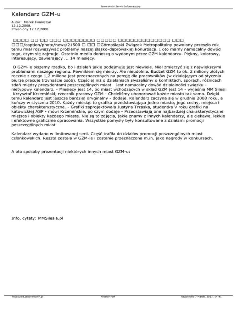 Kalendarz GZM-u - Jaworznicki Serwis Informacyjny