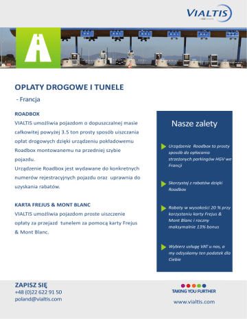 a company OPLATY DROGOWE I TUNELE - Francja ROADBOX VIALTIS umożliwia pojazdom o dopuszczalnej masie Nasze zalety całkowitej powyżej 3.5 ton prosty sposób uiszczania opłat drogowych dzięki urządzeniu pokładowemu Roadbox montowanemu na przedniej szybie pojazdu. Urządzenie Roadbox jest wydawane do konkretnych Urządzenie Roadbox to prosty sposób do opłacania strzeżonych parkingów HGV we Francji numerów rejestracyjnych pojazdu oraz uprawnia do uzyskania rabatów. KARTA FREJUS & MONT BLANC VIALTIS umożliwia pojazdom proste uiszczenie opłaty za przejazd tunelem za pomocą karty Frejus Skorzystaj z rabatów dzięki Roadbox Rabaty w wysokości 20 % przy korzystaniu karty Frejus & Mont Blanc i roczny maksymalnie 13% bonus & Mont Blanc. Wybierz usługę VAT u nas, a my odzyskamy ten podatek dla Ciebie ZAPISZ SIĘ +48 (0)22 622 91 50 poland@vial s.com www.vial s.com