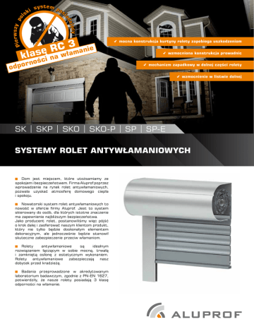 ają rwszy p ol system po s d ia i sk cy Pie 3 nie C R a klasścęi na włam rno odpo cmocna konstrukcja kurtyny rolety zapobiega uszkodzeniom cwzmocniona konstrukcja prowadnic cmechanizm zapadkowy w dolnej części rolety cwzmocnienie w listwie dolnej SK | SKP | SKO | SKO-P | SP | SP-E SYSTEMY ROLET ANTYWŁAMANIOWYCH Dom jest miejscem, które utożsamiamy ze spokojem i bezpieczeństwem. Firma Aluprof poprzez wprowadzenie na rynek rolet antywłamaniowych, pozwala uzyskać atmosferę domowego ciepła i spokoju. Nowatorski system rolet antywłamaniowych to nowość w ofercie firmy Aluprof. Jest to system skierowany do osób, dla których istotne znaczenie ma zapewnienie najbliższym bezpieczeństwa. Jako producent rolet, postanowiliśmy więc pójść o krok dalej i zaoferować naszym klientom produkt, który nie tylko będzie doskonałym elementem dekoracyjnym, ale jednocześnie będzie stanowił skuteczne zabezpieczenie przeciw włamaniom. Rolety antywłamaniowe są idealnym rozwiązaniem łączącym w sobie mocną, trwałą i zamkniętą osłonę z estetycznym wykonaniem. Rolety antywłamaniowe zabezpieczają nasz dobytek przed kradzieżą. Badania przeprowadzone w akredytowanym laboratorium badawczym, zgodnie z PN-EN 1627, potwierdziły, że nasze rolety posiadają 3 klasę odporności na włamanie. SK | SKP | SKO | SKO-P | SP | SP-E SYSTEMY ROLET ANTYWŁAMANIOWYCH wzmocniona konstrukcja prowadnic nie pozwalająca na ich odgięcie oraz wyciągnięcie profili roletowych wzmocnienie w listwie dolnej – duża sztywność i stabilność pancerza odpowiednio mocna konstrukcja kurtyny rolety zapobiegająca uszkodzeniom zabezpieczony patentem mechanizm przez uderzenia zapadkowy w dolnej części rolety zapobiegający przed próbą podniesienia kurtyny rolet SYSTEMY SK SKP SKO-P możliwość adaptacji systemu w istniejących jak i w nowo wznoszonych budynkach możliwość wykorzystania istniejących elementów składowych będących już w sprzedaży PROFILE SP SP-E SKO PE 55 wysokość profilu: 55 mm grubość: 14 mm KOLORYSTYKA PROFILI biały szary beżowy brązowy ciemnobrązowy nielakierowany* Kolory nie odwzorowują wiernie kolorów rzeczywistych. * Na zamówienie możliwość lakierowania w pełnej gamie kolorów. NAPĘDY I AKCESORIA Piloty Przełączniki klawiszowe i kluczykowe Przełączniki zegarowe ALUPROF S.A. ul. Gosławicka 3, 45-446 Opole, Polska tel. +48 77 400 00 00, fax +48 77 400 00 06 e-mail: [email protected] www.aluprof.eu www.rolety.aluprof.eu Wieszaki blokady PL – 04.2013 Siłowniki elektryczne