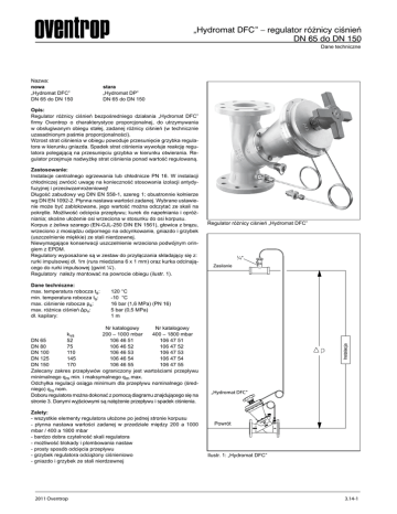 „Hydromat DFC” – regulator różnicy ciśnień DN 65 do DN 150 Dane techniczne Nazwa: nowa „Hydromat DFC” DN 65 do DN 150 stara „Hydromat DP” DN 65 do DN 150 Opis: Regulator różnicy ciśnień bezpośredniego działania „Hydromat DFC” firmy Oventrop o charakterystyce proporcjonalnej, do utrzymywania w obsługiwanym obiegu stałej, zadanej różnicy ciśnień (w technicznie uzasadnionym paśmie proporcjonalności). Wzrost strat ciśnienia w obiegu powoduje przesunięcie grzybka regulatora w kierunku gniazda. Spadek strat ciśnienia wywołuje reakcję regulatora polegającą na przesunięciu grzybka w kierunku otwierania. Regulator przejmuje nadwyżkę strat ciśnienia ponad wartość regulowaną. Zastosowanie: Instalacje centralnego ogrzewania lub chłodnicze PN 16. W instalacji chłodniczej zwrócić uwagę na konieczność stosowania izolacji antydyfuzyjnej i przeciwzamrożeniowej! Długość zabudowy wg DIN EN 558-1, szereg 1; obustronnie kołnierze wg DN EN 1092-2. Płynna nastawa wartości zadanej. Wybrane ustawienie może być zablokowane, jego wartość można odczytać ze skali na pokrętle. Możliwość odcięcia przepływu; kurek do napełniania i opróżniania; skośne ułożenie osi wrzeciona w stosunku do osi korpusu. Korpus z żeliwa szarego (EN-GJL-250 DIN EN 1561), głowica z brązu, wrzeciono z mosiądzu odpornego na odcynkowanie, gniazdo i grzybek (uszczelnienie miękkie) ze stali nierdzewnej. Niewymagające konserwacji uszczelnienie wrzeciona podwójnym oringiem z EPDM. Regulatory wyposażone są w zestaw do przyłączania składający się z: rurki impulsowej dł. 1m (rura miedziana 6 x 1 mm) oraz kurka odcinającego do rurki impulsowej (gwint ¼̎ ) . Regulatory należy montować na powrocie obiegu (ilustr. 1). ⁄ 4" Zasilanie 120 °C -10 °C 16 bar (1,6 MPa) (PN 16) 5 bar (0,5 MPa) 1m Nr katalogowy Nr katalogowy kvs 200 – 1000 mbar 400 – 1800 mbar DN 65 52 106 46 51 106 47 51 DN 80 75 106 46 52 106 47 52 DN 100 110 106 46 53 106 47 53 DN 125 145 106 46 54 106 47 54 DN 150 170 106 46 55 106 47 55 Zalecany zakres przepływów ograniczony jest wartościami przepływu minimalnego qm min. i maksymalnego qm max. Odchyłka regulacji osiąga minimum dla przepływu nominalnego (średniego) qm nom. Doboru regulatora można dokonać z pomocą diagramu znajdującego się na stronie 3. Danymi wyjściowymi są natężenie przepływu i spadek ciśnienia. Zalety: - wszystkie elementy regulatora ułożone po jednej stronie korpusu - płynna nastawa wartości zadanej w przedziale między 200 a 1000 mbar / 400 a 1800 mbar - bardzo dobra czytelność skali regulatora - możliwość blokady i plombowania nastaw - prosty sposób odcięcia przepływu - grzybek regulatora odciążony ciśnieniowo - gniazdo i grzybek ze stali nierdzewnej 2011 Oventrop 1 Instalacja Dane techniczne: max. temperatura robocza ts: min. temperatura robocza ts: max. ciśnienie robocze ps: max. różnica ciśnień Δpv: dł. kapilary: Regulator różnicy ciśnień „Hydromat DFC” „Hydromat DFC“ Powrót Ilustr. 1: „Hydromat DFC” 3.14-1 „Hydromat DFC” – regulator różnicy ciśnień DN 65 do DN 150 Nastawa wstępna regulatorów DN 65 – DN 100: (ilustr. 2) Regulatory różnicy ciśnień firmy Oventrop można nastawiać płynjie (bezstopniowo) w zakresie od 200 do 1000 mbar lub od 400 do 1800 mbar. Żądaną wartość nastawy wstępnej ustawić poprzez obracanie pokrętłem. a. Aktualną wartość nastawy wstępnej podstawowej wskazuje położenie poprzecznej kreski-znacznika wobec podziałki podłużnej. Jedna działka tej podziałki odpowiada jednemu obrotowi pokrętła. b. W okienku plastikowej osłonki podziałki obwodowej widoczna jest cyfra odpowiadająca dziesiętnej części stopnia nastawy podstawowej. Jedna działka podziałki obwodowej odpowiada 1/10 obrotu pokrętła. Ręczne odcięcie przepływu: Regulator różnicy ciśnień może służyć do odcięcia przepływu w obiegu (np. podczas robót konserwacyjnych w instalacji) i przejąć funkcję zaworu odcinającego. Sposób postępowania: 1. Zamknąć kurki odcinające rurek impulsowych dolnej i górnej komory membrany. Niespełnienie tego wymagania może doprowadzić do uszkodzenia membrany! 2. Zamknąć regulator obracając pokrętłem ręcznym do oporu, zgodnie z ruchem wskazówek zegara („closed” na skali regulatora). Teraz można opróżnić instalację. Podczas opróżniania ciśnienie przed regulatorem (patrząc zgodnie z kierunkiem przepływu) nie może spaść poniżej ciśnienia za regulatorem. Postępowanie podczas otwierania regulatora: 1. Obrócić pokrętło ręczne do położenia wyznaczonego stopniem nastawy wstępnej. 2. Po napełnieniu instalacji można otworzyć obydwa kurki rurek impulsowych. Orientacja podziałek nastawy: Odpowiednio do sposobu zabudowy regulatora można zmienić (dla ułatwienia odczytu) położenie podziałki. W tym celu należy zdjąć zaślepkę, wykręcić śrubę mocującą i lekkim szarpnięciem ściągnąć pokrętło z głowicy zaworu. Nie zmieniając nastawy obrócić pokrętło do położenia, w którym okienko podziałki obwodowej jest dobrze widoczne. Wsunąć pokrętło do oporu na trzpień zaworu i dokręcić śrubą. Wcisnąć zaślepkę. Zabezpieczenie nastawy wstępnej: (ilustr. 3) Nastawa wstepna może być zablokowana przy wszystkich wskazywanych wartościach skali (1/10 wskazania). Załączony klips blokujący wsunąć do oporu pomiędzy żebra prowadzące pokrętła (poniżej otworu na drut plomby) zgodnie z kierunkiem zaznaczonym na rysunku (ilustr. 2). Założyć plombę zwracając uwagę na dobre naciągnięcie drutu plombującego. 3.14-2 Wymiary: d2 d1 DN DF KF nx Ød F H Zabudowa i montaż regulatora: Regulatory różnicy ciśnień montowane są na przewodzie powrotnym (ilustr. 1). Ułożenie regulatora jest w zasadzie dowolne, należy jednak zwrócić uwagę na zgodność kierunku przepływu czynnika ze zwrotem strzałki na korpusie. Przed montaż