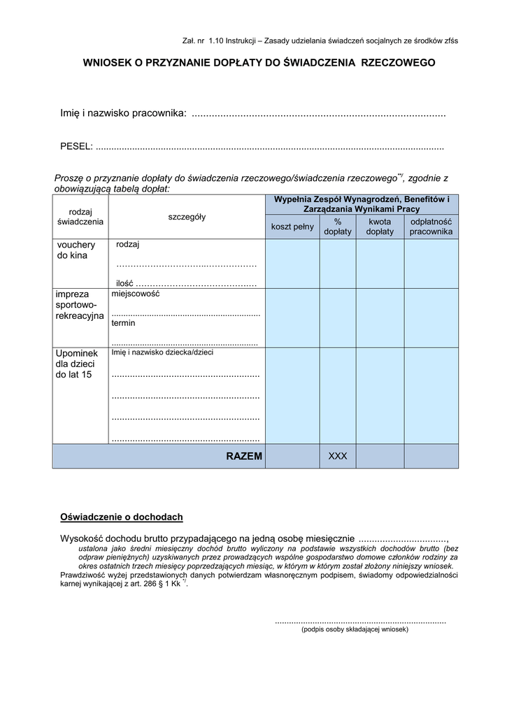 Zał. nr 1.10 Instrukcji – Zasady udzielania świadczeń socjalnych ze środków zfśs WNIOSEK O PRZYZNANIE DOPŁATY DO ŚWIADCZENIA RZECZOWEGO Imię i nazwisko pracownika: ......................................................................................... PESEL: ...................................................................................................................................... Proszę o przyznanie dopłaty do świadczenia rzeczowego/świadczenia rzeczowego**/, zgodnie z obowiązującą tabelą dopłat: rodzaj świadczenia vouchery do kina Wypełnia Zespół Wynagrodzeń, Benefitów i Zarządzania Wynikami Pracy szczegóły koszt pełny % dopłaty kwota dopłaty odpłatność pracownika rodzaj …………………………..……………… ilość ………………………………….… miejscowość impreza sportoworekreacyjna ............................................................... termin .............................................................. Upominek dla dzieci do lat 15 Imię i nazwisko dziecka/dzieci ......................................................... ......................................................... ......................................................... ......................................................... RAZEM XXX Oświadczenie o dochodach Wysokość dochodu brutto przypadającego na jedną osobę miesięcznie ................................., ustalona jako średni miesięczny dochód brutto wyliczony na podstawie wszystkich dochodów brutto (bez odpraw pieniężnych) uzyskiwanych przez prowadzących wspólne gospodarstwo domowe członków rodziny za okres ostatnich trzech miesięcy poprzedzających miesiąc, w którym w którym został złożony niniejszy wniosek. Prawdziwość wyżej przedstawionych danych potwierdzam własnoręcznym podpisem, świadomy odpowiedzialności */ karnej wynikającej z art. 286 § 1 Kk . ......................................................................... (podpis osoby składającej wniosek) 2 Kwota dopłaty do świadczenia rzeczowego/świadczenia rzeczowego **/ wynikająca z obowiązującej tabeli dopłat wynosi: ........................................... zł ......................................................................... (podpis pracownika Zespołu WBWP) Akceptacja realizacji świadczenia przez Dyrektora Dep. Wynagrodzeń, Benefitów i Raportowania ................................................................... (stempel funkcyjny i podpis dyrektora) Odmowa przyznania dopłaty do świadczenia rzeczowego z uwagi na: …………………………………………………….............................................................. ................................................................... (stempel funkcyjny i podpis dyrektora) */ Art. 286 § 1. Kto, w celu osiągnięcia korzyści majątkowej, doprowadza inną osobę do niekorzystnego rozporządzenia własnym lub cudzym mieniem za pomocą wprowadzenia jej w błąd albo wyzyskania błędu lub niezdolności do należytego pojmowania przedsiębranego działania, podlega karze pozbawienia wolności od 6 miesięcy do lat 8 **/ niepotrzebne skreślić