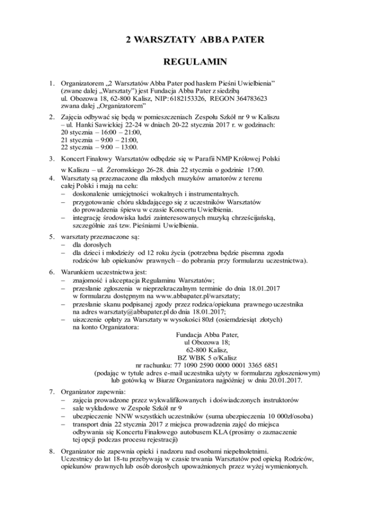 2 WARSZTATY ABBA PATER REGULAMIN Organizatorem „2 Warsztatów Abba Pater pod hasłem Pieśni Uwielbienia” (zwane dalej „Warsztaty”) jest Fundacja Abba Pater z siedzibą ul. Obozowa 18, 62-800 Kalisz, NIP: 6182153326, REGON 364783623 zwana dalej „Organizatorem” Zajęcia odbywać się będą w pomieszczeniach Zespołu Szkół nr 9 w Kaliszu – ul. Hanki Sawickiej 22-24 w dniach 20-22 stycznia 2017 r. w godzinach: 20 stycznia – 16:00 – 21:00, 21 stycznia – 9:00 – 21:00, 22 stycznia – 9:00 – 13:00. Koncert Finałowy Warsztatów odbędzie się w Parafii NMP Królowej Polski w Kaliszu – ul. Żeromskiego 26-28. dnia 22 stycznia o godzinie 17:00. Warsztaty są przeznaczone dla młodych muzyków amatorów z terenu całej Polski i mają na celu: doskonalenie umiejętności wokalnych i instrumentalnych. przygotowanie chóru składającego się z uczestników Warsztatów do prowadzenia śpiewu w czasie Koncertu Uwielbienia. integrację środowiska ludzi zainteresowanych muzyką chrześcijańską, szczególnie zaś tzw. Pieśniami Uwielbienia. warsztaty przeznaczone są: dla dorosłych dla dzieci i młodzieży od 12 roku życia (potrzebna będzie pisemna zgoda rodziców lub opiekunów prawnych – do pobrania przy formularzu uczestnictwa). Warunkiem uczestnictwa jest: znajomość i akceptacja Regulaminu Warsztatów; przesłanie zgłoszenia w nieprzekraczalnym terminie do dnia 18.01.2017 w formularzu dostępnym na www.abbapater.pl/warsztaty; przesłanie skanu podpisanej zgody przez rodzica/opiekuna prawnego uczestnika na adres [email protected] do dnia 18.01.2017; uiszczenie opłaty za Warsztaty w wysokości 80zł (osiemdziesiąt złotych) na konto Organizatora: Fundacja Abba Pater, ul Obozowa 18; 62-800 Kalisz, BZ WBK 5 o/Kalisz nr rachunku: 77 1090 2590 0000 0001 3365 6851 (podając w tytule adres e-mail uczestnika użyty w formularzu zgłoszeniowym) lub gotówką w Biurze Organizatora najpóźniej w dniu 20.01.2017. Organizator zapewnia: zajęcia prowadzone przez wykwalifikowanych i doświadczonych instruktorów sale wykładowe w Zespole Szkół nr 9 ubezpieczenie NNW wszystkich uczestników (suma ubezpieczenia 10 000zł/osoba) transport dnia 22 stycznia 2017 z miejsca prowadzenia zajęć do miejsca odbywania się Koncertu Finałowego autobusem KLA (prosimy o zaznaczenie tej opcji podczas procesu rejestracji) Organizator nie zapewnia opieki i nadzoru nad osobami niepełnoletnimi. Uczestnicy do lat 18-tu przebywają w czasie trwania Warsztatów pod opieką Rodziców, opiekunów prawnych lub osób dorosłych upoważnionych przez wyżej wymienionych. Koszty dojazdu pokrywają uczestnicy lub instytucje delegujące. Organizator nie odpowiada za rzeczy pozostawione w szatni lub na Salach Warsztatowych. Wszyscy uczestnicy zobowiązani są do przestrzegania przepisów BHP i P.POZ obowiązujących na terenie obiektów. Każdy uczestnik Warsztatów zobowiązany do posiadania imiennego identyfikatora otrzymanego w dniu rozpoczęcia Warsztatów. Zabrania się nieuprzejmego, niestosownego zachowania zakłócającego pracę instruktorów i/lub obsługi. Zabrania się spożywania alkoholu bądź innych niedozwolonych środków. Organizator zastrzega sobie prawo wyproszenia osoby nie stosującej się do tego zapisu. Odpowiedzialność materialną za ewentualnie wyrządzone przez uczestników warsztatów szkody ponoszą rodzice i/lub opiekunowie prawni. Osoby pełnoletnie same ponoszą odpowiedzialność za szkody. Na drugą i kolejne osoby z jednej rodziny przysługuje zniżka 30% (czyli 56zł.) - nie dotyczy opłat dodatkowych za posiłki, noclegi oraz zajęcia z emisji głosu. Grupy zorganizowane – powyżej 15 osób, w których znajdą się uczestnicy do 18 roku życia zobowiązane są do przyjazdu z opiekunem (1 opiekun na każde 15 osób do 18 roku życia). Koszt pobytu opiekuna takiej grupy ponosi Organizator. Organizator może zapewnić noclegi (25zł/noc) oraz obiady dwudaniowe (10zł/obiad) – opcje te należy zaznaczyć podczas procesu rejestracji. Organizator może zapewnić 15 minutowe indywidualne konsultacje z emisji głosu prowadzone przez instruktorów za dodatkową opłatę, która wynosi 25zł/15min. Ilość miejsc ograniczona (decyduje kolejność zgłoszeń) - opcję tę należy zaznaczyć podczas procesu rejestracji. Szczegółowy plan zajęć upubliczniony zostanie na stronie internetowej www.abbapater.pl/warsztaty do 16.01.2017. W przypadku rezygnacji Uczestnika z udziału w Warsztatach jest on zobowiązany do niezwłocznego powiadomienia o tym fakcie Organizatora drogą mailową na adres: [email protected], jednak nie później niż do dnia 18 stycznia 2017. Uczestnicy, którzy zrezygnują z warsztatów po 18 stycznia 2017 r. lub w trakcie ich trwania, nie otrzymają zwrotu opłaty (dotyczy to również opłaty za ewentualne noclegi, posiłki czy zajęcia indywidualne). Przesłanie formularza zgłoszeniowego jest jednoznaczne ze zgodą na wieczyste wykorzystywanie wizerunku, nagrań video, nagrań audio oraz fotografii realizowanych podczas Warsztatów oraz Koncertu Finałowego. Wysłanie formularza jest jednoznaczne ze zgodą na wykorzystywanie danych osobowych niezbędnych do procesu. Uczestnikowi przysługuje prawo do wglądu w posiadane przez organizatora dane oraz swobodnego ich poprawiania i zastrzegania. Wszelkie sprawy sporne rozstrzyga organizator i jego decyzje są wiążące. Organizator zastrzega sobie możliwość zmian w regulaminie.