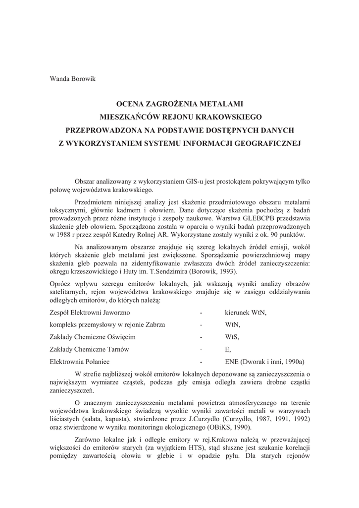 Wanda Borowik OCENA ZAGROĩENIA METALAMI MIESZKAēCÓW REJONU KRAKOWSKIEGO PRZEPROWADZONA NA PODSTAWIE DOSTĉPNYCH DANYCH Z WYKORZYSTANIEM SYSTEMU INFORMACJI GEOGRAFICZNEJ Obszar analizowany z wykorzystaniem GIS-u jest prostokątem pokrywającym tylko poáowĊ województwa krakowskiego. Przedmiotem niniejszej analizy jest skaĪenie przedmiotowego obszaru metalami toksycznymi, gáównie kadmem i oáowiem. Dane dotyczące skaĪenia pochodzą z badaĔ prowadzonych przez róĪne instytucje i zespoáy naukowe. Warstwa GLEBCPB przedstawia skaĪenie gleb oáowiem. Sporządzona zostaáa w oparciu o wyniki badaĔ przeprowadzonych w 1988 r przez zespóá Katedry Rolnej AR. Wykorzystane zostaáy wyniki z ok. 90 punktów. Na analizowanym obszarze znajduje siĊ szereg lokalnych Ĩródeá emisji, wokóá których skaĪenie gleb metalami jest zwiĊkszone. Sporządzenie powierzchniowej mapy skaĪenia gleb pozwala na zidentyfikowanie zwáaszcza dwóch Ĩródeá zanieczyszczenia: okrĊgu krzeszowickiego i Huty im. T.Sendzimira (Borowik, 1993). Oprócz wpáywu szeregu emitorów lokalnych, jak wskazują wyniki analizy obrazów satelitarnych, rejon województwa krakowskiego znajduje siĊ w zasiĊgu oddziaáywania odlegáych emitorów, do których naleĪą: Zespóá Elektrowni Jaworzno - kierunek WtN, kompleks przemysáowy w rejonie Zabrza - WtN, Zakáady Chemiczne OĞwiĊcim - WtS, Zakáady Chemiczne Tarnów - E, Elektrownia Poáaniec - ENE (Dworak i inni, 1990a) W strefie najbliĪszej wokóá emitorów lokalnych deponowane są zanieczyszczenia o najwiĊkszym wymiarze cząstek, podczas gdy emisja odlegáa zawiera drobne cząstki zanieczyszczeĔ. O znacznym zanieczyszczeniu metalami powietrza atmosferycznego na terenie województwa krakowskiego Ğwiadczą wysokie wyniki zawartoĞci metali w warzywach liĞciastych (saáata, kapusta), stwierdzone przez J.Curzydáo (Curzydáo, 1987, 1991, 1992) oraz stwierdzone w wyniku monitoringu ekologicznego (OBiKS, 1990). Zarówno lokalne jak i odlegáe emitory w rej.Krakowa naleĪą w przewaĪającej wiĊkszoĞci do emitorów starych (za wyjątkiem HTS), stąd sáuszne jest szukanie korelacji pomiĊdzy zawartoĞcią oáowiu w glebie i w opadzie pyáu. Dla starych rejonów przemysáowych na terenie Górnego ĝląska zostaáy sformuáowane empiryczne relacje w oparciu o uĞrednione wyniki zawartoĞci metali w opadzie pyáu, w glebie i w warzywach (Borowik, 1993). Oparto siĊ wówczas na wynikach Instytutu Ochrony ĝrodowiska w Katowicach (Kucharski, 1988). Do okreĞlenia tych relacji wykorzystano pojĊcie czasu przebywania metalu w glebie, wyraĪonego w latach. Na podstawie danych literaturowych przyjĊto ten czas dla oáowiu i kadmu równy 300 lat (Borowik, 1993). ZawartoĞü metalu w glebie, wyraĪona wagowo w ppm (pars per milion, np. g/g) obliczona jest ze wzoru: C gl = I T M (1) (patrz Bennet, 1981), gdzie: I - roczny opad metalu (kg/m2rok), T - czas przebywania metalu w glebie, M - masa 1m2 warstwy ornej gleby o gruboĞci 20 cm, Wprowadzenie wartoĞci parametrów: czas przebywania oáowiu i kadmu w glebie - 300 lat i gĊstoĞü gleby: 1.5g/cm3, pozwoliáo na stwierdzenie relacji: kg º C Pb w glebie > ppm @ # I Pb ª« 2 ¬ km rok »¼ (2) Relacja ta odpowiada wynikom badaĔ z 12 miast przemysáowych Górnego ĝląska (Kucharski, 1988). Jednak mogáa byü sformuáowana szacunkowo jedynie w oparciu o Ğrednie wyniki zawartoĞci metali w glebie i w opadzie pyáu dla caáego rejonu, nie zaĞ w oparciu o pary wyników dla poszczególnych punktów pomiarowych. Próby korelacji pomiĊdzy zawartoĞcią metali w glebie i rocznym opadzie pyáu dla wyników z terenu województwa krakowskiego, pochodzących z badaĔ Terenowej Inspekcji Ochrony ĝrodowiska (Borowik 1993), doprowadziáy do stwierdzenia, Īe zawartoĞci cynku i Īelaza w glebie są skorelowane z opadem pyáu, jak teĪ z zawartoĞcią tych metali w pyle, zarówno w formach rozpuszczalnych, jak teĪ nierozpuszczalnych. W odniesieniu do kadmu i oáowiu natomiast nie stwierdzono podobnego typu relacji. ZawartoĞü metali w glebie uwarunkowana jest wieloma czynnikami, m.in. gatunkiem gleb, rodzajem skaáy macierzystej. Depozycja zanieczyszczeĔ z atmosfery stanowi tu czynnik wtórny. Jednak, ze wzglĊdu na to, Īe znaczna czĊĞü analizowanego obszaru znajduje siĊ w zasiĊgu emisji przemysáowych naleĪaáoby siĊ spodziewaü dla Pb i Cd podobnych relacji jak dla Zn i Fe. Ich brak wskazuje raczej, na niewystarczającą dokáadnoĞü oznaczenia w glebie Pb i Cd, wystĊpujących w Ğrodowisku przyrodniczym w iloĞciach Ğladowych, znacznie mniejszych niĪ cynk czy Īelazo. Wykorzystanie Geograficznego Systemu Informacji do analizy zanieczyszczenia Ğrodowiska przyrodniczego w rejonach przemysáowych ujawniáo równieĪ niedokáadnoĞci w okreĞlaniu lokalizacji punktów pomiarowych, tzn. dokáadnoĞü okreĞlania tych punktów okazaáa siĊ niewystarczająca (Mularz, Mierzwa, 1993). Dotyczyáo to badaĔ róĪnych instytucji i zespoáów naukowych. Retrospektywne, powtórne ustalenie poáoĪenia punktów pomiarowych wzglĊdem przyjĊtego ukáadu odniesienia jest czynnoĞcią bardzo Īmudną, a dla wielu punktów juĪ niemoĪliwą ze wzglĊdu na kilkuletnią odlegáoĞü czasową od momentu pomiarów. Znaczną czĊĞü analizowanego rejonu pokrywają tereny uprawne (warstwa ROLN). Uprawianie ziemniaków i warzyw na terenach skaĪonych metalami stwarza zagroĪenie zdrowia dla konsumentów. Istnieją empiryczne wzory, które pozwalają na okreĞlenie przewidywanej zawartoĞci oáowiu i kadmu w wybranych warzywach i w ziemniakach na podstawie zawartoĞci tych metali w glebie z uwzglĊdnieniem szeregu dodatkowych parametrów. Wzory te mają charakter potĊgowy: C w = a C gl b (3) gdzie: Cw - zawartoĞü metali w warzywach [ppm], Cgl - zawartoĞü metali w glebie [ppm], Tabela wspóáczynników a i b podana jest poniĪej (Borowik, 1993). Tabela 8.1. WartoĞci wspóáczynników a i b do wzoru (3) dla poszczególnych warzyw i zie