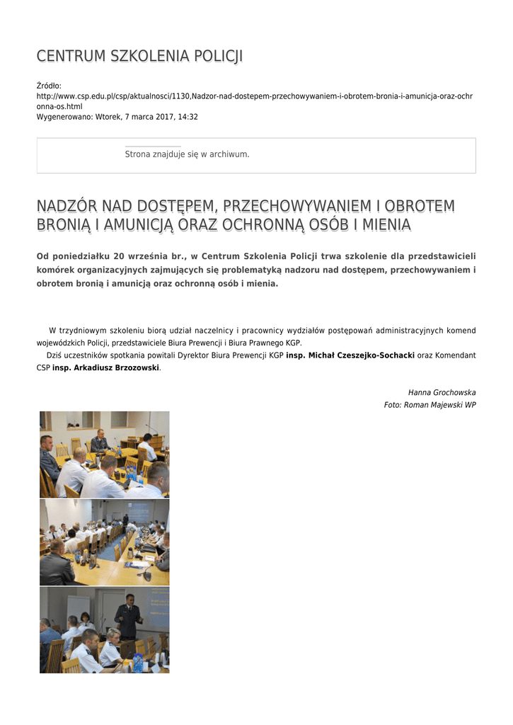 CENTRUM SZKOLENIA POLICJI Źródło: http://www.csp.edu.pl/csp/aktualnosci/1130,Nadzor-nad-dostepem-przechowywaniem-i-obrotem-bronia-i-amunicja-oraz-ochr onna-os.html Wygenerowano: Wtorek, 7 marca 2017, 14:32 Strona znajduje się w archiwum. NADZÓR NAD DOSTĘPEM, PRZECHOWYWANIEM I OBROTEM BRONIĄ I AMUNICJĄ ORAZ OCHRONNĄ OSÓB I MIENIA Od poniedziałku 20 września br., w Centrum Szkolenia Policji trwa szkolenie dla przedstawicieli komórek organizacyjnych zajmujących się problematyką nadzoru nad dostępem, przechowywaniem i obrotem bronią i amunicją oraz ochronną osób i mienia. W trzydniowym szkoleniu biorą udział naczelnicy i pracownicy wydziałów postępowań administracyjnych komend wojewódzkich Policji, przedstawiciele Biura Prewencji i Biura Prawnego KGP. Dziś uczestników spotkania powitali Dyrektor Biura Prewencji KGP insp. Michał Czeszejko-Sochacki oraz Komendant CSP insp. Arkadiusz Brzozowski. Hanna Grochowska Foto: Roman Majewski WP Ocena: 0/5 (0) Tweetnij