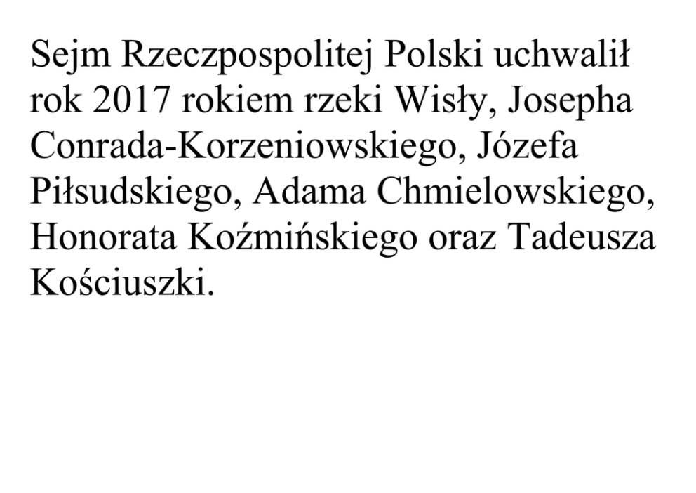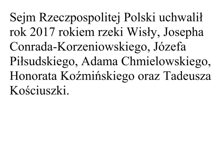 Sejm Rzeczpospolitej Polski uchwalił rok 2017 rokiem rzeki Wisły, Josepha Conrada-Korzeniowskiego, Józefa Piłsudskiego, Adama Chmielowskiego, Honorata Koźmińskiego oraz Tadeusza Kościuszki. Andrzej Tadeusz Bonawentura Kościuszko herbu Roch III (ur. 4 lutego 1746 w Mereczowszczyźnie – obecnie na terenie Białorusi, zm. 15 października 1817 w Solurzemiasto w Szwajcarii) – inżynier wojskowy, fortyfikator, polski i amerykański generał, uczestnik wojny o niepodległość Stanów Zjednoczonych (1775–1783), Najwyższy Naczelnik Siły Zbrojnej Narodowej w czasie insurekcji kościuszkowskiej (1794). Adam Hilary Bernard Chmielowski, znany jako święty Albert Chmielowski oraz święty Brat Albert (ur. 20 sierpnia 1845 w Igołomii, zm. 25 grudnia 1916 w Krakowie) –zakonnik franciszkański, założyciel zgromadzenia albertynów i albertynek, powstaniec, malarz, święty Kościoła katolickiego, znany z pełnego poświęcenia pracy dla biednych i bezdomnych. Józef Klemens Piłsudski (ur. 5 grudnia 1867 w Zułowie, zm. 12 maja 1935 w Warszawie) – polski działacz społeczny i niepodległościowy, żołnierz, polityk, mąż stanu; od 1892 członek Polskiej Partii Socjalistycznej i jej przywódca w kraju, twórca Organizacji Bojowej PPS (1904), Legionów Polskich (1914) i Polskiej Organizacji Wojskowej (1914), kierownik Komisji Wojskowej Tymczasowej Rady Stanu (1917)[2], od 11 listopada 1918 naczelny wódz Armii Polskiej, w latach 1918–1922 naczelnik państwa, pierwszy marszałek Polski (1920); przywódca obozu sanacji, po przewrocie majowym (1926) dwukrotny premier Polski (1926– 1928 i 1930). Joseph Conrad, właściwie Józef Teodor Konrad Korzeniowski (ur. 3 grudnia 1857 w Berdyczowie, zm. 3 sierpnia 1924 w Bishopsbourne) – pisarz i publicysta angielski pochodzenia polskiego. Ważne dzieła literackie: Jądro ciemności Lord Jim Nostromo Smuga cienia Szaleństwo Almayera Ocalenie Wisła (łac. Vistula) – najdłuższa rzeka Polski, a także najdłuższa rzeka uchodząca do Morza Bałtyckiego, o długości 1047 km. Wpływa do Zatoki Gdańskiej, a jej średnioroczny przepływ w odcinku ujściowym wynosi 1046 m³/s.[ Honorat Koźmiński, właściwie Florentyn Wacław Jan Stefan Koźmiński (ur. 16 października 1829 w Białej Podlaskiej, zm. 16 grudnia 1916 w Nowym Mieście nad Pilicą) – polski kapucyn, teolog, prezbiter, założyciel wielu zgromadzeń zakonnych, błogosławiony Kościoła rzymskokatolickiego .