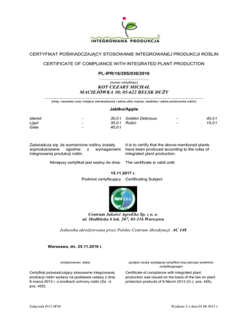 CERTYFIKAT POŚWIADCZAJĄCY STOSOWANIE INTEGROWANEJ PRODUKCJI ROŚLIN CERTIFICATE OF COMPLIANCE WITH INTEGRATED PLANT PRODUCTION PL-IPR/16/29S/036/2016 ....................................... (numer certyfikatu) KOT CEZARY MICHAŁ MACIEJÓWKA 30; 05-622 BELSK DUŻY ............................................................................................................................. (imię, nazwisko oraz miejsce zamieszkania i adres albo nazwa, siedziba i adres producenta roślin) Jabłko/Apple Idared Ligol Gala - 30,0 t 30,0 t 40,0 t Zaświadcza się, że wymienione rośliny zostały wyprodukowane zgodnie z wymaganiami integrowanej produkcji roślin. Niniejszy certyfikat jest ważny do dnia: Golden Delicious Rubin - 40,0 t 15,0 t It is to certify that the above-mentioned plants have been produced according to the rules of integrated plant production. The certificate is valid until: 15.11.2017 r. Podmiot certyfikujący Certificating Subject Centrum Jakości AgroEko Sp. z o. o. ul. Modlińska 6 lok. 207, 03-216 Warszawa Jednostka akredytowana przez Polskie Centrum Akredytacji AC 148 Warszawa, dn. 25.11.2016 r. (miejscowość, data) Certyfikat poświadczający stosowanie integrowanej produkcji roślin wydany na podstawie ustawy z dnia 8 marca 2013 r. o środkach ochrony roślin (Dz. U. poz. 455). Załącznik Pr13-IP20 (podpis osoby wydającej certyfikat oraz pieczęć podmiotu certyfikującego) Certificate of compliance with integrated plant production was issued on the basis of the law on plant protection products of 8 March 2013 (O.J. pos. 455). Wydanie 2 z dnia 03.08.2015 r.