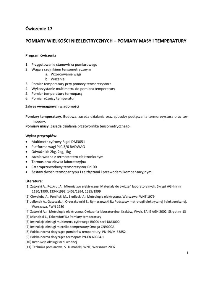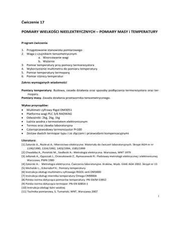 Ćwiczenie 17 POMIARY WIELKOŚCI NIEELEKTRYCZNYCH – POMIARY MASY i TEMPERATURY Program ćwiczenia 1. Przygotowanie stanowiska pomiarowego 2. Waga z czujnikiem tensometrycznym a. Wzorcowanie wagi b. Ważenie 3. Pomiar temperatury przy pomocy termorezystora 4. Wykorzystanie multimetru do pomiaru temperatury 5. Pomiar temperatury termoparą 6. Pomiar różnicy temperatur Zakres wymaganych wiadomości Pomiary temperatury. Budowa, zasada działania oraz sposoby podłączania termorezystora oraz ter‐ mopary. Pomiary masy. Zasada działania przetwornika tensometrycznego. Wykaz przyrządów: • Multimetr cyfrowy Rigol DM3051 • Platforma wagi PLC 3/6 RADWAG • Odważniki: 2kg, 2kg, 1kg • Łaźnia wodna z termostatem elektronicznym • Termos oraz zlewka laboratoryjna • Czteroprzewodowy termorezystor Pr100 • Zestaw dwóch termopar typu J ze złączami i przewodami kompensacyjnymi Literatura: [1] Zatorski A., Rozkrut A.: Miernictwo elektryczne. Materiały do ćwiczeń laboratoryjnych. Skrypt AGH nr nr 1190/1990, 1334/1992, 1403/1994, 1585/1999 [2] Chwaleba A., Poniński M., Siedlecki A.: Metrologia elektryczna. Warszawa, WNT 1979 [3] Jellonek A., Gąszczak J., Orzeszkowski Z., Rymaszewski R.: Podstawy metrologii elektrycznej i elektronicznej. Warszawa, PWN 1980 [4] Zatorski A.: Metrologia elektryczna. Ćwiczenia laboratoryjne. Kraków, Wydz. EAIiE AGH 2002. Skrypt nr 13 [5] Michalski L., Eckersdorf K.: Pomiary temperatury [6] Instrukcja obsługi multimetru cyfrowego RIGOL serii DM3000 [7] Instrukcja obsługi miernika temperatury Omega CN9000A [8] Polska norma dotycząca pomiarów temperatury: PN‐59/M‐53852 [9] Polska norma dotycząca termopar: PN‐EN 60854‐1 [10] Instrukcja obsługi łaźni wodnej [11] Technika pomiarowa, S. Tumański, WNT, Warszawa 2007 1 1. Przygotowanie stanowiska pomiarowego Ćwiczenie składa się z dwóch części. W pierwszej wykonane zostaną pomiary masy, zaś w drugiej pomiary temperatury. Pomiar temperatury wymaga przygotowania wody o różnej temperaturze. Temperaturę bliską 0°C osiąga się w termosie z mieszaniną lodu z małą ilością wody. Temperaturę wyższą zapewnia łaźnia wodna. Uwaga! Ponieważ na stanowisku znajdują się naczynia z wodą oraz urządzenia elektryczne pod napię‐ ciem, należy zachować szczególną ostrożność. Należy szczególnie uważać, by nie przewrócić termo‐ su, zlewki oraz by nie „utopić” dokumentacji lub elektroniki w łaźni wodnej. 1) Należy sprawdzić, czy na stanowisku znajduje się termos z lodem. Jeżeli brakuje lodu, należy zgłosić to prowadzącemu ćwiczenie. W celu ograniczenia nagrzewania mieszaniny, termos nale‐ ży zamknąć. Wyrównanie temperatury wody i lodu wymaga czasu dlatego punkt ten należy wy‐ konać na początku ćwiczenia. 2) Na stanowisku znajduje się łaźnia wodna z termostatem. Przed uruchomieniem łaźni należy sprawdzić czy w środku znajduje się woda przykrywająca element grzejny oraz wbudowany czuj‐ nik temperatury. Łaźnię należy włączyć oraz ustawić temperaturę termostatu na 60°C poprzez przytrzymanie klawisza set na sterowniku łaźni [10]. Osiągnięcie stabilizowanej temperatury wo‐ dy wymaga czasu, dlatego punkt ten należy wykonać na początku ćwiczenia. 3) Wszystkie pomiary temperatury należy zweryfikować dokonując pomiaru temperatury wzor‐ cowej (odniesienia), używając miernika Omega (rysunek 1) oraz podłączonego do niego czujnika Pt100 klasy A. Miernik należy włączyć na początku zajęć, aby ustaliła się jego temperatura we‐ wnętrzna. Podczas pomiarów wskazania tego miernika należy traktować jako wskazania wzor‐ cowe. Niepewność pomiaru temperatury miernika Omega wynosi ±0,2°C. Rysunek 1 Miernik temperatury odniesienia (Omega) 2 2. Waga z czujnikiem tensometrycznym Czujnik siły (do wagi) z mostkiem tensometrycznym składa się z elementu sprężystego przetwa‐ rzającego siłę na odpowiednie odkształcenia, przetwarzane następnie na zmiany rezystancji tenso‐ metrów (zwróć uwagę na konstrukcję czujnika platformy zapewniającą reakcję na siłę a nie moment siły). Mostek tensometryczny takiego czujnika charakteryzuje się wzmocnieniem napięciowym zależ‐ nym liniowo od siły. Specjalizowane układy mierniki przetwarzają właśnie wzmocnienie mostka ten‐ sometrycznego (użycie multimetru RIGOL do pomiaru stosunku napięć wymagałoby napięcia zasilają‐ cego poniżej 2V). Jeśli parametry czujnika są wyznaczane w tych samych warunkach (przy niezmienia‐ jącej się wartości napięcia zasilania) co jego użycie do ważenia to możliwe jest skorzystanie z tego, że przy niezmieniającej się wartości napięcia zasilania napięcie wyjściowe czujnika z mostkiem tensome‐ trycznym jest liniowo zależne od masy. W przy niespełnieniu tego warunku każda zmiana wartości napięcia zasilającego przełoży się bezpośrednio na dodatkowy błąd pomiaru masy. Rysunek 2 Schemat podłączenia wagi tensometrycznej Do czujnika platformy wagi podłączyć zasilanie 6V i multimetr (funkcja DC V) Przy stałej wartości napięcia zasilającego mostek tensometryczny czujnika wagi napięcie wyj‐ ściowe mostka jest liniowo zależne od masy U ( M ) = U 0 + SU ⋅ M gdzie: U 0 ‐ napięcie wyjściowe mostka przy zerowej masie (nieobciążona platforma) SU ‐ czułość napięciowa wagi M ‐ masa na platformie (ważona) Do wzorcowania i ważenia można użyć arkusza Waga.xls (w katalogu CW17). 3 2a. Wzorcowanie wagi Parametry U 0 i SU należy wyznaczyć podczas wzorcowania SU = U K − U0 MK gdzie: U 0 ‐ napięcie wyjściowe mostka przy zerowej masie (nieobciążona platforma) U K ‐ napięcie wyjściowe mostka przy masie kalibrującej M K 1) Bez obciążenia zmierzyć napięcie U0 2) Do arkusza wpisać wartość (U0) i graniczną niepewność bezwzględną (DU0) 3) Obciążyć wagę masą wzorcową Mk (odważniki 2kg+2kg+1kg klasa M3 0.05%) i zmierzyć napięcie Uk 4) Do arkusza wp