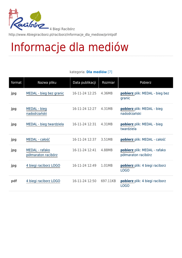 4 Biegi Racibórz http://www.4biegiraciborz.pl/raciborz/informacje_dla_mediow/printpdf Informacje dla mediów kategoria: Dla mediów [7] format Nazwa pliku Data publikacji Rozmiar Pobierz jpg MEDAL - bieg bez granic 16-11-24 12:25 4.36MB pobierz plik: MEDAL - bieg bez granic jpg MEDAL - bieg nadodrzański 16-11-24 12:27 4.31MB pobierz plik: MEDAL - bieg nadodrzański jpg MEDAL - bieg twardziela 16-11-24 12:31 4.31MB pobierz plik: MEDAL - bieg twardziela jpg MEDAL - całość 16-11-24 12:37 3.51MB pobierz plik: MEDAL - całość jpg MEDAL - rafako półmaraton racibórz 16-11-24 12:41 4.88MB pobierz plik: MEDAL - rafako półmaraton racibórz jpg 4 biegi raciborz LOGO 16-11-24 12:49 1.01MB pobierz plik: 4 biegi raciborz LOGO pdf 4 biegi raciborz LOGO 16-11-24 12:50 697.11KB pobierz plik: 4 biegi raciborz LOGO