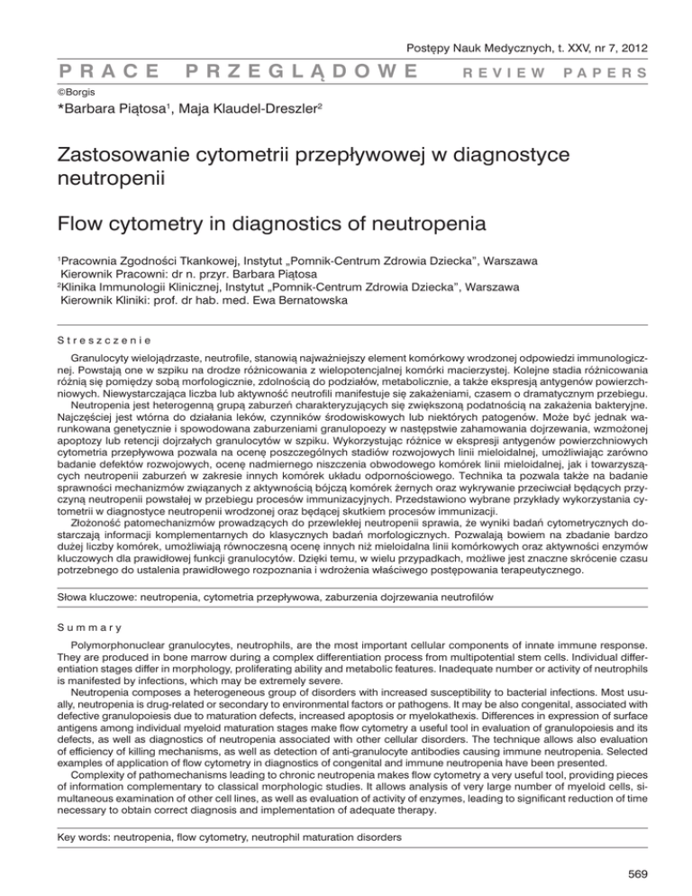 Postępy Nauk Medycznych, t. XXV, nr 7, 2012 prace przeglądowe RE v i e w papers ©Borgis *Barbara Piątosa1, Maja Klaudel-Dreszler2 Zastosowanie cytometrii przepływowej w diagnostyce neutropenii Flow cytometry in diagnostics of neutropenia Pracownia Zgodności Tkankowej, Instytut „Pomnik-Centrum Zdrowia Dziecka”, Warszawa Kierownik Pracowni: dr n. przyr. Barbara Piątosa 2 Klinika Immunologii Klinicznej, Instytut „Pomnik-Centrum Zdrowia Dziecka”, Warszawa Kierownik Kliniki: prof. dr hab. med. Ewa Bernatowska 1 Streszczenie Granulocyty wielojądrzaste, neutrofile, stanowią najważniejszy element komórkowy wrodzonej odpowiedzi immunologicznej. Powstają one w szpiku na drodze różnicowania z wielopotencjalnej komórki macierzystej. Kolejne stadia różnicowania różnią się pomiędzy sobą morfologicznie, zdolnością do podziałów, metabolicznie, a także ekspresją antygenów powierzchniowych. Niewystarczająca liczba lub aktywność neutrofili manifestuje się zakażeniami, czasem o dramatycznym przebiegu. Neutropenia jest heterogenną grupą zaburzeń charakteryzujących się zwiększoną podatnością na zakażenia bakteryjne. Najczęściej jest wtórna do działania leków, czynników środowiskowych lub niektórych patogenów. Może być jednak warunkowana genetycznie i spowodowana zaburzeniami granulopoezy w następstwie zahamowania dojrzewania, wzmożonej apoptozy lub retencji dojrzałych granulocytów w szpiku. Wykorzystując różnice w ekspresji antygenów powierzchniowych cytometria przepływowa pozwala na ocenę poszczególnych stadiów rozwojowych linii mieloidalnej, umożliwiając zarówno badanie defektów rozwojowych, ocenę nadmiernego niszczenia obwodowego komórek linii mieloidalnej, jak i towarzyszących neutropenii zaburzeń w zakresie innych komórek układu odpornościowego. Technika ta pozwala także na badanie sprawności mechanizmów związanych z aktywnością bójczą komórek żernych oraz wykrywanie przeciwciał będących przyczyną neutropenii powstałej w przebiegu procesów immunizacyjnych. Przedstawiono wybrane przykłady wykorzystania cytometrii w diagnostyce neutropenii wrodzonej oraz będącej skutkiem procesów immunizacji. Złożoność patomechanizmów prowadzących do przewlekłej neutropenii sprawia, że wyniki badań cytometrycznych dostarczają informacji komplementarnych do klasycznych badań morfologicznych. Pozwalają bowiem na zbadanie bardzo dużej liczby komórek, umożliwiają równoczesną ocenę innych niż mieloidalna linii komórkowych oraz aktywności enzymów kluczowych dla prawidłowej funkcji granulocytów. Dzięki temu, w wielu przypadkach, możliwe jest znaczne skrócenie czasu potrzebnego do ustalenia prawidłowego rozpoznania i wdrożenia właściwego postępowania terapeutycznego. Słowa kluczowe: neutropenia, cytometria przepływowa, zaburzenia dojrzewania neutrofilów Summary Polymorphonuclear granulocytes, neutrophils, are the most important cellular components of innate immune response. They are produced in bone marrow during a complex differentiation process from multipotential stem cells. Individual differentiation stages differ in morphology, proliferating ability and metabolic features. Inadequate number or activity of neutrophils is manifested by infections, which may be extremely severe. Neutropenia composes a heterogeneous group of disorders with increased susceptibility to bacterial infections. Most usually, neutropenia is drug-related or secondary to environmental factors or pathogens. It may be also congenital, associated with defective granulopoiesis due to maturation defects, increased apoptosis or myelokathexis. Differences in expression of surface antigens among individual myeloid maturation stages make flow cytometry a useful tool in evaluation of granulopoiesis and its defects, as well as diagnostics of neutropenia associated with other cellular disorders. The technique allows also evaluation of efficiency of killing mechanisms, as well as detection of anti-granulocyte antibodies causing immune neutropenia. Selected examples of application of flow cytometry in diagnostics of congenital and immune neutropenia have been presented. Complexity of pathomechanisms leading to chronic neutropenia makes flow cytometry a very useful tool, providing pieces of information complementary to classical morphologic studies. It allows analysis of very large number of myeloid cells, simultaneous examination of other cell lines, as well as evaluation of activity of enzymes, leading to significant reduction of time necessary to obtain correct diagnosis and implementation of adequate therapy. Key words: neutropenia, flow cytometry, neutrophil maturation disorders 569 Barbara Piątosa, Maja Klaudel-Dreszler WSTĘP Granulocyty wielojądrzaste, neutrofile, stanowią najważniejszy element komórkowy wrodzonej odpowiedzi immunologicznej. Powstają one w szpiku na drodze różnicowania z wielopotencjalnej komórki macierzystej. Kolejne stadia różnicowania, od najmłodszego mieloblasta poprzez promielocyt, mielocyt, metamielocyt, granulocyt z jądrem pałeczkowatym po neutrofil z jądrem segmentowanym, różnią się pomiędzy sobą morfologicznie, zdolnością do podziałów, metabolicznie, a także ekspresją antygenów powierzchniowych (1). Dojrzewanie od etapu mieloblasta do dojrzałego neutrofila z jądrem podzielonym trwa około 10-12 dni. Neutrofile są komórkami krótkożyjącymi (12-72 godzin), lecz dzięki ekspresji swoistych receptorów ułatwiających toczenie, wiązanie i przyleganie do śródbłonka naczyniowego i produkcji licznych cytokin i chemokin mogą działać w pierwszej linii obrony (2, 3). Granulocyty wielojądrzaste odgrywają zasadniczą rolę w odpowiedzi zapalnej na zakażenia bakteryjne i grzybicze (4, 5), gojeniu ran i sterowaniu odpowiedzią immunologiczną (6). Niewystarczająca liczba lub aktywność neutrofili manifestuje się zakażeniami, czasem o dramatycznym przebiegu. Neutr
