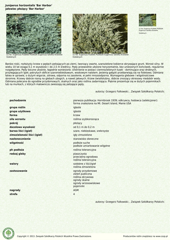 Juniperus horizontalis 'Bar Harbor' jałowiec płożący 'Bar Harbor' (c) fot. Eugeniusz Pudełek PUDEŁEK Eugeniusz Szkółka Krzewów Ozdobnych (c) fot. Eugeniusz Pudełek PUDEŁEK Eugeniusz Szkółka Krzewów Ozdobnych (c) fot. Eugeniusz Pudełek PUDEŁEK Eugeniusz Szkółka Krzewów Ozdobnych Bardzo niski, rozłożysty krzew o pędach pełzających po ziemi, tworzący zwarte, szarozielone kobierce okrywające grunt. Wzrost silny. W wieku 10 lat osiąga 0,1 m wysokości i do 2,5 m średnicy. Pędy przewodnie ułożone horyzontalnie, bez uniesionych końcówek, regularnie rozgałęzione. Pędy boczne ukośnie, łagodnie wzniesione. Ulistnienie w postaci ciemnozielonych łusek - dominujące oraz drobnych, przylegających igieł, pokrytych obficie szaroniebieskawym, woskowym nalotem. Jesienią gałązki przebarwiają się na fioletowo. Odmiana łatwa w uprawie, o dużym wigorze, zdrowa, odporna na zasolenie, w pełni mrozoodporna. Wymagania glebowe i wilgotnościowe skromne. Krzewy dobrze rosną na glebach ubogich, a nawet jałowych. Krzew światłolubny, dobrze znoszący okresowy niedobór wody. Odmiana polecana do ogrodów przydomowych, skalnych oraz jako roślina zadarniająca. Pięknie prezentuje się w dużych pojemnikach lub na murkach, z których malowniczo zwieszają się pełzające pędy. autorzy: Grzegorz Falkowski; , Związek Szkółkarzy Polskich; pochodzenie pierwsza publikacja: Hornibrook 1939; odkrywca, hodowca (selekcjoner): forma znaleziona na Mt. Desert Island, Maine USA grupa roślin iglaste grupa użytkowa iglaste forma krzew siła wzrostu roślina szybkorosnąca pokrój płożący docelowa wysokość od 0,1 m do 0,2 m barwa liści (igieł) szare, niebieskawe, srebrzyste zimozieloność liści (igieł) igły zimozielone nasłonecznienie stanowisko słoneczne wilgotność podłoże suche podłoże umiarkowanie wilgotne ph podłoża roślina tolerancyjna rodzaj gleby piaszczysta przeciętna ogrodowa roślina tolerancyjna walory ozdobne z liści/igieł roślina zimozielona zastosowanie ogrody przydomowe zieleń publiczna roślina okrywowa ogrody skalne ogrody wrzosowiskowe pojemniki nagrody AGM strefa 4 autorzy: Grzegorz Falkowski; , Związek Szkółkarzy Polskich; Copyright © 2013. Związek Szkółkarzy Polskich Wszelkie Prawa Zastrzeżone. Producentów roślin znajdziesz na www.zszp.pl