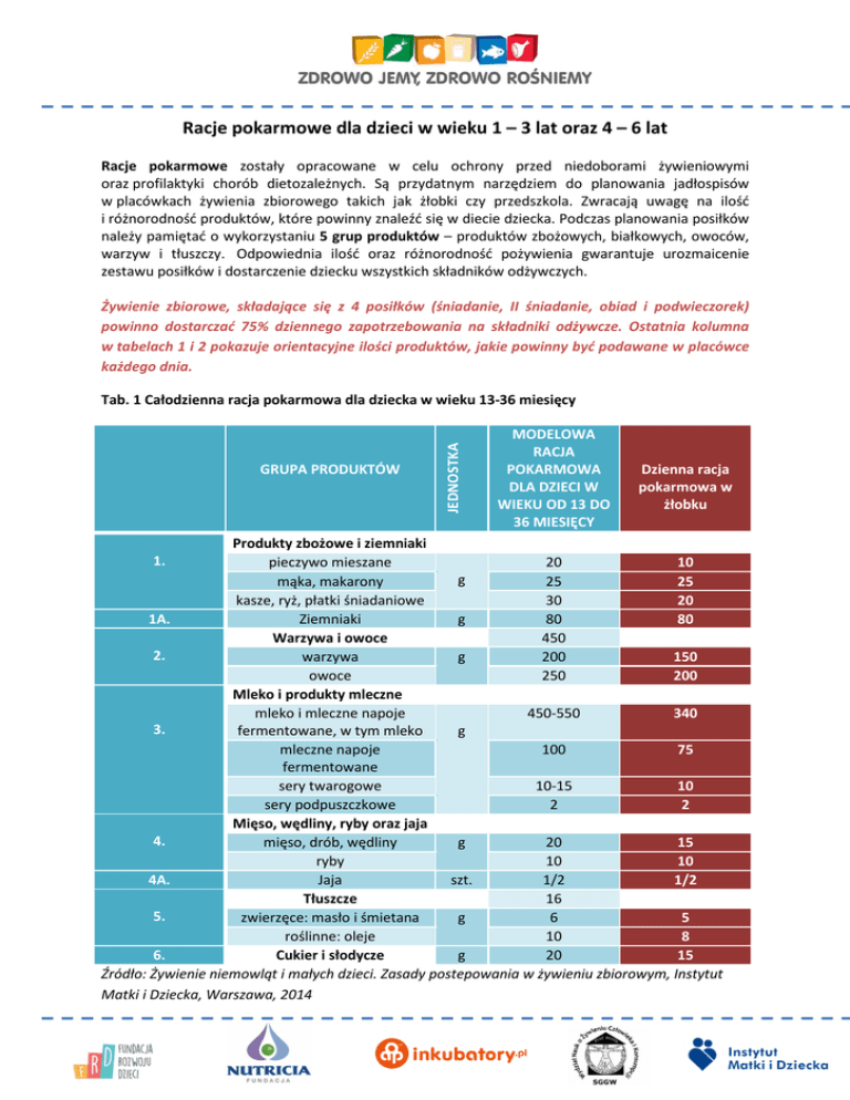 Racje pokarmowe dla dzieci w wieku 1 – 3 lat oraz 4 – 6 lat Racje pokarmowe zostały opracowane w celu ochrony przed niedoborami żywieniowymi oraz profilaktyki chorób dietozależnych. Są przydatnym narzędziem do planowania jadłospisów w placówkach żywienia zbiorowego takich jak żłobki czy przedszkola. Zwracają uwagę na ilość i różnorodność produktów, które powinny znaleźć się w diecie dziecka. Podczas planowania posiłków należy pamiętać o wykorzystaniu 5 grup produktów – produktów zbożowych, białkowych, owoców, warzyw i tłuszczy. Odpowiednia ilość oraz różnorodność pożywienia gwarantuje urozmaicenie zestawu posiłków i dostarczenie dziecku wszystkich składników odżywczych. Żywienie zbiorowe, składające się z 4 posiłków (śniadanie, II śniadanie, obiad i podwieczorek) powinno dostarczać 75% dziennego zapotrzebowania na składniki odżywcze. Ostatnia kolumna w tabelach 1 i 2 pokazuje orientacyjne ilości produktów, jakie powinny być podawane w placówce każdego dnia. GRUPA PRODUKTÓW JEDNOSTKA Tab. 1 Całodzienna racja pokarmowa dla dziecka w wieku 13-36 miesięcy MODELOWA RACJA POKARMOWA DLA DZIECI W WIEKU OD 13 DO 36 MIESIĘCY Dzienna racja pokarmowa w żłobku Produkty zbożowe i ziemniaki 1. pieczywo mieszane 20 10 g mąka, makarony 25 25 kasze, ryż, płatki śniadaniowe 30 20 1A. Ziemniaki g 80 80 Warzywa i owoce 450 2. warzywa g 200 150 owoce 250 200 Mleko i produkty mleczne mleko i mleczne napoje 450-550 340 3. fermentowane, w tym mleko g mleczne napoje 100 75 fermentowane sery twarogowe 10-15 10 sery podpuszczkowe 2 2 Mięso, wędliny, ryby oraz jaja 4. mięso, drób, wędliny g 20 15 ryby 10 10 4A. Jaja szt. 1/2 1/2 Tłuszcze 16 5. zwierzęce: masło i śmietana g 6 5 roślinne: oleje 10 8 6. Cukier i słodycze g 20 15 Źródło: Żywienie niemowląt i małych dzieci. Zasady postepowania w żywieniu zbiorowym, Instytut Matki i Dziecka, Warszawa, 2014 Tab. 2 Całodzienna racja pokarmowa dla dziecka w wieku 4-6 lat GRUPA PRODUKTÓW JEDNOSTKA ILOŚĆ PRODUKTU Dzienna racja pokarmowa w przedszkolu Produkty zbożowe i ziemniaki pieczywo mieszane 150 110 1. g mąka, makarony 30 30 kasze, ryż, płatki 35 25 śniadaniowe ziemniaki g 200 200 Warzywa i owoce 650 2. warzywa g 400 300 owoce 250 200 Mleko i produkty mleczne mleko i mleczne napoje 550 400 3. fermentowane g sery twarogowe 45 35 sery podpuszczkowe 5 5 Mięso, wędliny, ryby oraz jaja mięso, drób 30 30 4. g wędliny 20 10 ryby 5 5 Jaja szt. 3/4 1/2 Tłuszcze 38 5. zwierzęce: masło i 25 18 śmietana g roślinne: oleje i margaryny 13 10 6. Cukier i słodycze g 30 20 Źródło: Podstawy naukowe żywienia w szpitalach, Instytut Żywności i Żywienie, Warszawa, 2001 Produkty białkowe: Mleko i przetwory mleczne - do tej grupy zaliczamy jogurty, maślanki, kefiry, sery twarogowe, sery podpuszczkowe (żółte sery) oraz mleko. Mleko i produkty mleczne są źródłem: wapnia (pierwiastka niezbędnego do budowy kości), magnezu, łatwoprzyswajalnego, pełnowartościowego białka oraz witamin z gr B. Witaminę D możemy znaleźć w mleku modyfikowanym, które jest specjalnie wzbogacane w tę witaminę. Kefir, jogurt, maślankę czy mleko świetnie nadają się jako baza do przygotowania pysznych koktajli. Jogurt możemy dodać do sałatek owocowych, zastąpić nim można śmietanę w mizerii, czy przygotować lekki czosnkowy sos. Kefir i maślanka są doskonałe wiosną i latem, gdyż świetnie orzeźwiają i doskonale smakują z dodatkiem owoców. Możemy je podawać na drugie śniadanie lub podwieczorek do pysznej kanapki. Jogurty i kefiry ze względu na obniżoną ilość laktozy (cukru mlecznego) i dzięki obecność bakterii kwasu mlekowego są lepiej tolerowane przez niektóre dzieci niż mleko. Mięso, drób, ryby, jaja dostarczają pełnowartościowego białka, dobrze przyswajalnego żelaza, cynku oraz witamin: B1, PP, B12. Dodatkowo ryby są cennym źródłem jodu i dobrych tłuszczów z rodziny omega-3. Do szczególnie zalecanych dla dzieci ryb tłustych należą: łosoś, makrela atlantycka. Ryby chude, które powinny być spożywane przez dziecko to: dorsz, morszczuk, mintaj, sola. Z ryb słodkowodnych najlepsze będą: karp, pstrąg. Ryby w diecie dzieci powinny być podawane raz w tygodniu - przygotowane na parze, pieczone w piekarniku, podane w postaci pasty. Należy unikać konserw rybnych i ryb wędzonych ze względu na dużą zawartość sodu w tych produktach. Mięso najlepsze będzie chude świeże mięso o wysokiej jakości. Mięso z drobiu (indyk, kurczak) jest lekkostrawne, bogate w białko. W żywieniu najmłodszych zaleca się podawać mięso gotowane, gotowane na parze bądź pieczone. Należy unikać smażenia na głębokim tłuszczu. Jaja są skoncentrowanym źródłem cennych składników odżywczych - pełnowartościowego białka, tłuszczu, biopierwiastków, witamin rozpuszczalnych w tłuszczach oraz lecytyny. Najlepiej podawać je w formie gotowanych na miękko, na twardo, delikatnej jajecznicy i w postaci past rybnych. Tygodniowo można podać dziecku 3-4 jaja (średnio ½ jajka dziennie). Produkty zbożowe: Dostarczają do organizmu węglowodany złożone i dlatego stanowią podstawowe źródło energii. Zawierają witaminy z grupy B, składniki mineralne (wapń, fosfor, magnez, miedź, selen, chrom) oraz błonnik - niezbędny dla prawidłowej pracy przewodu pokarmowego, który działa jak szczoteczka, poprawia perystaltykę jelit. Dieta dziecka powinna dostarczać 10 – 14 g błonnika pokarmowego (max.19g). Częstym problemem wśród dzieci jest celiakia. Dzieci, które mają alergię na gluten, nie mogą spożywać produktów zbożowych, jednak takie produkty jak: ryż biały, brązowy, kukurydza, gryka, proso, amarantus, quinoa, mąki i kasze ze zbóż naturalnie bezglutenowych (np. kasza jaglana z prosa, gryczana), płatki ryżowe, skrobia kukurydziana, ryżowa i z tapioki, gotowe mieszanki mączne bezglutenowe, pieczywo i makarony z 