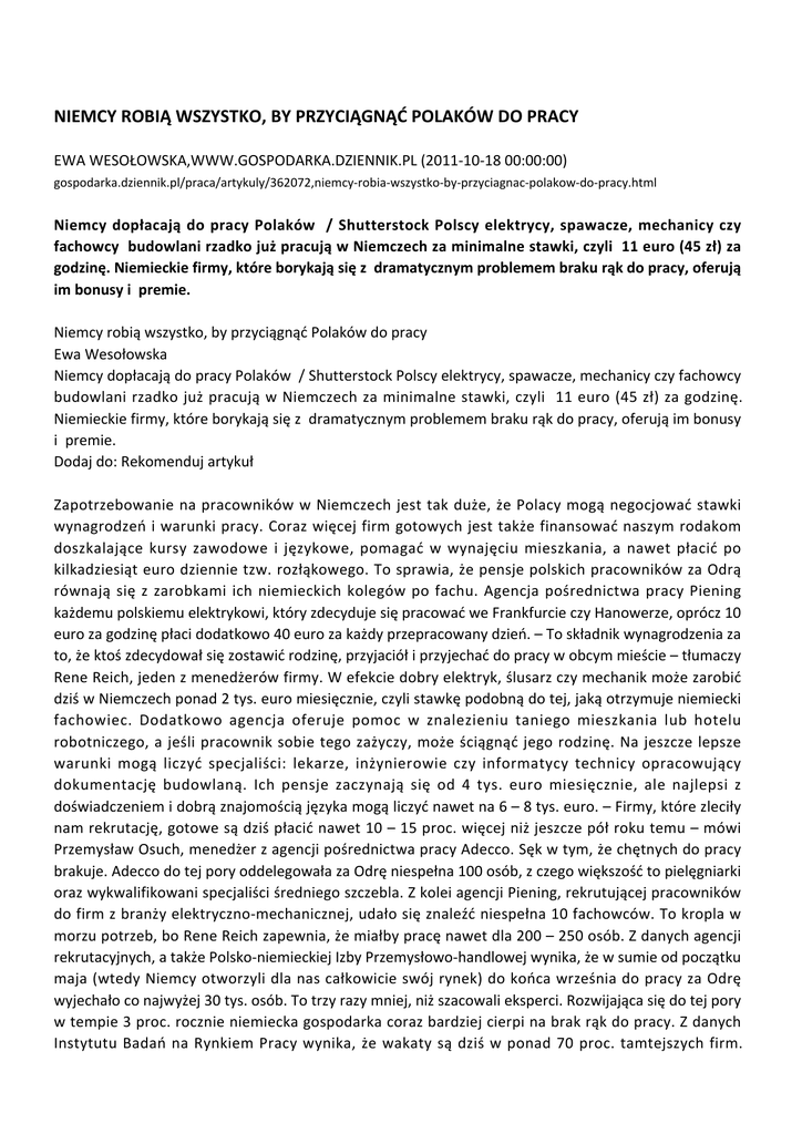 NIEMCY ROBIĄ WSZYSTKO, BY PRZYCIĄGNĄĆ POLAKÓW DO PRACY EWA WESOŁOWSKA,WWW.GOSPODARKA.DZIENNIK.PL (2011-10-18 00:00:00) gospodarka.dziennik.pl/praca/artykuly/362072,niemcy-robia-wszystko-by-przyciagnac-polakow-do-pracy.html Niemcy dopłacają do pracy Polaków / Shutterstock Polscy elektrycy, spawacze, mechanicy czy fachowcy budowlani rzadko już pracują w Niemczech za minimalne stawki, czyli 11 euro (45 zł) za godzinę. Niemieckie firmy, które borykają się z dramatycznym problemem braku rąk do pracy, oferują im bonusy i premie. Niemcy robią wszystko, by przyciągnąć Polaków do pracy Ewa Wesołowska Niemcy dopłacają do pracy Polaków / Shutterstock Polscy elektrycy, spawacze, mechanicy czy fachowcy budowlani rzadko już pracują w Niemczech za minimalne stawki, czyli 11 euro (45 zł) za godzinę. Niemieckie firmy, które borykają się z dramatycznym problemem braku rąk do pracy, oferują im bonusy i premie. Dodaj do: Rekomenduj artykuł Zapotrzebowanie na pracowników w Niemczech jest tak duże, że Polacy mogą negocjować stawki wynagrodzeń i warunki pracy. Coraz więcej firm gotowych jest także finansować naszym rodakom doszkalające kursy zawodowe i językowe, pomagać w wynajęciu mieszkania, a nawet płacić po kilkadziesiąt euro dziennie tzw. rozłąkowego. To sprawia, że pensje polskich pracowników za Odrą równają się z zarobkami ich niemieckich kolegów po fachu. Agencja pośrednictwa pracy Piening każdemu polskiemu elektrykowi, który zdecyduje się pracować we Frankfurcie czy Hanowerze, oprócz 10 euro za godzinę płaci dodatkowo 40 euro za każdy przepracowany dzień. – To składnik wynagrodzenia za to, że ktoś zdecydował się zostawić rodzinę, przyjaciół i przyjechać do pracy w obcym mieście – tłumaczy Rene Reich, jeden z menedżerów firmy. W efekcie dobry elektryk, ślusarz czy mechanik może zarobić dziś w Niemczech ponad 2 tys. euro miesięcznie, czyli stawkę podobną do tej, jaką otrzymuje niemiecki fachowiec. Dodatkowo agencja oferuje pomoc w znalezieniu taniego mieszkania lub hotelu robotniczego, a jeśli pracownik sobie tego zażyczy, może ściągnąć jego rodzinę. Na jeszcze lepsze warunki mogą liczyć specjaliści: lekarze, inżynierowie czy informatycy technicy opracowujący dokumentację budowlaną. Ich pensje zaczynają się od 4 tys. euro miesięcznie, ale najlepsi z doświadczeniem i dobrą znajomością języka mogą liczyć nawet na 6 – 8 tys. euro. – Firmy, które zleciły nam rekrutację, gotowe są dziś płacić nawet 10 – 15 proc. więcej niż jeszcze pół roku temu – mówi Przemysław Osuch, menedżer z agencji pośrednictwa pracy Adecco. Sęk w tym, że chętnych do pracy brakuje. Adecco do tej pory oddelegowała za Odrę niespełna 100 osób, z czego większość to pielęgniarki oraz wykwalifikowani specjaliści średniego szczebla. Z kolei agencji Piening, rekrutującej pracowników do firm z branży elektryczno-mechanicznej, udało się znaleźć niespełna 10 fachowców. To kropla w morzu potrzeb, bo Rene Reich zapewnia, że miałby pracę nawet dla 200 – 250 osób. Z danych agencji rekrutacyjnych, a także Polsko-niemieckiej Izby Przemysłowo-handlowej wynika, że w sumie od początku maja (wtedy Niemcy otworzyli dla nas całkowicie swój rynek) do końca września do pracy za Odrę wyjechało co najwyżej 30 tys. osób. To trzy razy mniej, niż szacowali eksperci. Rozwijająca się do tej pory w tempie 3 proc. rocznie niemiecka gospodarka coraz bardziej cierpi na brak rąk do pracy. Z danych Instytutu Badań na Rynkiem Pracy wynika, że wakaty są dziś w ponad 70 proc. tamtejszych firm. Bezrobocie w Niemczech wynosi 6 proc. Główną barierą dla Polaków do podejmowania tam pracy jest słaba znajomość niemieckiego. – Bez umiejętności porozumiewania się w tym języku szans na pracę nie mają specjaliści średniego i wyższego szczebla – mówi Osuch. Mniejsze wymagania polskim pracownikom stawiają natomiast pracodawcy poszukujący osób do prostych prac produkcyjnych czy budowlanych. Polskie agencje pośrednictwa pracy wyspecjalizowały się nawet w tworzeniu całych zespołów, w których tylko jedna, czasem dwie osoby znają język. Pełnią one funkcję tzw. liderów, pośredniczących w przekazywaniu uwag i komunikatów pracodawcy. Takie ekipy montuje m.in. Work Express, a także agencja Otto. Pośrednicy troszczą się też, żeby na miejscu były instrukcje i ulotki w języku polskim. Agencja Piening od listopada rusza z darmowymi kursami niemieckiego w Katowicach i Poznaniu. – Jeśli będzie zainteresowanie naszą ofertą, to uruchomimy podobne kursy w innych miastach – mówi Rene Reich. Nie wiadomo jednak, czy z czasem popyt na polskich pracowników w Niemczech nie będzie maleć. Federalna Agencja Pracy poszukuje już specjalistów w Hiszpanii, Grecji i Portugalii, gdzie utrzymuje się wysokie bezrobocie. O tym, że rynek za Odrą może się skurczyć, świadczą też ostatnie prognozy, które zapowiadają spowolnienie wzrostu gospodarczego. A w 2013 roku do pracy za Odrę ruszą Rumuni i Bułgarzy. W 2013 roku do pracy ruszą Rumuni i Bułgarzy Komentarz prawny Polacy wybierający się do Niemiec powinni szukać tam zatrudnienia na podstawie umowy o pracę. Alternatywą jest zatrudnienie przez agencję pracy tymczasowej, ale jest ono zwykle mniej korzystne. Po pierwsze pracownika agencji pracy tymczasowej łatwiej zwolnić niż pracownika na stałym etacie zatrudnionego bezpośrednio u niemieckiego przedsiębiorcy. Po drugie płaca minimalna w agencji pracy tymczasowej jest zwykle niższa niż obowiązująca na podstawie niemieckich układów zbiorowych pracy w popularnych zawodach, takich jak budowlańcy, elektrycy, pielęgniarki, malarze czy dekarze. Jeśli chodzi o minimalną pensję w tych branżach, to może ona wynosić nawet do 45 zł za godzinę, co daje nawet 7000 zł miesięcznie przy pracy po 40 godzin tygodniowo. Zatrudniając się na umowę 