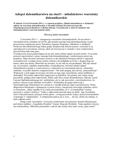 Adepci dziennikarstwa na start! - młodzieżowe warsztaty dziennikarskie W dniach 13,14,15 kwietnia 2011 r. w ramach projektu „Młodzi dziennikarze w działaniu” odbyły się warsztaty dziennikarskie w Ośrodku Szkolno-Wychowawczym dla Niepełnosprawnych Ruchowo w Busku-Zdroju. Uczestniczyło w nich 25 członków kół dziennikarskich z czterech buskich szkół. Pierwszy dzień warsztatów 13 kwietnia 2011 r. – inauguracja warsztatów dziennikarskich. Na ten dzień z niecierpliwością czekałam od chwili, gdy projekt naszego koła dziennikarskiego został pozytywnie rozpatrzony przez Narodową Agencje Programu „Młodzież w działaniu”. Ponieważ dla młodzieżowego lidera grupy inicjatywnej, którym jestem, warsztaty te są największym wyzwaniem, emocje, jakie mi towarzyszą w związku z tym wydarzeniem, powoli biorą nade mną górę. Z każdą nową twarzą pojawiającą się na sali, mam ochotę zapaść się pod ziemię. To ja mam przecież opowiedzieć o pracy naszego koła dziennikarskiego i realizowanym przez nas projekcie. Mam również mieszane uczucia co do młodzieży biorącej udział w zajęciach warsztatowych. Z jednej strony jestem ciekawa ich podglądu na świat, z drugiej boję się barier, jakie nas dzielą. Obawiam się również, że nie uda się ich przełamać. Mój lęk okazał się, na szczęście, zupełnie niepotrzebny i bezpodstawny, bowiem młodzi adepci dziennikarstwa pytani w czasie przerwy o atmosferę na warsztatach mówią: „atmosfera rodzinna, wszystko fachowo zorganizowane”. Oni sami pragną, jak mówią „samorealizacji”. Większość z nich nigdy do tej pory nie była na tego typu warsztatach, zatem trafiliśmy w dziesiątkę! Wszystkie odpowiedzi nagrywam na dyktafon. Na pytanie, jak widzą swoją przyszłość, padają różne odpowiedzi. Kilka osób chce zostać dziennikarzem, Maciek, uczeń Liceum Ogólnokształcącego nr1- politykiem, ale to, jak sam mówi „zawód pokrewny, bo politycy muszą wciąż udzielać wywiadów”. Podchodzę do grupy dziewcząt z Samorządowego Gimnazjum nr1, pytam je o wpadki podczas zajęć warsztatowych. Niska, długowłosa blondynka o ujmującym wyrazie twarzy, energicznie chwytając dyktafon, mówi ze śmiechem: „Moja wpadka to ta, kiedy powiedziałam, że w „Cosmopolitan” można poczytać o wojnie i polityce.” Jedna z odpowiedzi powala mnie na deski. Aga, licealistka, mówi zdecydowanym, pewnym tonem głosu: „swoją przyszłość wiążę z pracą korenspodenta wojennego w Afganistanie”. Z osłupieniem patrzę jej w oczy… ale nie, chyba nie żartuje, to było całkiem serio! Druga część warsztatów- ćwiczymy tytułowanie oraz piszemy artykuł informacyjny pod okiem redaktor „Tygodnika Ponidzie” Joanny Strączek-Dziabały. Tutaj zupełnie wszyscy się rozkręciliśmy. Mikrofon przechodzi z rąk do rąk; każdy chce mieć swoje „pięć minut”. 1 Martyna czyta swój artykuł informacyjny Drugi dzień warsztatów Kolejny dzień zajęć warsztatowych przebiega pod hasłem „Rozbieranie reportażu”. Tego bezpruderyjnego faktu dokonujemy z pomocą redaktora naczelnego tygodnika „Korso” pana Andrzeja Boryckiego. Rozpętuje się burza pomysłów na ciekawe reportaże i tytuły do nich. Każdy zespół zapisuje swoje propozycje na tablicy interaktywnej. Zostaje ogłoszony konkurs na najlepszy reportaż. Nagroda jest nie byle jaka- atrybut rasowego dziennikarza- dyktafon cyfrowy! 2 Dominika Wojnowska i Ola Keler podczas prezentowania tematów na reportaż Trzeci dzień warsztatów I wreszcie nadchodzi 15 kwietnia, dzień, w którym mamy poznać osobiście celebrytkę programu „Rozmowy w toku” panią Ewę Drzyzgę. Gdy podczas przerwy na poczęstunek pewnej grupie zadałam pytanie dotyczące przewidywanego wyglądu pani Ewy, jedna z dziewcząt, Klaudia z Zespołu Szkół Ponadgimnazjalnych nr 1, odpowiada: „ wydaje mi się, że bez tłumu charakteryzatorów i stylistów, będzie wyglądała bardziej naturalnie, tak jak my”. Mnie też tak wydaje. Cała drżę-mam dziś prezentować przy mikrofonie z koleżanką Martyną artykuł informacyjny napisany podczas pierwszego dnia zajęć, a poza tym poprowadzić mini„talk-show”. W głowie kłębią się różne myśli np. czy moja rozmowa z Gabrysią spodoba się pani Ewie? W duchu modlę się, aby się nie zająknąć, ponieważ wiem od opiekunki koła dziennikarskiego, że pani Ewa przywiązuję uwagę do dykcji oraz poprawności językowej. Moje myśli przerywa nagle dźwięk otwierających się z impetem drzwi, w których staje nieznana mi osoba. Ewa Drzyzga poza anteną. Wchodzi szybkim krokiem do sali, chwyta mikrofon i znanym mi dobrze z TVN-u głosem mówi: „ Przepraszam za spóźnienie, ale nie przewidziałam tego, że w miejscowości znajdującej się niedaleko was utknę w korku…” Klaudia miała rację. Dla wszystkich spoglądających na postać przy biurku, staje się jasne, że ta niepozorna, niczym nie wyróżniająca się z tłumu kobieta to Ewa Drzyzga. Myśl, która mi teraz przelatuje przez głowę jest taka: „ O rany!!! Co ta telewizja robi z człowiekiem!” Ledwo powstrzymuję się, żeby nie wygłosić tego publicznie. Pani Ewa w pantoflach na płaskim obcasie, kolorowej bawełnianej bluzce, dżinsowej spódnicy do kolan, z plecaczkiem, bez makijażu, wygląda dużo młodziej 3 niż na antenie TVN. Dziewczęcego uroku dodaje jej koński ogon-fryzura niespotykana u niej na wizji. Ewa Drzyzga Pani Ewa, jak przystało na pedagoga ( studiowała, jak mówi, na Akademii Pedagogicznej w Krakowie) zasypuje młodzież pytaniami: „Czego się nauczyliście?”. Uczniowie z zapałem odpowiadają: „ Jak tytułować, jak pisać reportaż, artykuł informacyjny”, „Kto z Was chce zostać dziennikarzem?”, tu pojawia się w górze las rąk, co budzi jej zdziwienie. Po tej krótkiej wymianie informacji adepci dziennikarstwa przystępują do pracy, odbywa się prezentacja artykułów informacyjnyc