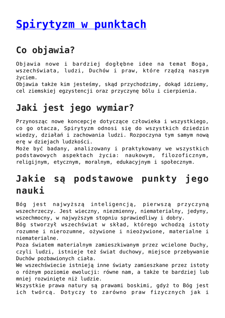 Spirytyzm w punktach Co objawia? Objawia nowe i bardziej dogłębne idee na temat Boga, wszechświata, ludzi, Duchów i praw, które rządzą naszym życiem. Objawia także kim jesteśmy, skąd przychodzimy, dokąd idziemy, cel ziemskiej egzystencji oraz przyczynę bólu i cierpienia. Jaki jest jego wymiar? Przynosząc nowe koncepcje dotyczące człowieka i wszystkiego, co go otacza, Spirytyzm odnosi się do wszystkich dziedzin wiedzy, działań i zachowania ludzi. Rozpoczyna tym samym nową erę w dziejach ludzkości. Może być badany, analizowany i praktykowany we wszystkich podstawowych aspektach życia: naukowym, filozoficznym, religijnym, etycznym, moralnym, edukacyjnym i społecznym. Jakie są podstawowe punkty jego nauki Bóg jest najwyższą inteligencją, pierwszą przyczyną wszechrzeczy. Jest wieczny, niezmienny, niematerialny, jedyny, wszechmocny, w najwyższym stopniu sprawiedliwy i dobry. Bóg stworzył wszechświat w skład, którego wchodzą istoty rozumne i nierozumne, ożywione i nieożywione, materialne i niematerialne. Poza światem materialnym zamieszkiwanym przez wcielone Duchy, czyli ludzi, istnieje też świat duchowy, miejsce przebywanie Duchów pozbawionych ciała. We wszechświecie istnieją inne światy zamieszkane przez istoty o różnym poziomie ewolucji: równe nam, a także te bardziej lub mniej rozwinięte niż ludzie. Wszystkie prawa natury są prawami boskimi, gdyż to Bóg jest ich twórcą. Dotyczy to zarówno praw fizycznych jak i moralnych. Człowiek jest Duchem wcielonym w materialne ciało. Ciało duchowe jest półmaterialną powłoką, która łączy Ducha z jego ciałem materialnym. Duchy są inteligentnymi istotami stworzenia. Stanowią część świata duchowego, który jest wieczny. Duchy w momencie stworzenia są proste i nieświadome. Ewoluują intelektualnie i moralnie przechodząc ze stopni niższych na wyższe aż do osiągnięcia doskonałości, gdy mogą już cieszyć się wiecznym szczęściem. Duchy zachowują swoją indywidualność przed, podczas i po każdym wcieleniu. Duchy reinkarnują się tyle razy, ile jest to konieczne, aby mogły się udoskonalać. Duchy ciągle ewoluują. W ich licznych egzystencjach cielesnych mogą pozostać bezczynne, lecz nigdy się nie cofają. Szybkość ich postępu intelektualnego i moralnego zależy od ich wysiłku skierowanego ku osiąganiu doskonałości. Duchy należą do różnych grup zależnie od stopnia doskonałości, który osiągnęły: Duchy czyste, które osiągnęły najwyższy stopień doskonałości; Duchy dobre, u których dominuje pragnienie dobra; Duchy niedoskonałe, które charakteryzuje brak wiedzy, skłanianie się ku złu i niższym instynktom. Relacje między Duchami i ludźmi są stałe i istnieją od zawsze. Dobre Duchy nakłaniają nas do czynienia dobra, wspierają nas w trudach naszego życia i pomagają nam je znosić z odwagą i rezygnacją. Duchy złe natomiast zachęcają nas do czynienia zła. Jezus jest przewodnikiem duchowym i wzorem do naśladowania dla całej ludzkości. Nauki, które wprowadzał w życie, są najczystszym wyrazem praw Boskich. Nauki Chrystusa zawarte w Ewangelii są przewodnikiem w ewolucji wszystkich ludzi, a ich stosowanie w życiu jest rozwiązaniem dla wszystkich ludzkich problemów i celem, który cała ludzkość ma kiedyś osiągnąć. Człowiek ma wolną wolę, by działać, jednak musi ponosić konsekwencje swych czynów. W przyszłym życiu ludzie doświadczą trosk lub radości zależnych od tego, czy postępowali w zgodzie z prawem Boskim. Modlitwa jest aktem uwielbienia Boga. Jest wpisana w prawo naturalne i wynika z wrodzonego przeczucia, które człowiek w sobie nosi, tak samo jak wrodzona jest w nim idea istnienia Boga. Modlitwa czyni człowieka lepszym. Ten, kto modli się z żarliwością i zaufaniem z większą siłą opiera się zachętom do czynienia zła. Bóg wysyła dobre Duchy, żeby mu towarzyszyły i pomagały. To pomoc, której nigdy nie odmawia, jeśli człowiek prosi o nią szczerze. Wcielanie zasad spirytyzmu w życie Każde wcielanie w życie zasad spirytystycznych jest bezinteresowne zgodnie z zasadą moralną Ewangelii: „Darmo otrzymaliście, darmo dawajcie.” Praktyka spirytystyczna jest realizowana z prostotą, bez żadnych zewnętrznych manifestacji według chrześcijańskiej zasady, która mówi, że Bóg ma być uwielbiany w duszy i w prawdzie. W Spirytyzmie nie ma kapłanów. Na zebraniach i w praktykach spirytystów nie używa się ołtarzy, ikon, ozdób, świec, procesji, sakramentów, przyznawania odpustów, napojów alkoholowych lub halucynogennych, kadzideł, dymu, talizmanów, amuletów, horoskopów, kart, piramid, kryształów, ani innych obiektów rytualnych lub formy kultu zewnętrznego. Spirytyzm nie narzuca swoich reguł. Zaprasza zainteresowanych, którzy pragną go poznać, aby poddali jego prawa ocenie rozumu, zanim je zaakceptują. Możliwość bycia medium, która pozwala na komunikację między Duchami i ludźmi, jest jedną ze zdolności, które ludzie posiadają od urodzenia i nie zależy od religii i sposobu życia, które są im bliskie. Działalność mediów spirytystycznych prowadzona jest jedynie w oparciu o zasady Spirytyzmu i zgodnie z etyką chrześcijańską. Spirytyzm szanuje wszystkie religie i doktryny, docenia wysiłki w czynieniu dobra oraz pracuje dla braterstwa i pokoju między narodami i ludźmi niezależnie od ich rasy, koloru, narodowości, wiary, czy miejsca w hierarchii kulturalnej i socjalnej. Przyznaje jednocześnie, że „prawdziwym dobrym człowiekiem jest ten, który postępuje zgodnie z prawem sprawiedliwości, miłości i dobroczynności w swej najszlachetniejszej postaci.„ Narodzić się, umrzeć, odrodzić ponownie i wciąż się rozwijać – takie jest prawo Nie ma trwałej wiary ponad tą, która potrafi stawić czoła rozumowi we wszystkich wiekach ludzkości Bez miłosierdzia nie ma zbawienia Zapoznanie się z dziełami Allana Kardeca jest n