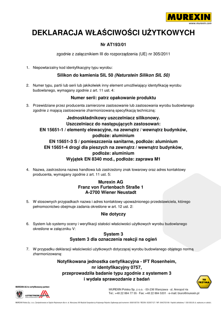 DEKLARACJA WŁAŚCIWOŚCI UŻYTKOWYCH Nr AT193/01 zgodnie z załącznikiem III do rozporządzenia (UE) nr 305/2011 1. Niepowtarzalny kod identyfikacyjny typu wyrobu: Silikon do kamienia SIL 50 (Naturstein Silikon SIL 50) 2. Numer typu, partii lub serii lub jakikolwiek inny element umożliwiający identyfikację wyrobu budowlanego, wymagany zgodnie z art. 11 ust. 4: Numer serii: patrz opakowanie produktu 3. Przewidziane przez producenta zamierzone zastosowanie lub zastosowania wyrobu budowlanego zgodnie z mającą zastosowanie zharmonizowaną specyfikacją techniczną: Jednoskładnikowy uszczelniacz silikonowy. Uszczelniacz do następujących zastosowań: EN 15651-1 / elementy elewacyjne, na zewnątrz / wewnątrz budynków, podłoże: aluminium EN 15651-3 S / pomieszczenia sanitarne, podłoże: aluminium EN 15651-4 drogi dla pieszych na zewnątrz / wewnątrz budynków, podłoże: aluminium Wyjątek EN 8340 mod., podłoże: zaprawa M1 4. Nazwa, zastrzeżona nazwa handlowa lub zastrzeżony znak towarowy oraz adres kontaktowy producenta, wymagany zgodnie z art. 11 ust. 5: Murexin AG Franz von Furtenbach Straße 1 A-2700 Wiener Neustadt 5. W stosownych przypadkach nazwa i adres kontaktowy upoważnionego przedstawiciela, którego pełnomocnictwo obejmuje zadania określone w art. 12 ust. 2: Nie dotyczy 6. System lub systemy oceny i weryfikacji stałości właściwości użytkowych wyrobu budowlanego określone w załączniku V: System 3 System 3 dla oznaczenia reakcji na ogień 7. W przypadku deklaracji właściwości użytkowych dotyczącej wyrobu budowlanego objętego normą zharmonizowaną: Notyfikowana jednostka certyfikacyjna - IFT Rosenheim, nr identyfikacyjny 0757, przeprowadziła badanie typu zgodnie z systemem 3 i wydała sprawozdanie z badań 8. W przypadku deklaracji właściwości użytkowych dotyczącej wyrobu budowlanego, dla którego wydana została europejska ocena techniczna: Nie dotyczy 9. Deklarowane właściwości użytkowe: Zasadnicze charakterystyki Reakcja na ogień Emisja substancji chemicznych niebezpiecznych dla środowiska naturalnego i zdrowia Właściwości użytkowe Klasa E NPD Odporność na spływanie ≤ 3 mm Utrata objętości ≤ 10% Właściwości mechaniczne przy rozciąganiu, po zanurzeniu w wodzie Właściwości mechaniczne przy rozciąganiu, po działaniu wody Właściwości mechaniczne przy rozciąganiu w temperaturze +23°C /-20°C Właściwości mechaniczne przy stałym rozciąganiu Właściwości adhezyjno-kohezyjne w zmiennych temperaturach Przyrost mikrobiologiczny Zharmonizowana specyfikacja techniczna NF NF EN 15651-1:2012 EN 15651-3:2012 NF NF NF 1 spełnia Trwałość 10. Właściwości użytkowe wyrobu określonego w pkt 1 i 2 są zgodne z właściwościami użytkowymi deklarowanymi w pkt 9. Niniejsza deklaracja właściwości użytkowych wydana zostaje na wyłączną odpowiedzialność producenta określonego w pkt 4. W imieniu producenta podpisał: Jürgen Becker Bernhard Mucherl Product Manager Zarząd Warszawa dn. 01.07.2014 r. 0757 Murexin AG Franz von Furtenbach Straße 1 A-2700 Wiener Neustadt 14 DOP: AT193/01 Jednoskładnikowy uszczelniacz silikonowy. Uszczelniacz do następujących zastosowań: EN 15651-1 / elementy elewacyjne, na zewnątrz / wewnątrz budynków, podłoże: aluminium EN 15651-3 S / pomieszczenia sanitarne, podłoże: aluminium EN 15651-4 drogi dla pieszych na zewnątrz / wewnątrz budynków, podłoże: aluminium Wyjątek EN 8340 mod., podłoże: zaprawa M1 Reakcja na ogień: Klasa E Emisja substancji chemicznych niebezpiecznych dla środowiska naturalnego i zdrowia: NPD Odporność na spływanie: ≤ 3 mm Utrata objętości : ≤ 10% Właściwości mechaniczne przy rozciąganiu, po zanurzeniu w wodzie: NF Właściwości mechaniczne przy rozciąganiu, po działaniu wody: NF Właściwości mechaniczne przy rozciąganiu w temperaturze +23°C / -20°C: NF Właściwości mechaniczne przy stałym rozciąganiu: NF Właściwości adhezyjno-kohezyjne w zmiennych temperaturach: NF Przyrost mikrobiologiczny: 1 Trwałość: spełnia Silikon do kamienia SIL 50